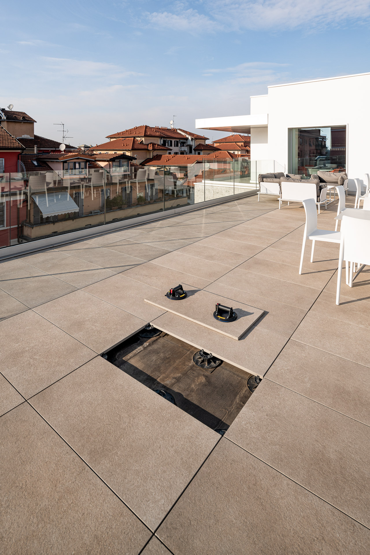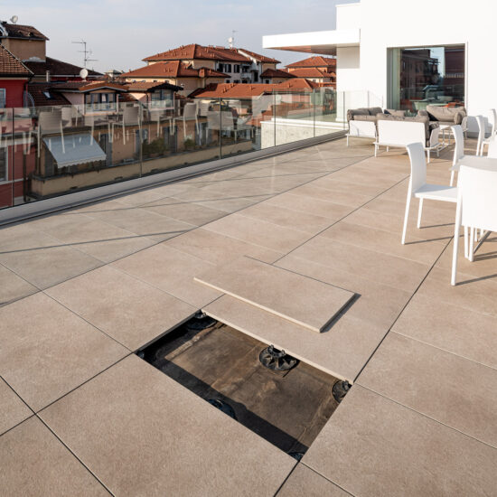 El pavimento sobreelevado para exterior es un sistema de construcción sumamente versátil que se puede colocar en todo tipo de pavimentación; está formado por una superficie transitable de gres y un sustrato ligero y práctico. Es posible retirar cada uno de los módulos cerámicos fácilmente en cualquier momento, lo que simplifica las operaciones de inspección, modificación y mantenimiento de las redes de instalaciones.
