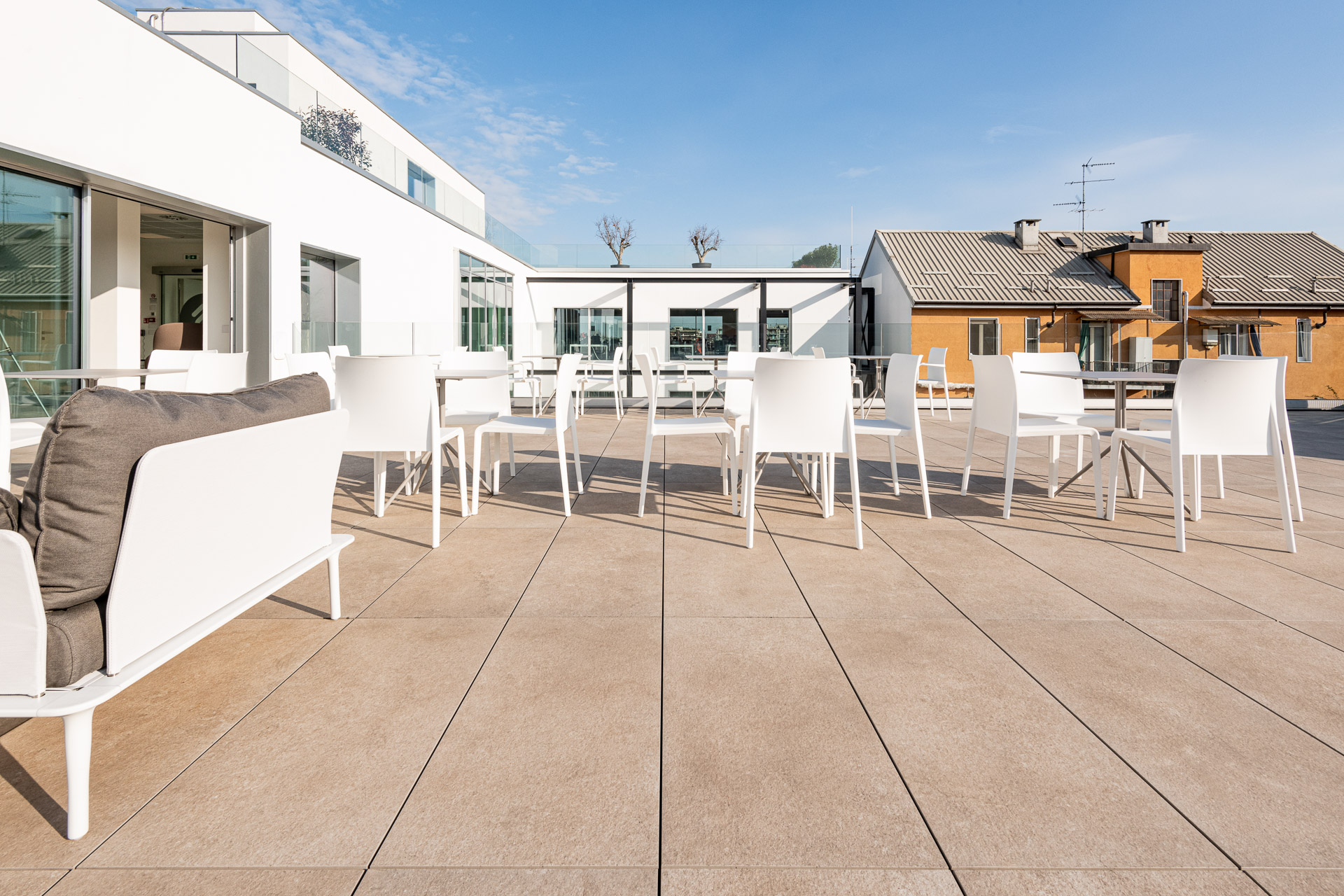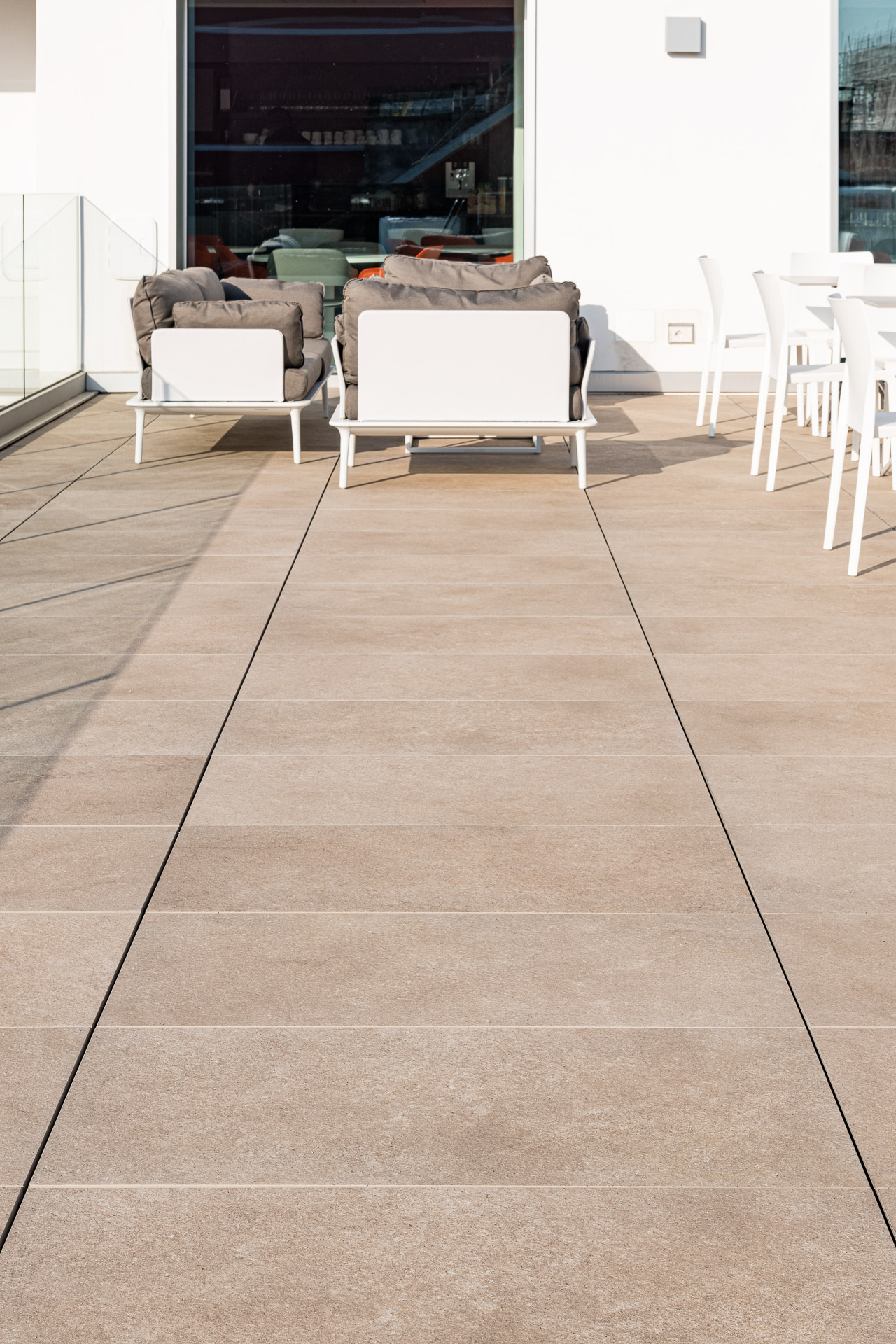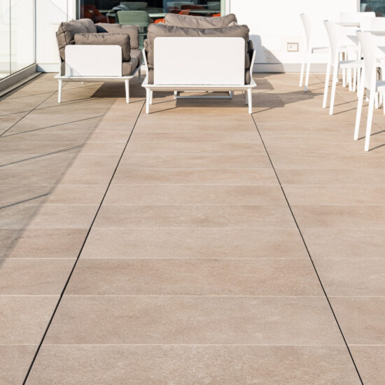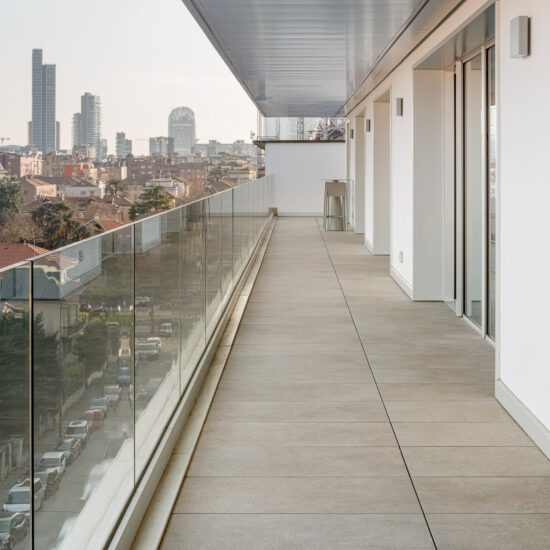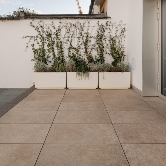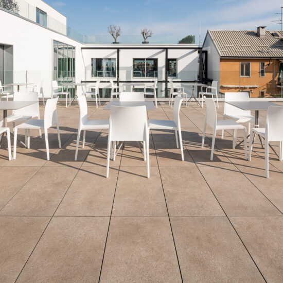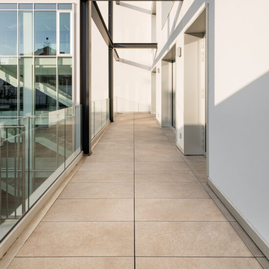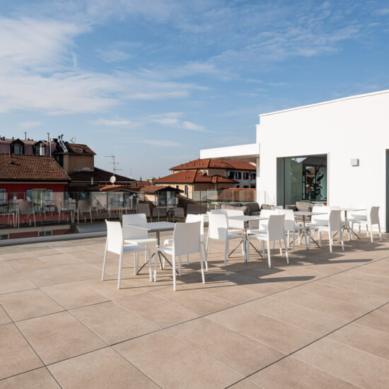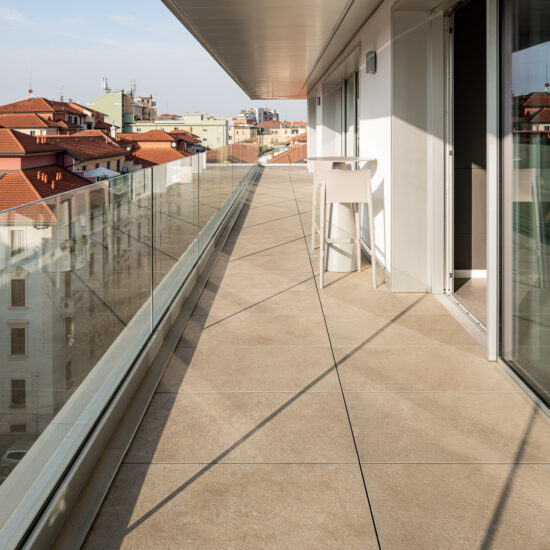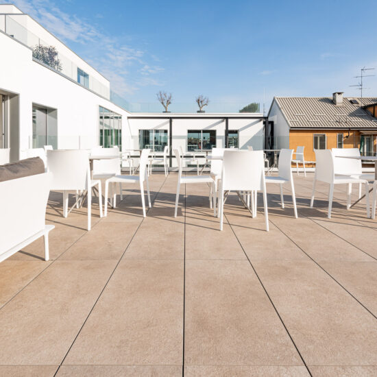 En las terrazas de las plantas cuarta y quinta los proyectistas han decidido utilizar el sistema del pavimento sobreelevado con la colección de gres porcelánico de imitación de la piedra Realstone_Jerusalem XT20 de color Noce en el formato de 50 x 100 cm.