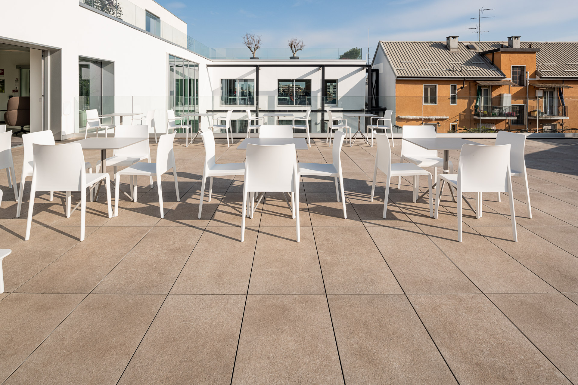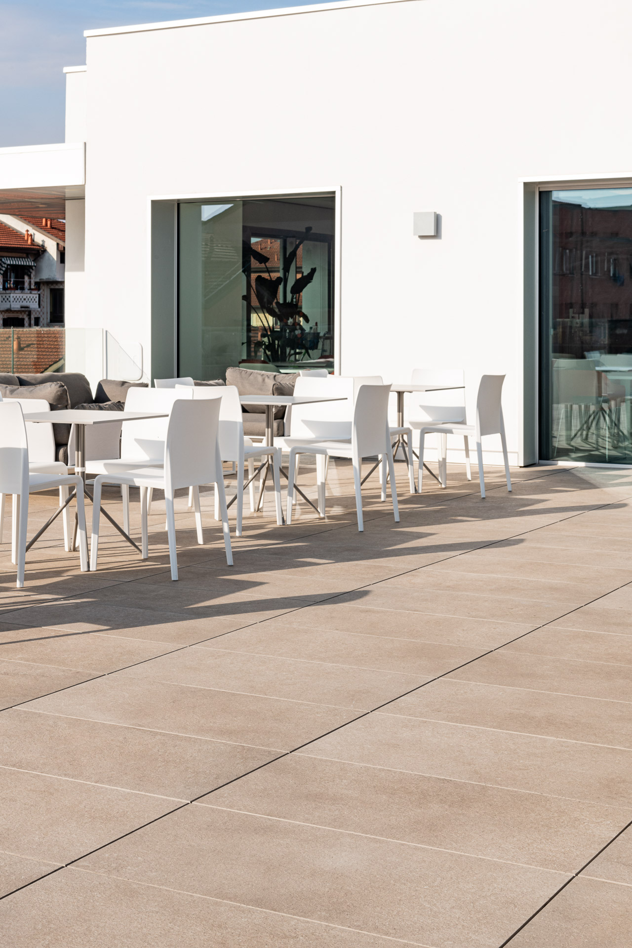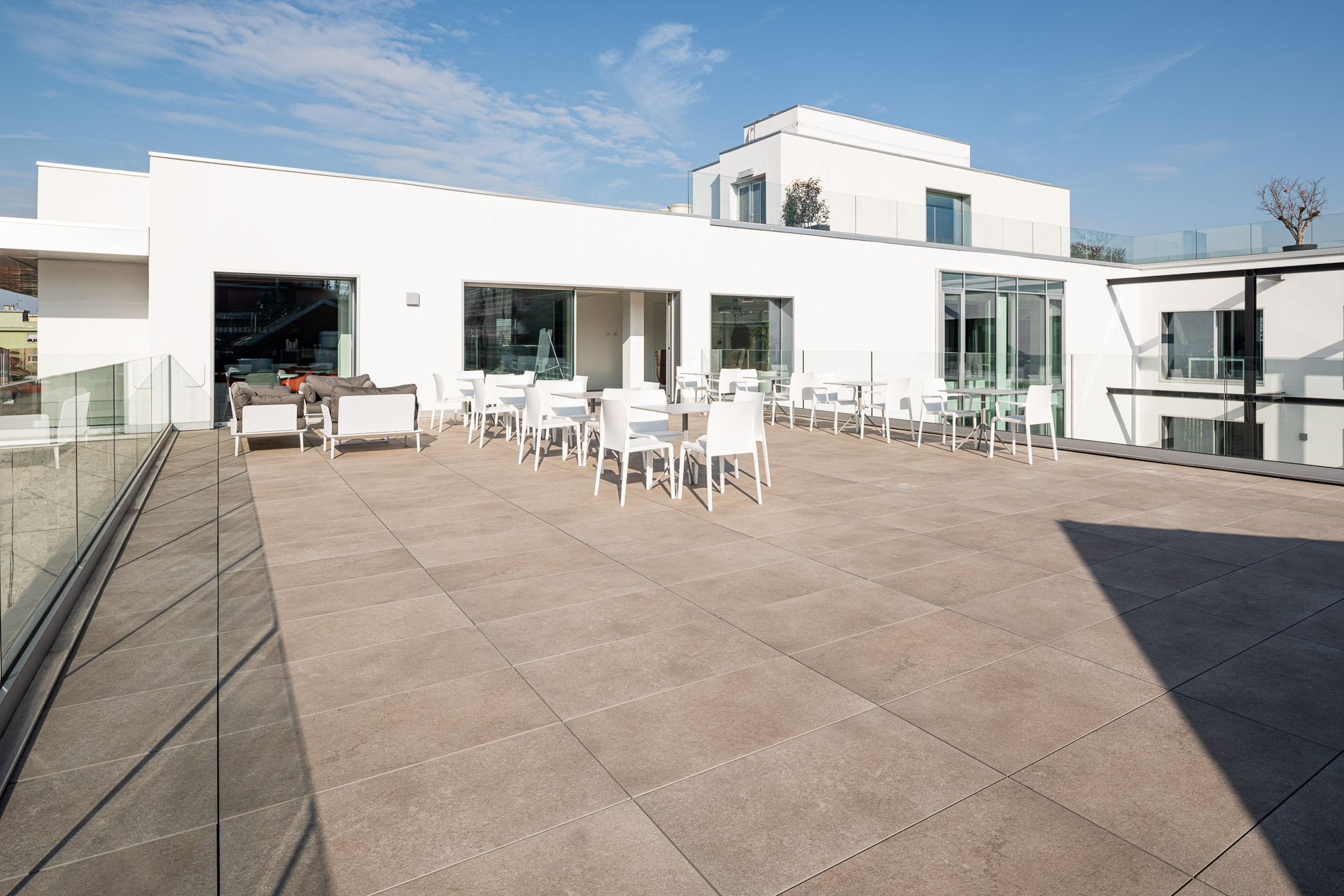 En las terrazas de las plantas cuarta y quinta los proyectistas han decidido utilizar el sistema del pavimento sobreelevado con la colección de gres porcelánico de imitación de la piedra Realstone_Jerusalem XT20 de color Noce en el formato de 50 x 100 cm.