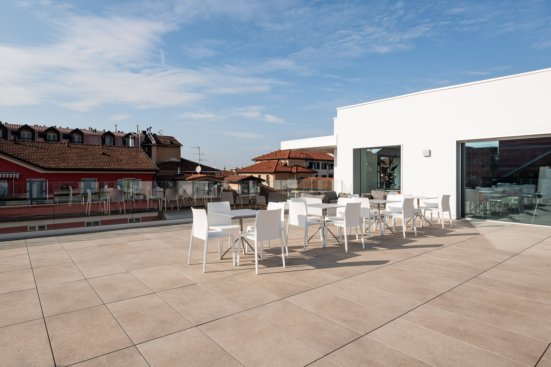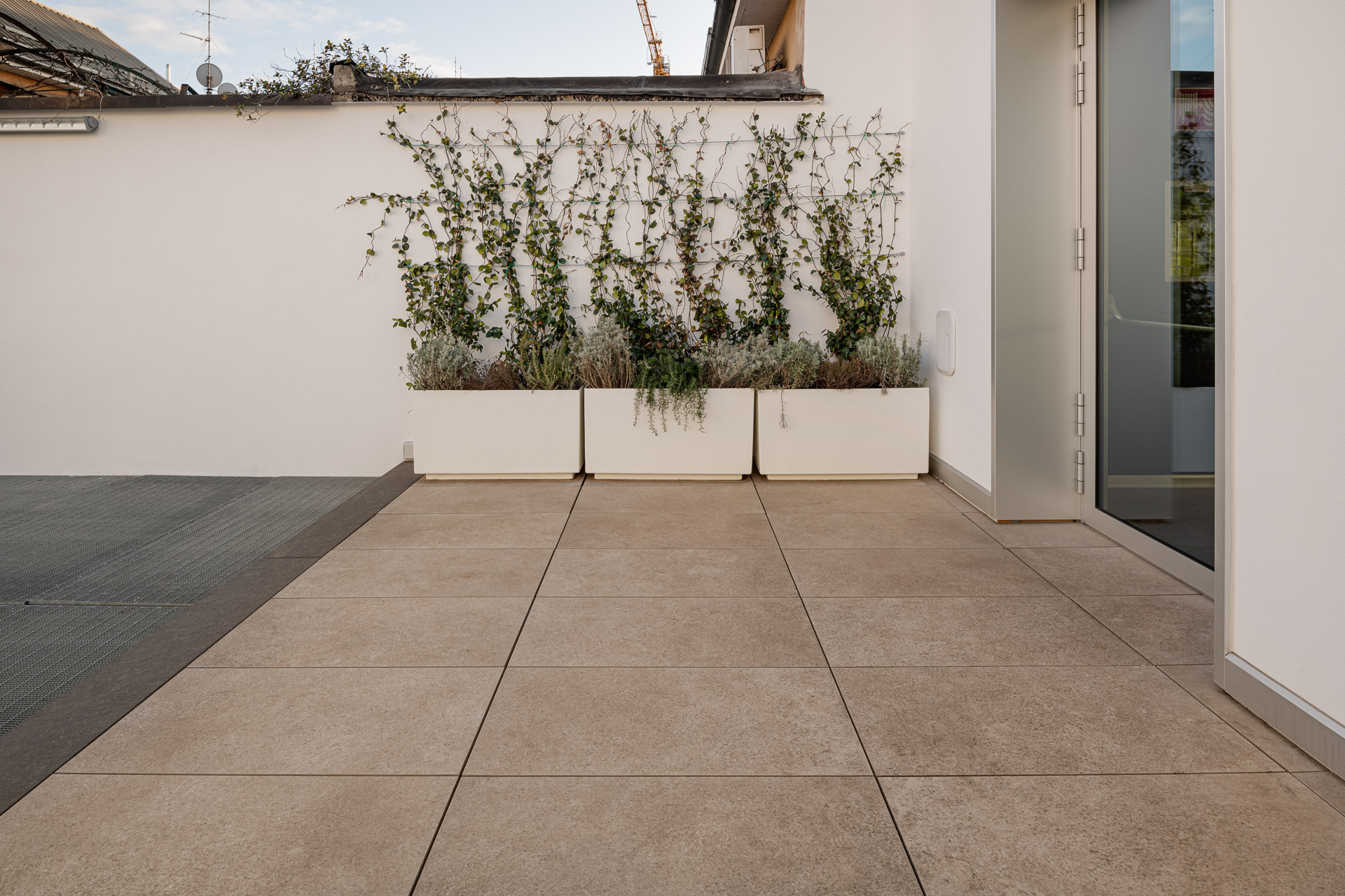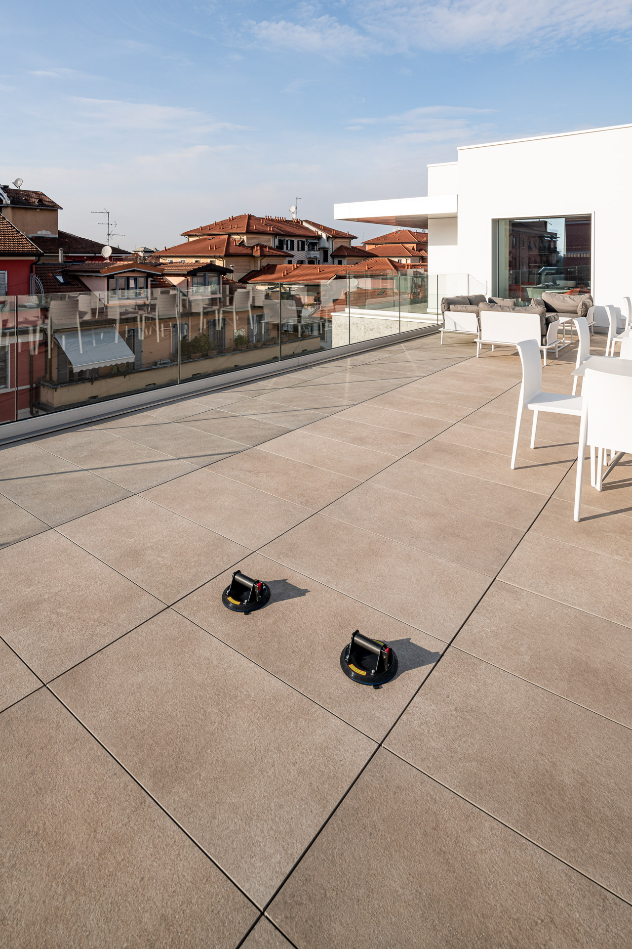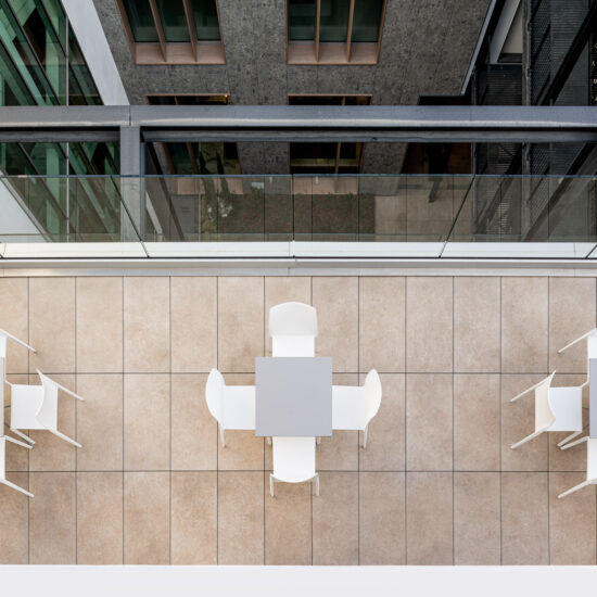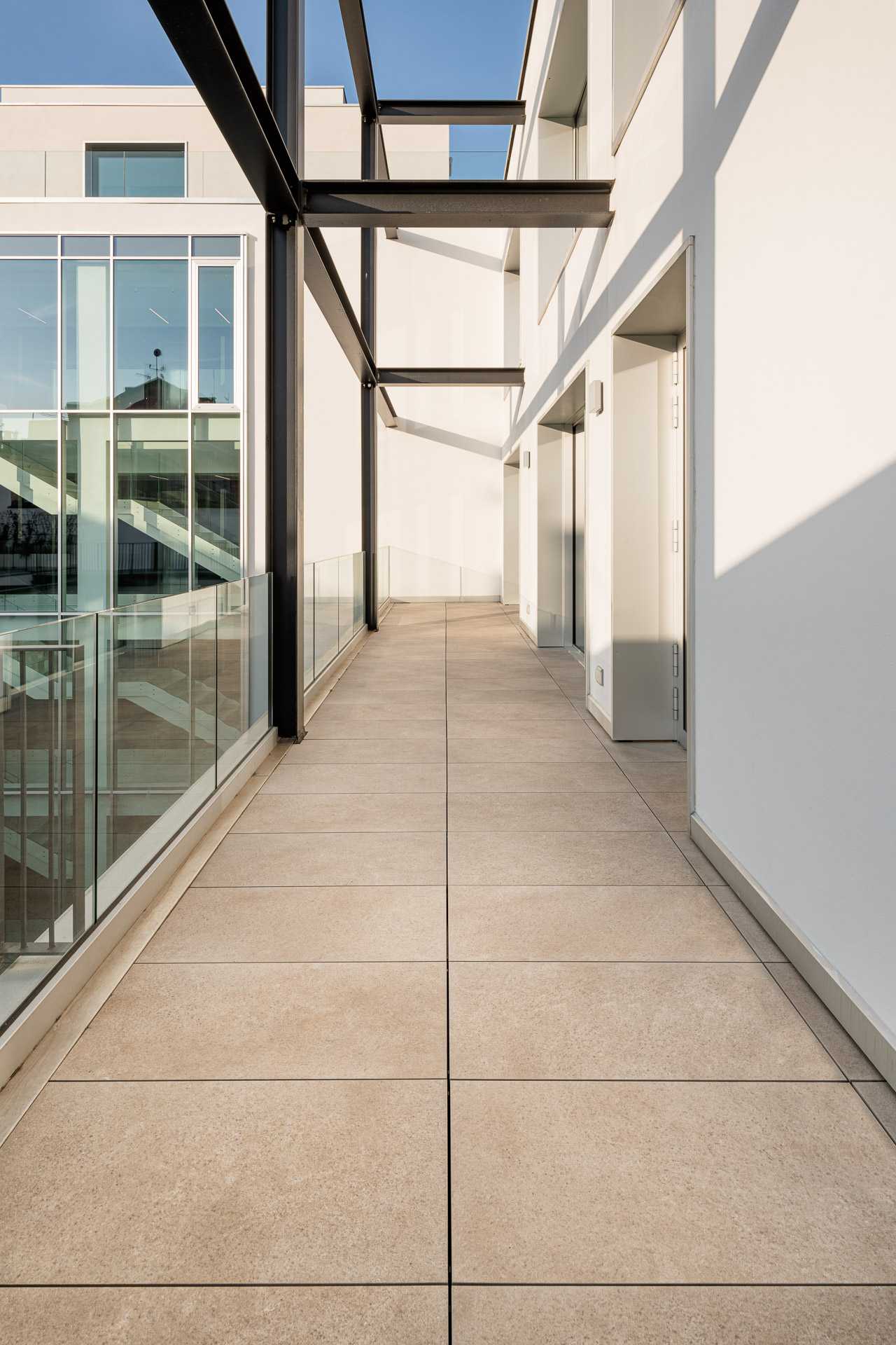 En las terrazas de las plantas cuarta y quinta los proyectistas han decidido utilizar el sistema del pavimento sobreelevado con la colección de gres porcelánico de imitación de la piedra Realstone_Jerusalem XT20 de color Noce en el formato de 50 x 100 cm.