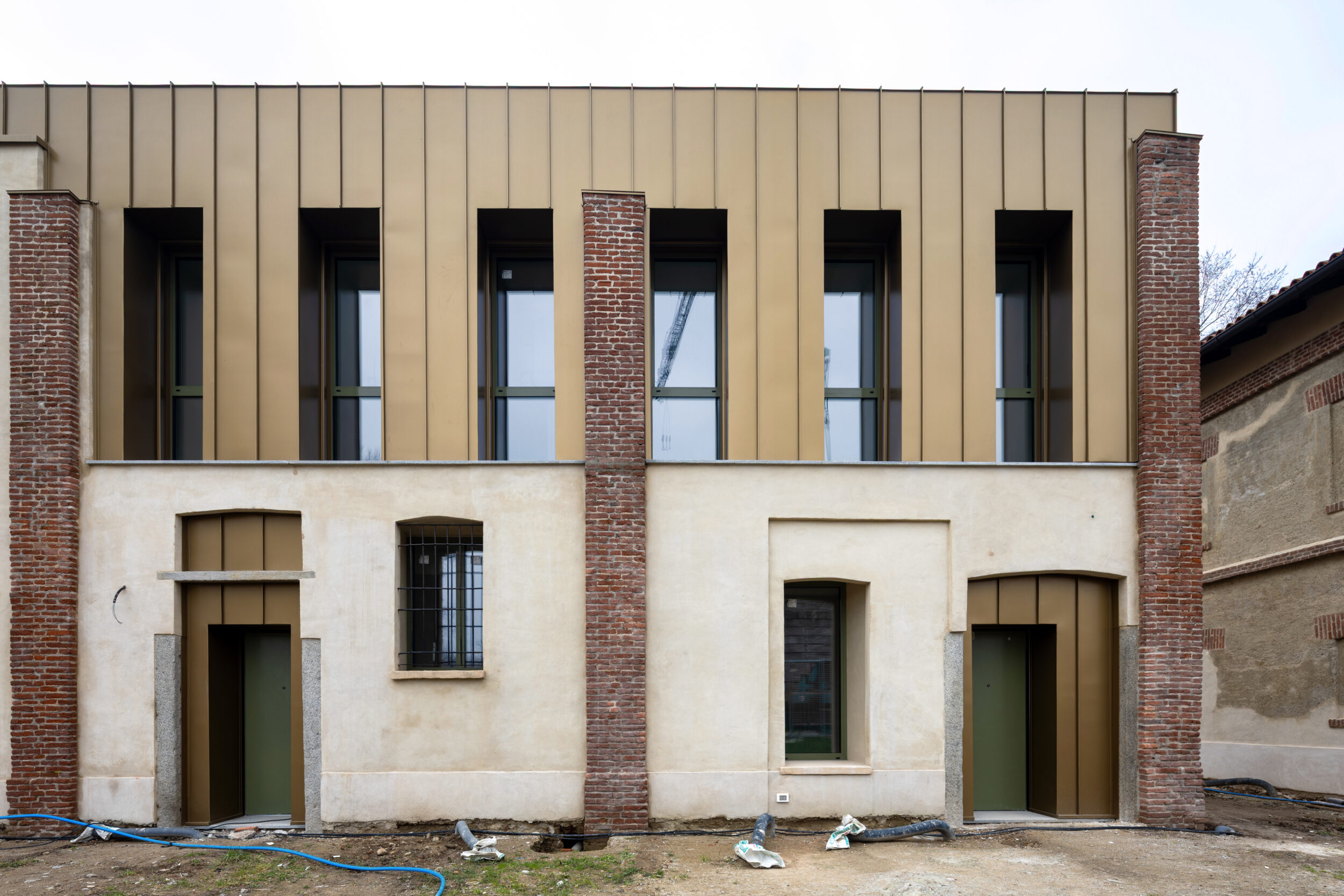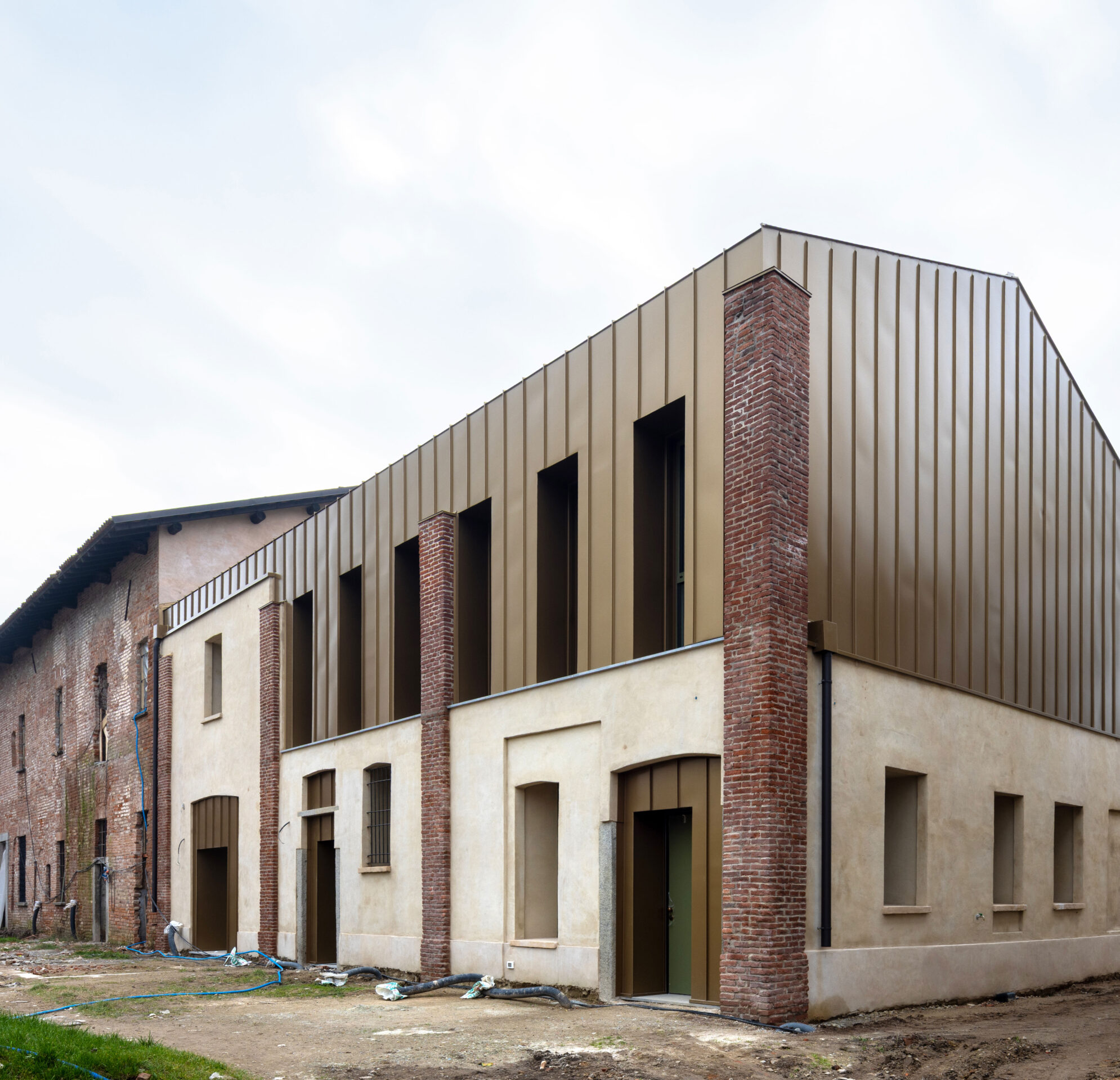 La cascina, organizada en torno a un amplio patio central —actualmente aún propiedad del Ayuntamiento de Milán y, por tanto, no objeto del proyecto de rehabilitación—, mantiene la impronta de la estructura histórica y su evolución a lo largo de los siglos, sobre la cual hemos trabajado integrándola con soluciones modernas. No una limitación, sino la oportunidad de repensar esa espacialidad que confirma su modernidad. Internamente, los espacios se han distribuido para albergar una posada solidaria, salas polivalentes para eventos culturales y formativos, casa-familia, comunidad para menores y para solicitantes de asilo, y una residencia inclusiva, además de áreas dedicadas a asociaciones y talleres creativos. La distribución de las plantas tuvo como objetivo crear un equilibrio entre lugares de encuentro, acogida y cultura, convirtiendo la cascina en un punto de referencia para la comunidad local y un símbolo de inclusión e innovación.