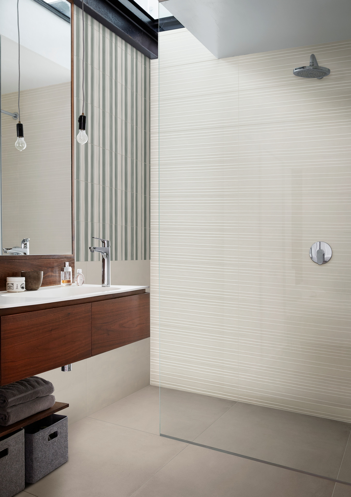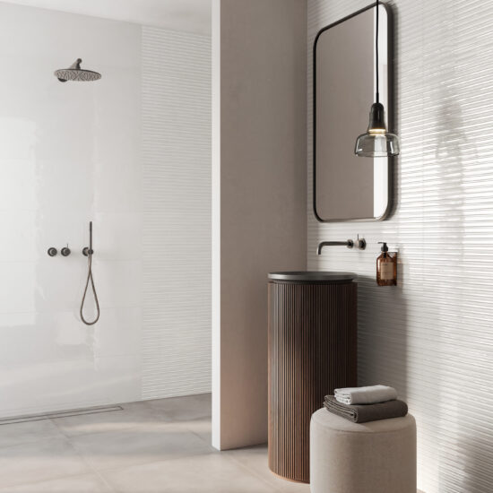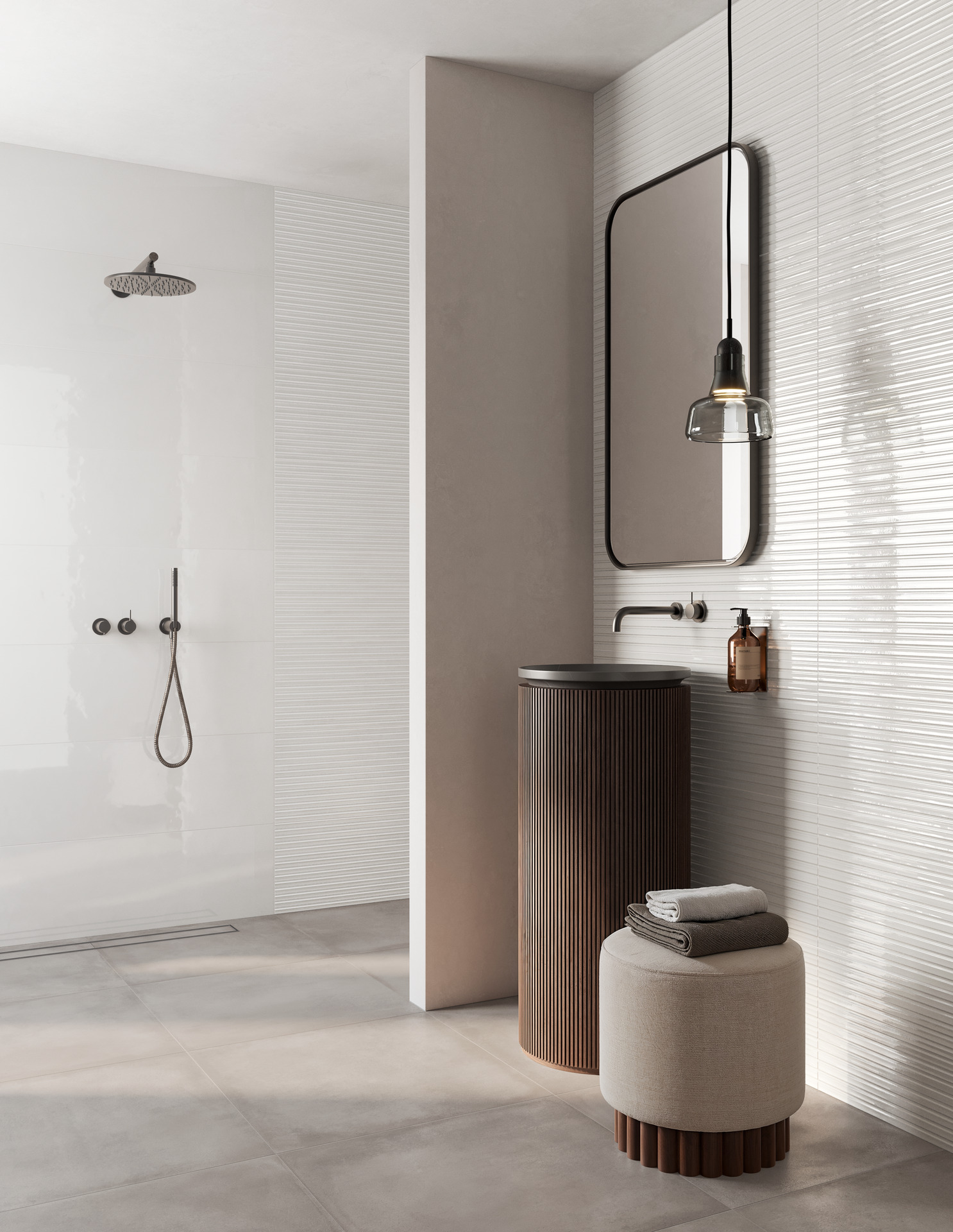 Las colecciones de Ragno ofrecen distintas opciones en formatos grandes, como la colección Off, que propone azulejos de 30 x 90 cm, ideales para conseguir un aspecto uniforme y sofisticado. Las placas grandes permiten crear superficies continuas, con un resultado estético depurado y elegante, perfecto para los baños modernos que apuestan por lo sencillo y lo esencial.