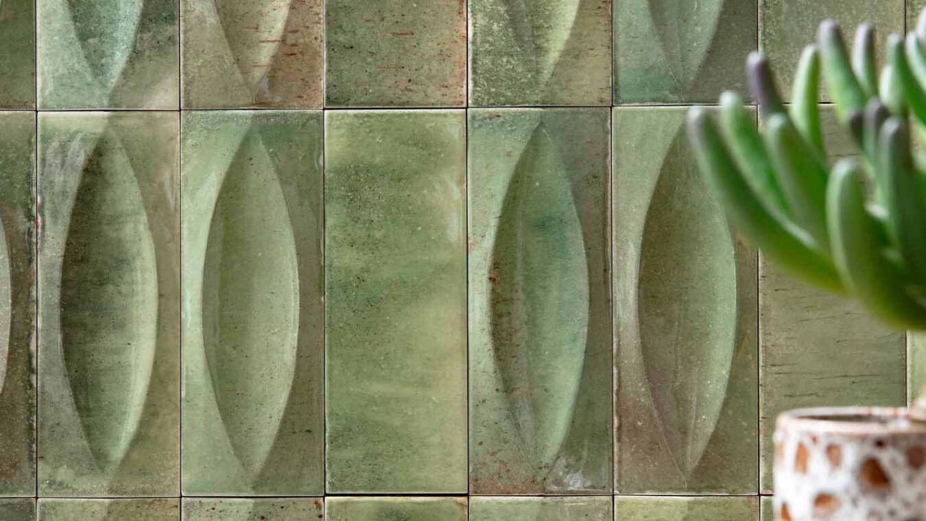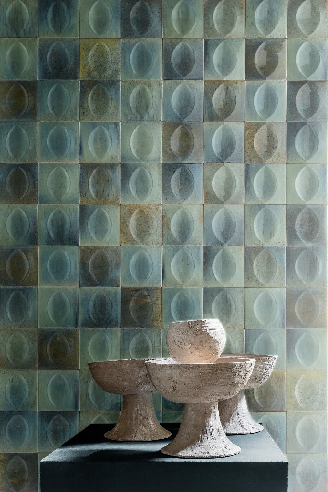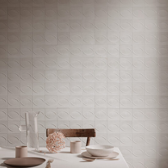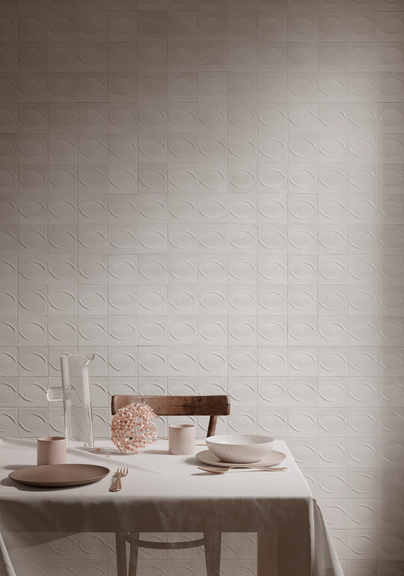 La colección presenta superficies superbrillantes de gres porcelánico con una paleta de colores con matices decididos —Bianco, Beige, Turchese, Giada y Grigio— y se articula en tres formatos diferentes (10×10, 5×15 y 7,5×20 cm), modulares y combinables entre sí, con bordes rectos, para crear soluciones de colocación novedosas a las que también contribuyen las estructuras tridimensionales Egg y Eye.