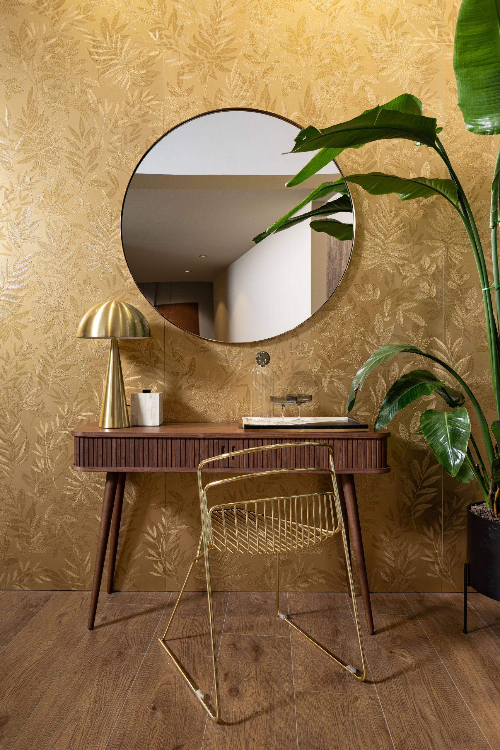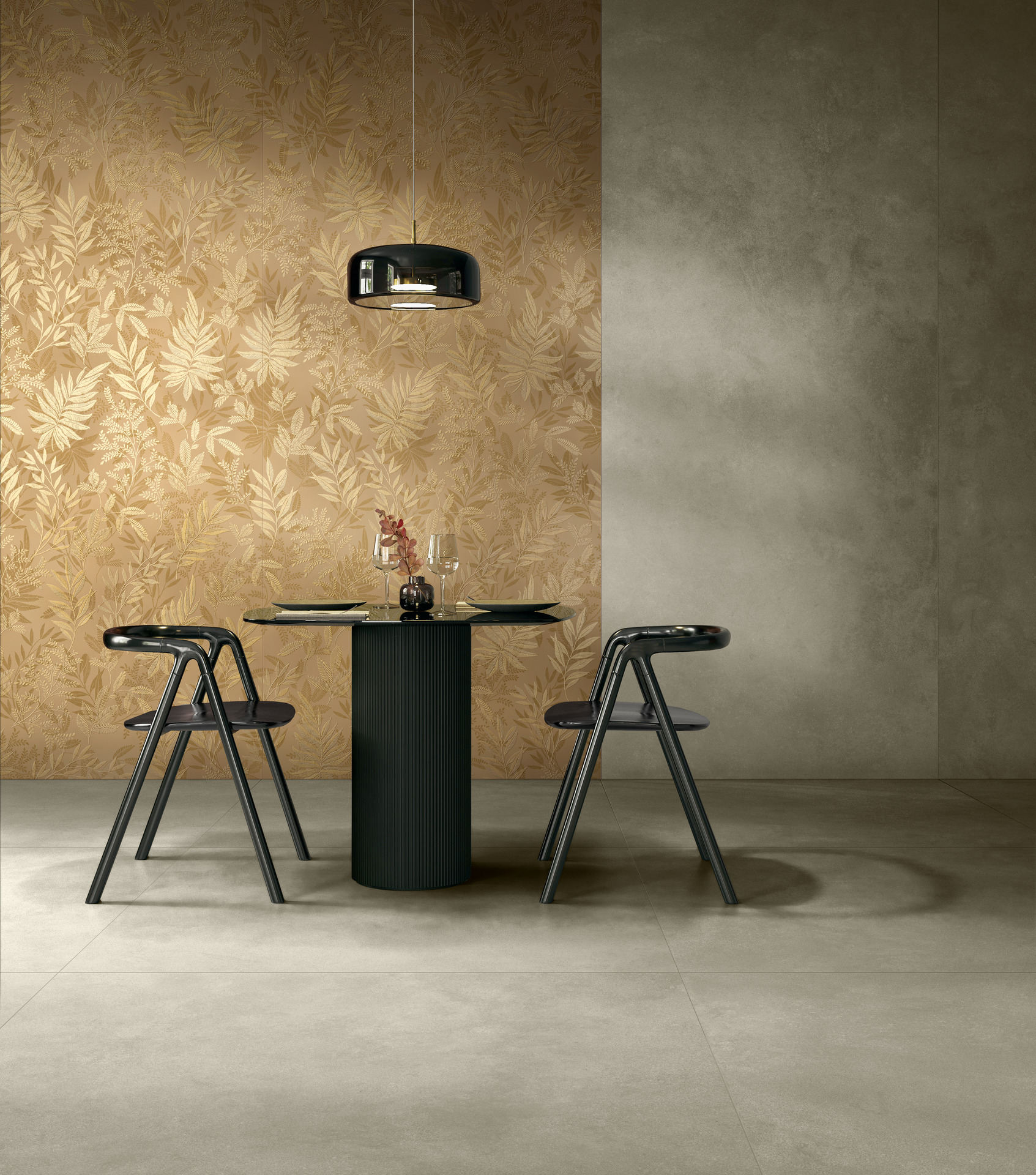 Varias pasadas de pigmentos, color y acabados aportan movimiento y grosor a la superficie de la placa, cuya doradura se realiza utilizando pigmentos metálicos aptos para la inclusión en el ciclo de producción de las placas de gres porcelánico. El acabado glossy a base de agua garantiza el brillo y la reflectividad de la superficie al final del proceso.