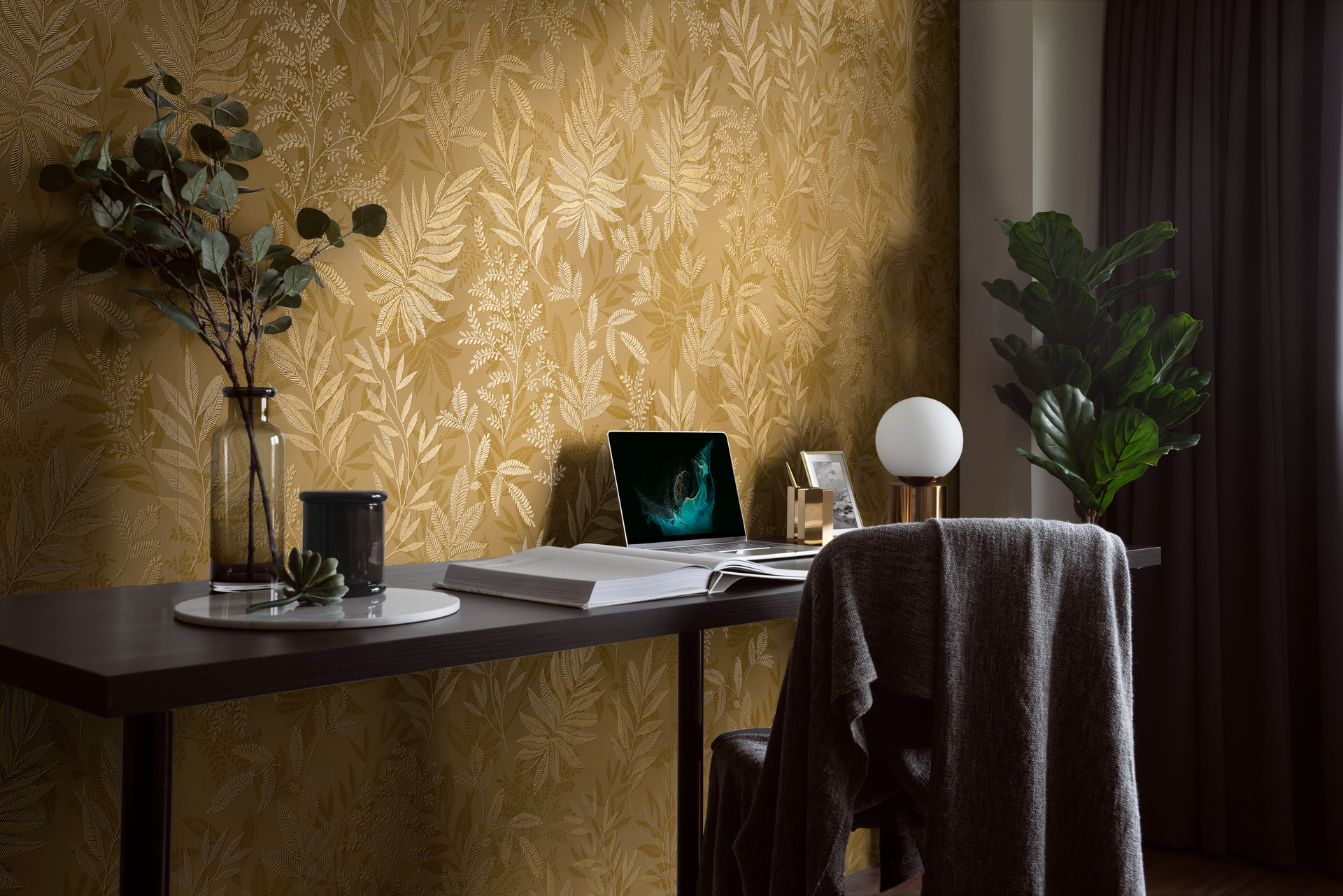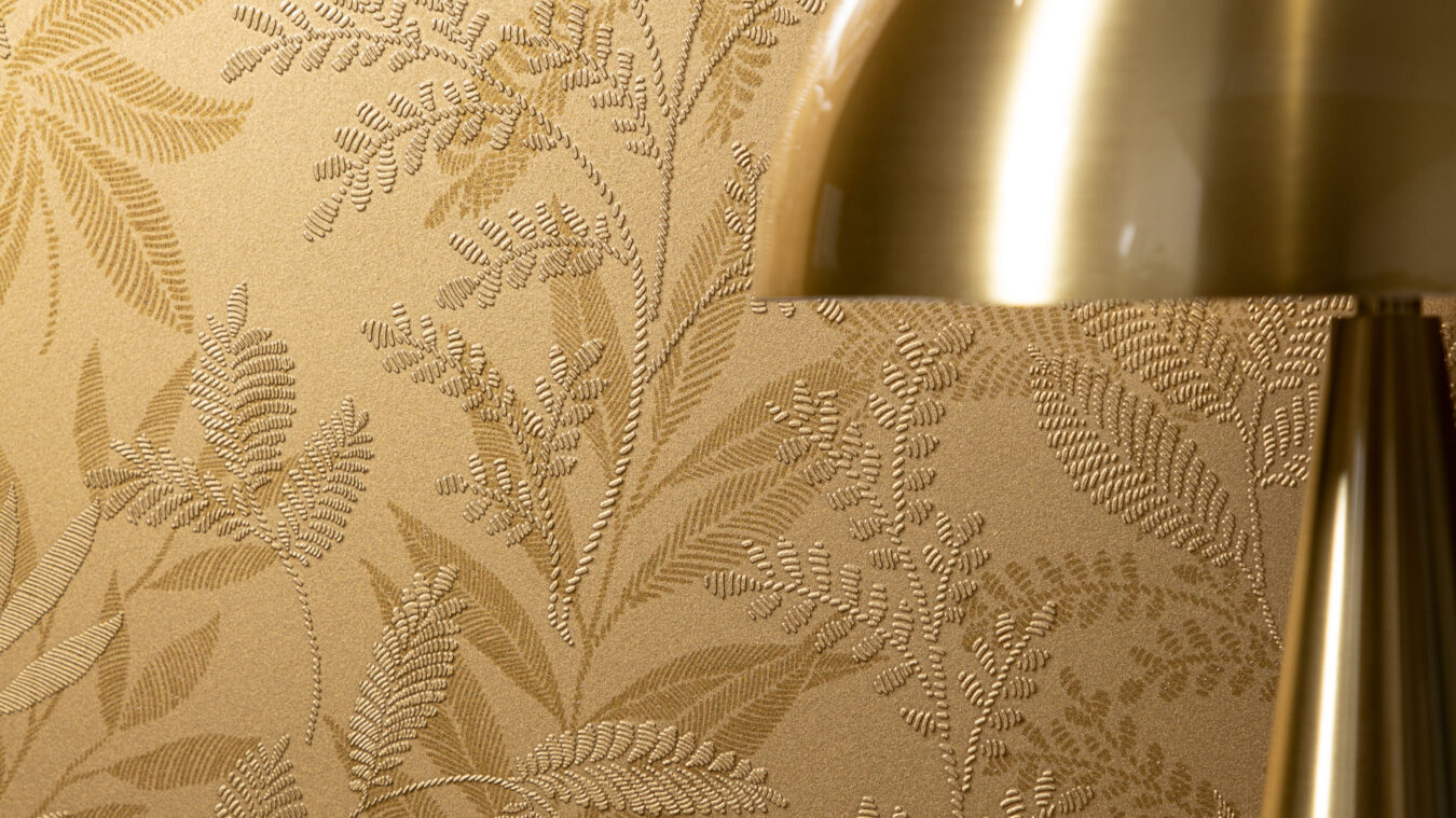 Empezando por la elección de las hojas como tema dominante, el motivo se ha reinterpretado y diseñado a mano con elegancia y sofisticación, respetando determinados parámetros en las tramas, los trazos y el espaciado.