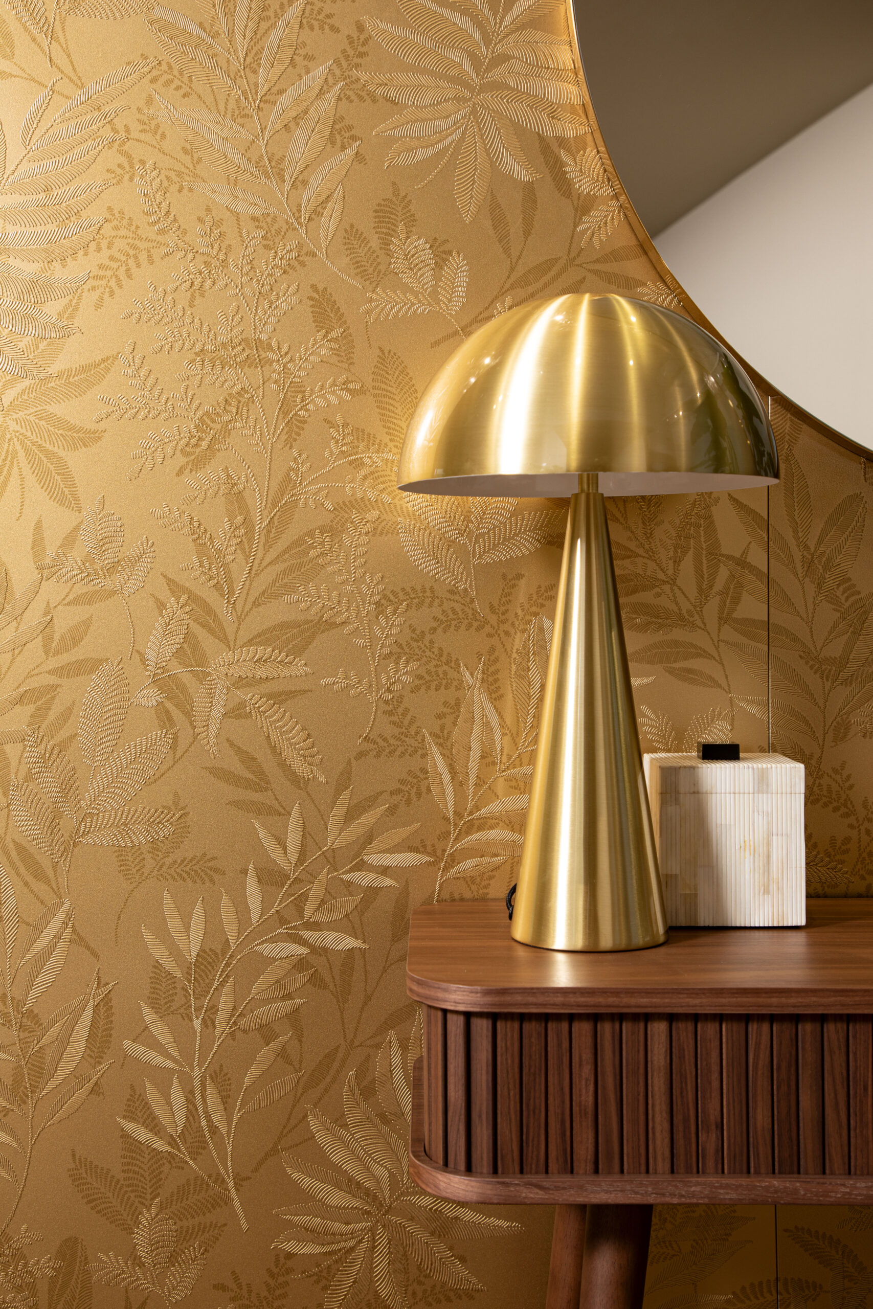 El distintivo acabado en oro de la superficie nace de un estudio sobre la antigua técnica de la hoja o pan de oro, utilizada en ámbito artístico, artesanal y arquitectónico para decorar piezas y superficies con láminas sutilísimas de oro puro en aleación con otros metales preciosos.
