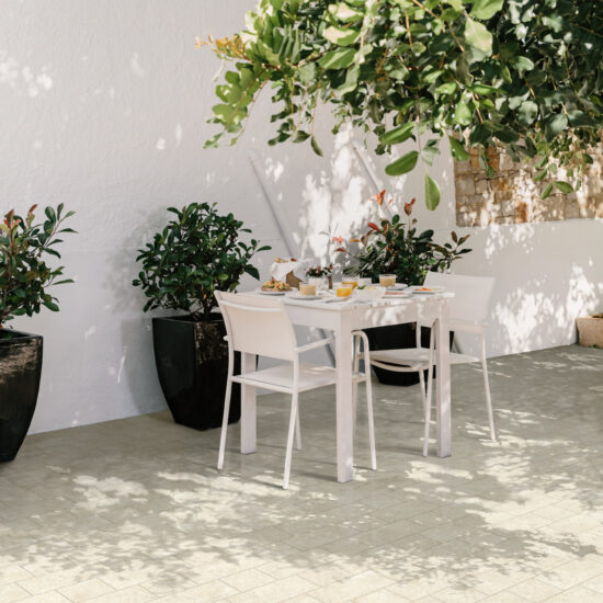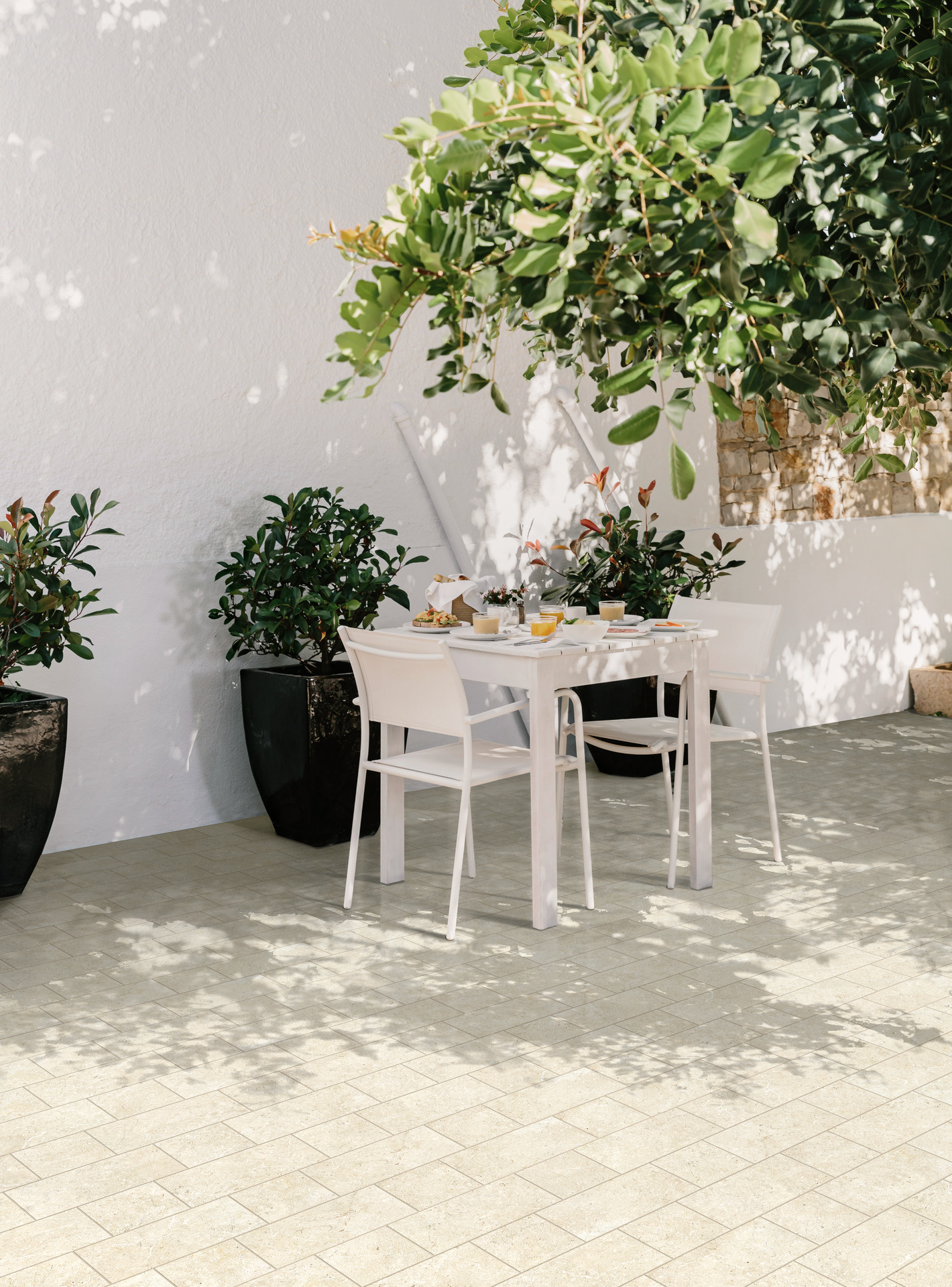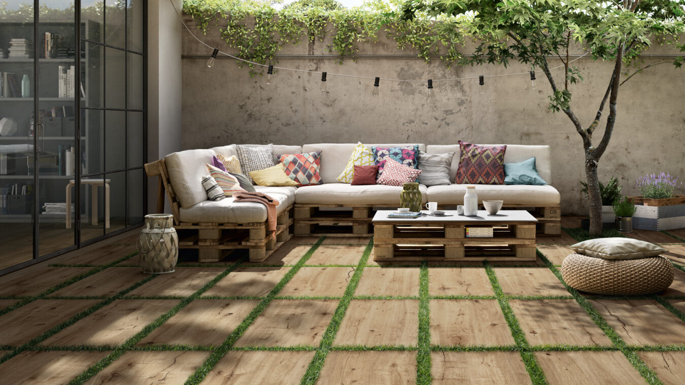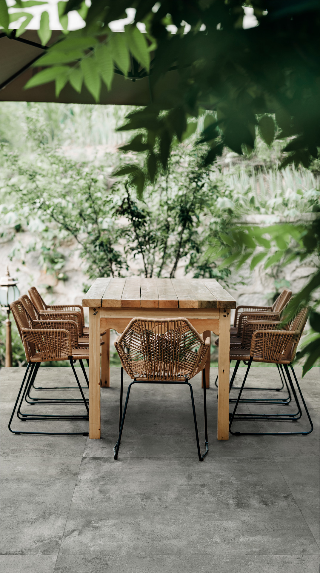 El gres porcelánico para exteriores es un valioso aliado a la hora de diseñar estas zonas funcionales: puede utilizarse para pavimentar la zona de comedor o de descanso, dejando el resto del espacio a la vegetación, o bien para crear una plataforma elevada que resalte la zona de estar. Las superficies continuas y las texturas de imitación de la piedra, el cemento o la madera permiten decorar pequeños espacios exteriores de forma coordinada y coherente, transformando cada metro cuadrado en una oportunidad de diseño. Representa una estrategia excelente si estás buscando ideas para decorar un pequeño jardín con un estilo cuidado, sin renunciar al confort y la funcionalidad.