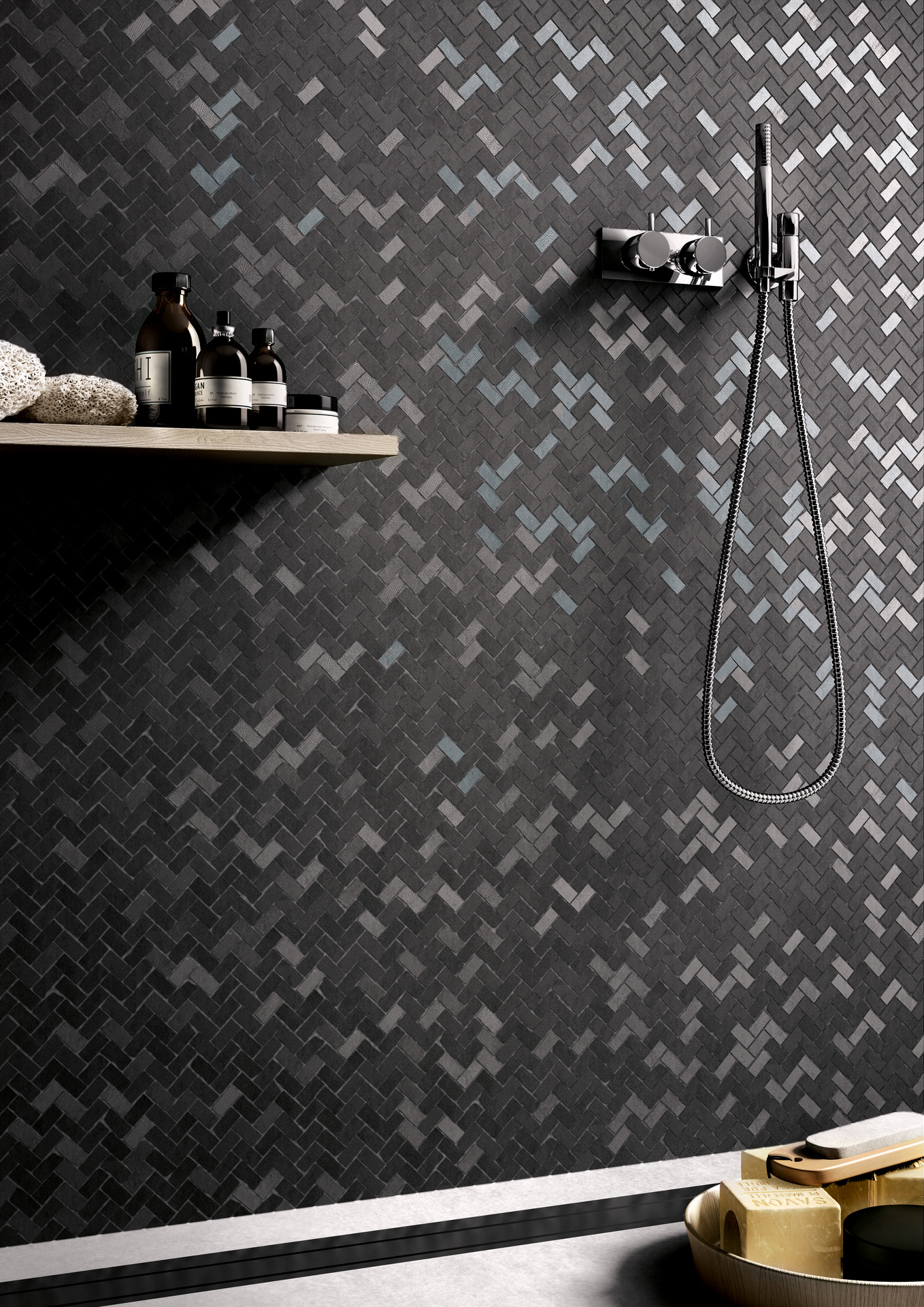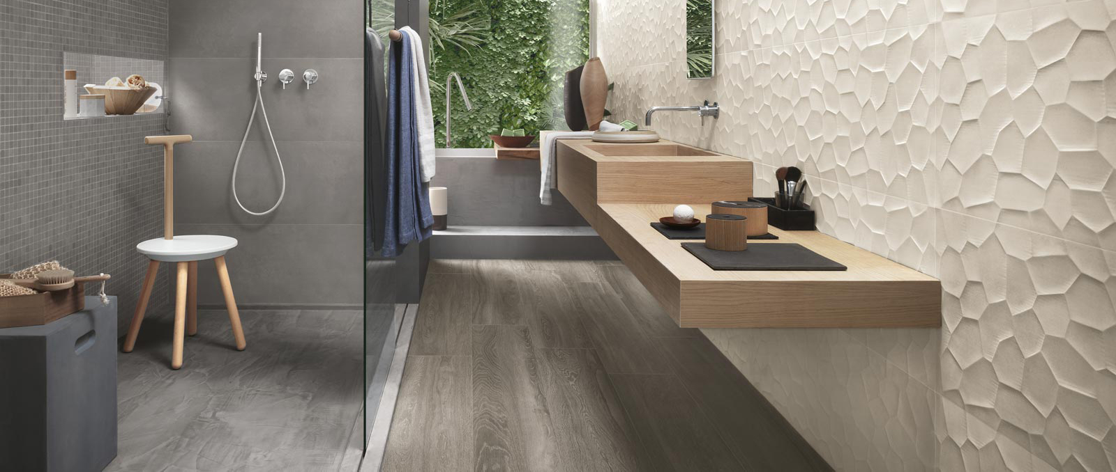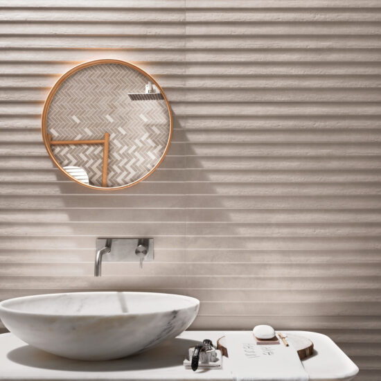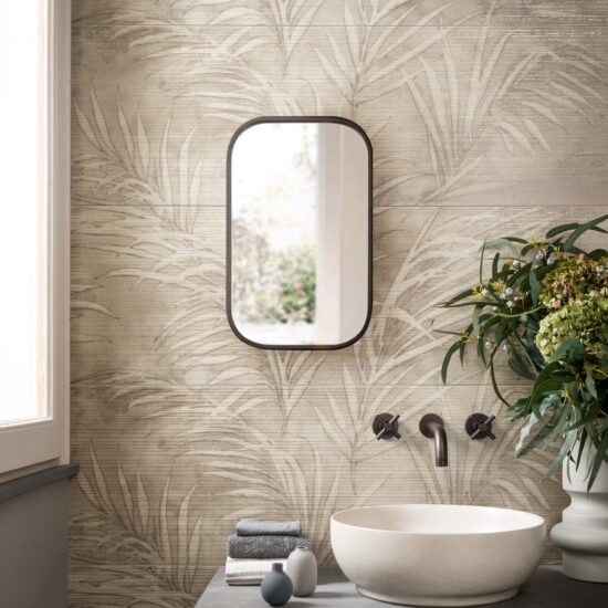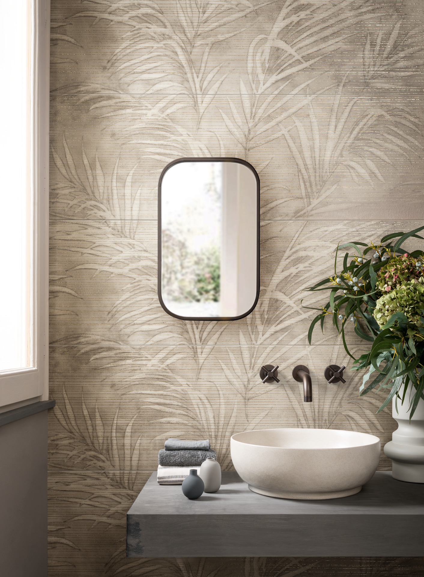 Elegantes juegos de luz con superficies de efecto mosaico ‘tono sobre tono’, decoraciones de hojas que parecen papel pintado y el formato grande para crear superficies matéricas continuas: estos son los elementos de la colección Tactile. Los espacios son refinados, al ámbito se le confiere profundidad y dinamismo gracias a superficies de efecto sedoso y a unas delicadas pasadas “epidérmicas”.
