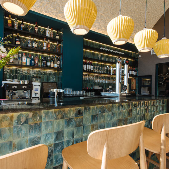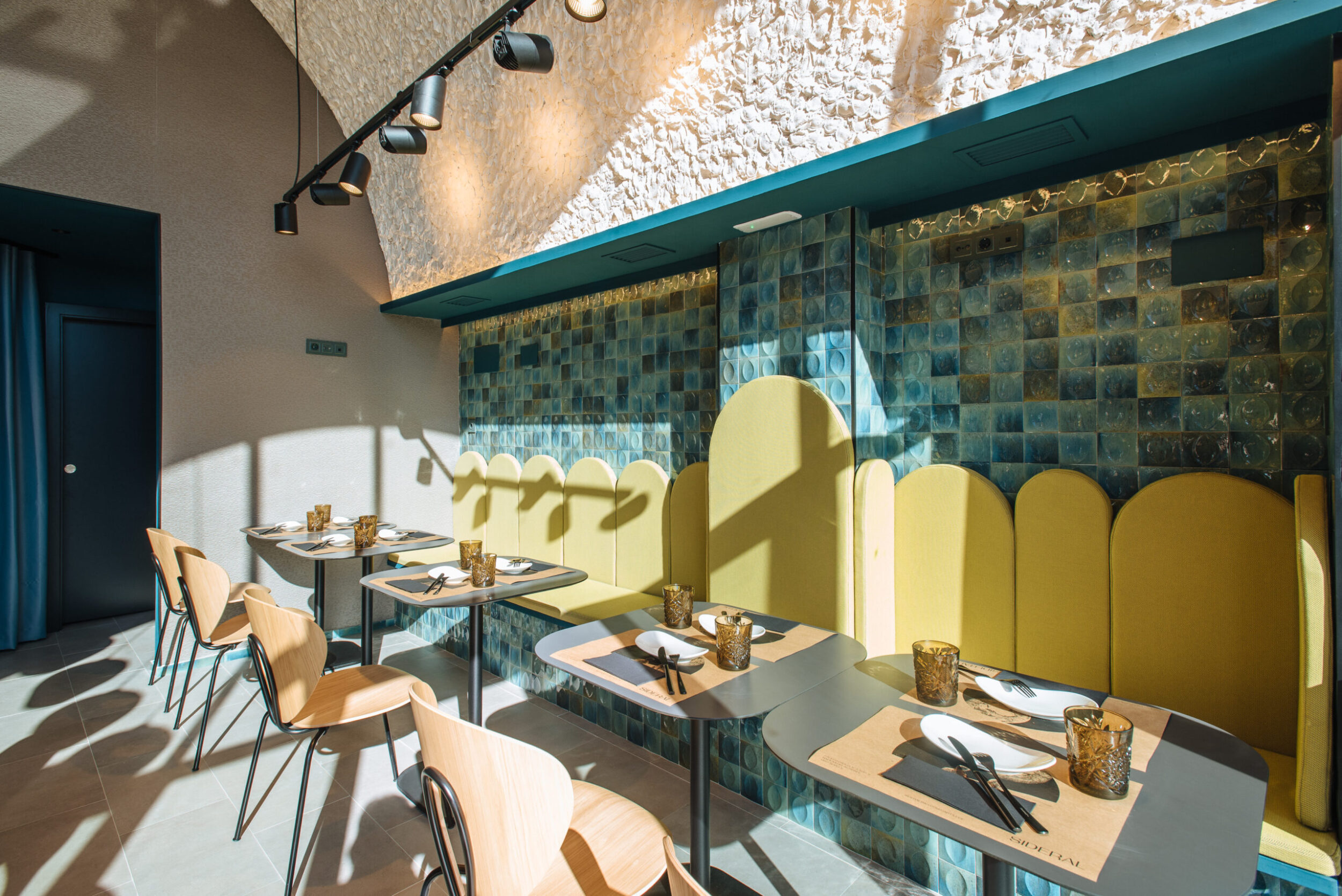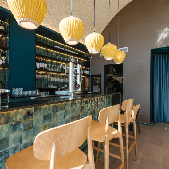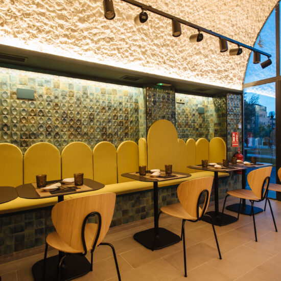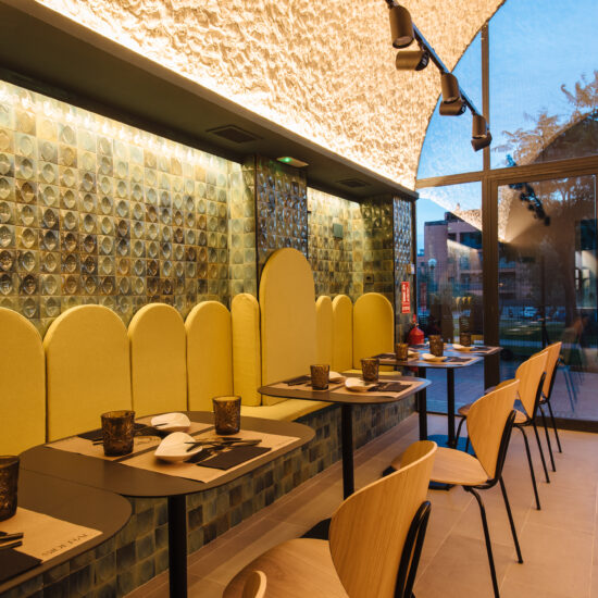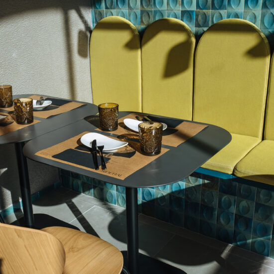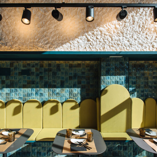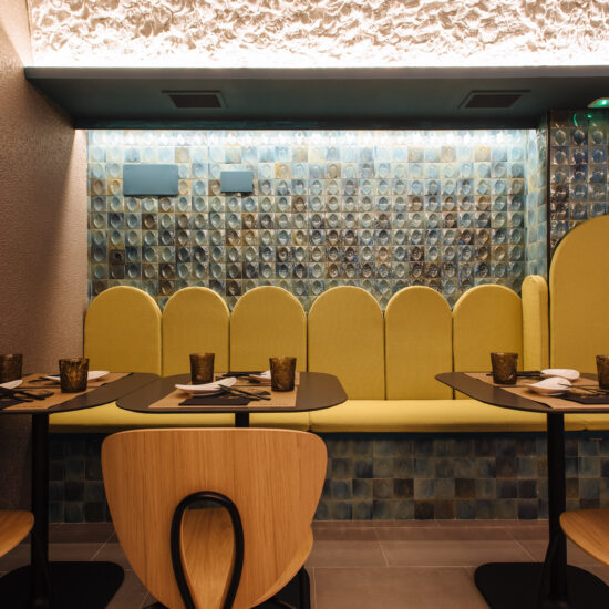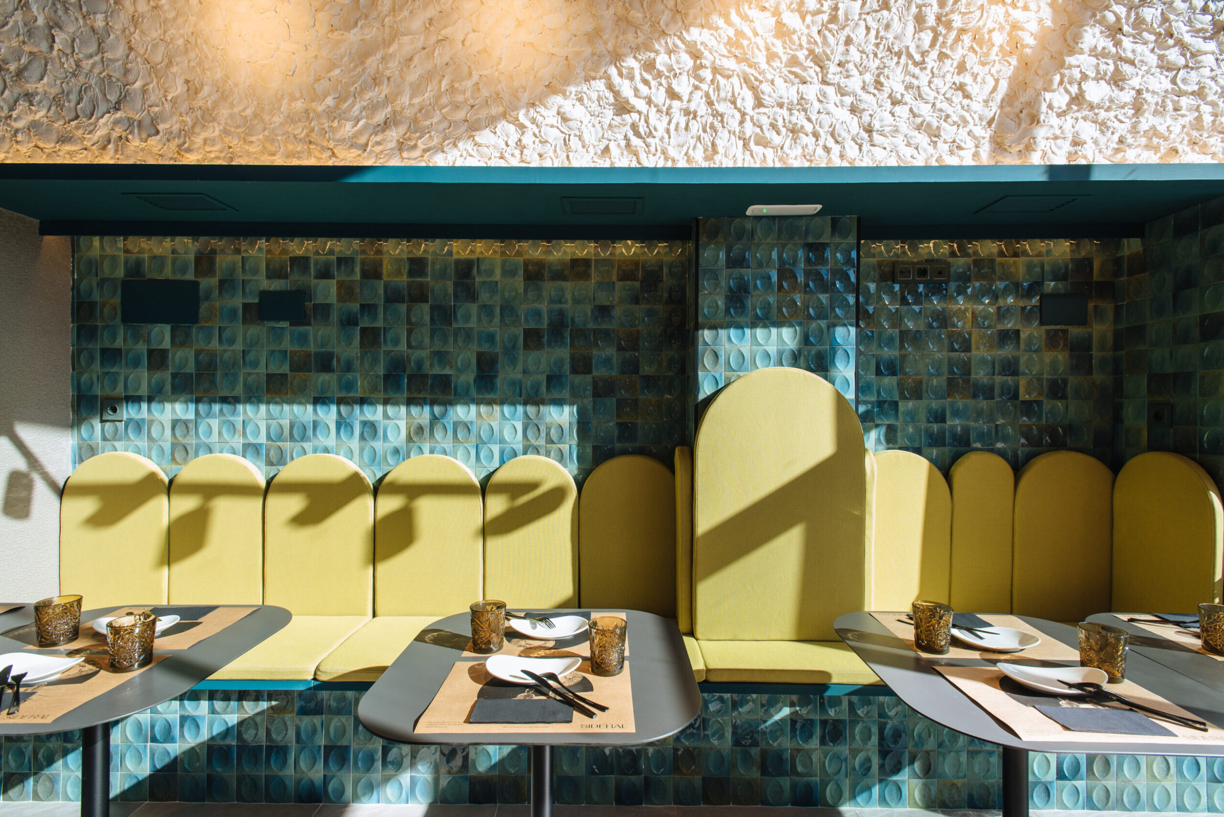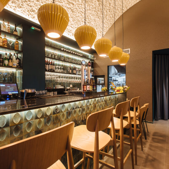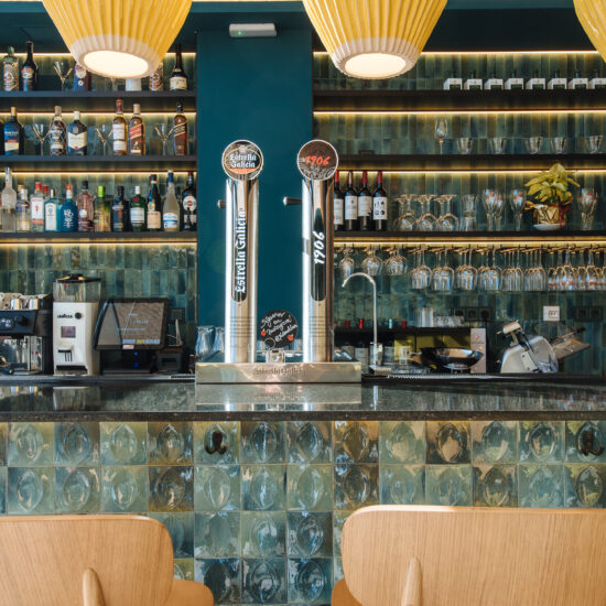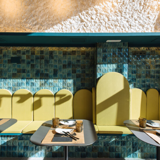 Los proyectistas han elegido Gleeze Turchese con acabado Glossy en la versión de 7×20 cm para los nichos del bar y Gleeze estructura Egg, de color Turchese pero en formato de 10×10 cm, para realzar la superficie de la barra principal y la pared de la zona de mesas. Los reflejos producidos por los azulejos cóncavos y convexos de la versión Egg Glossy en la barra del bar multiplican los juegos de luz y acentúan la textura de las superficies verticales.