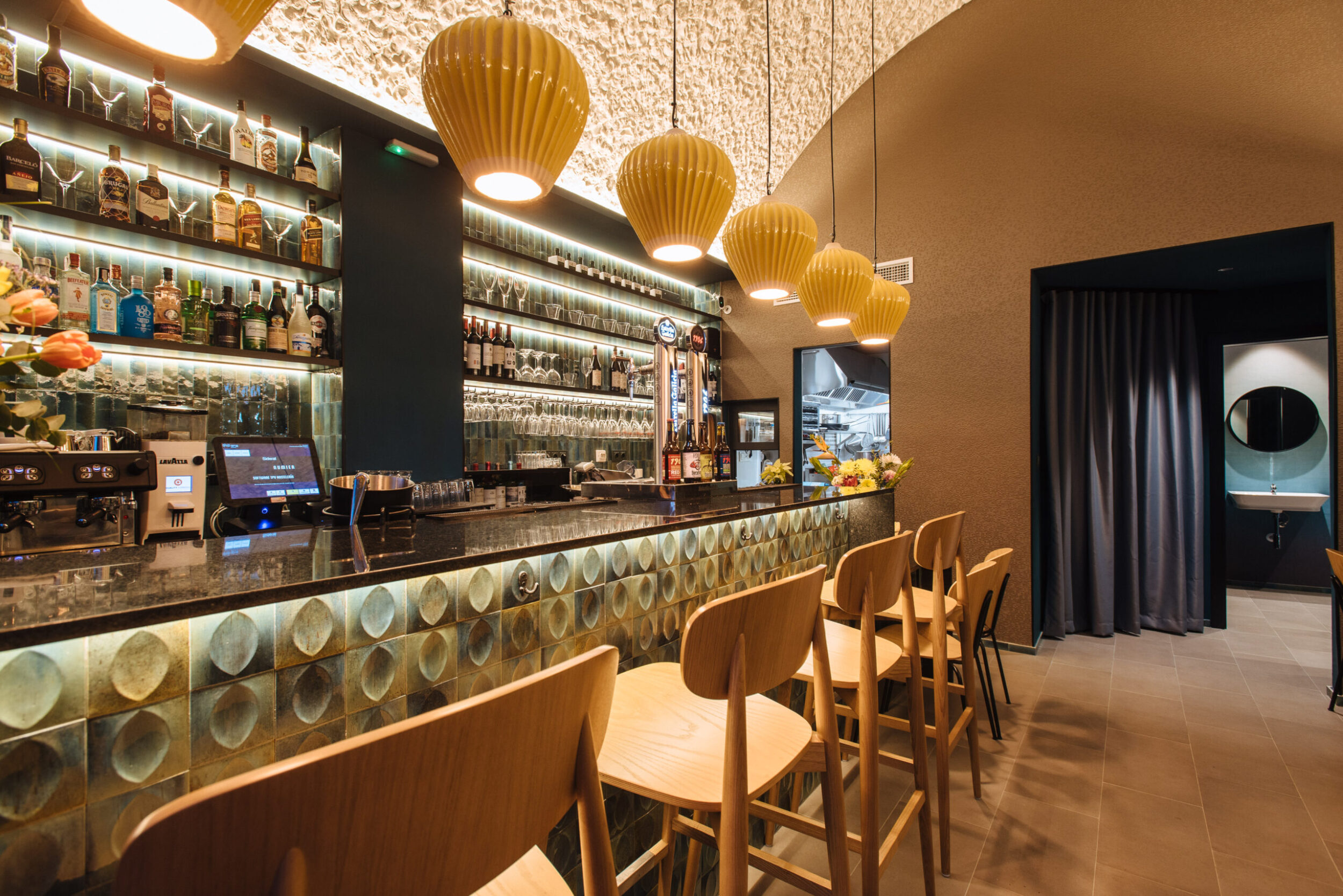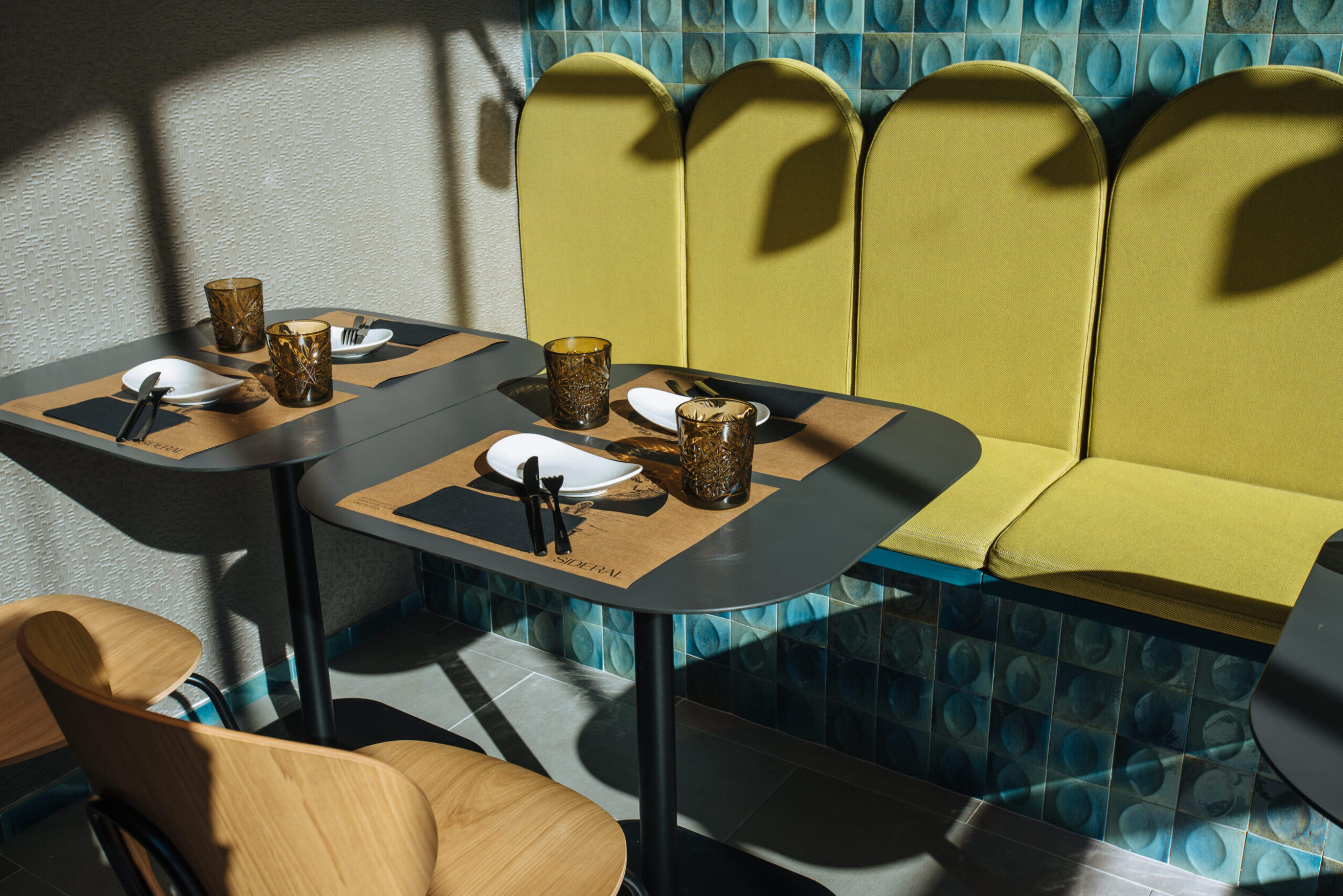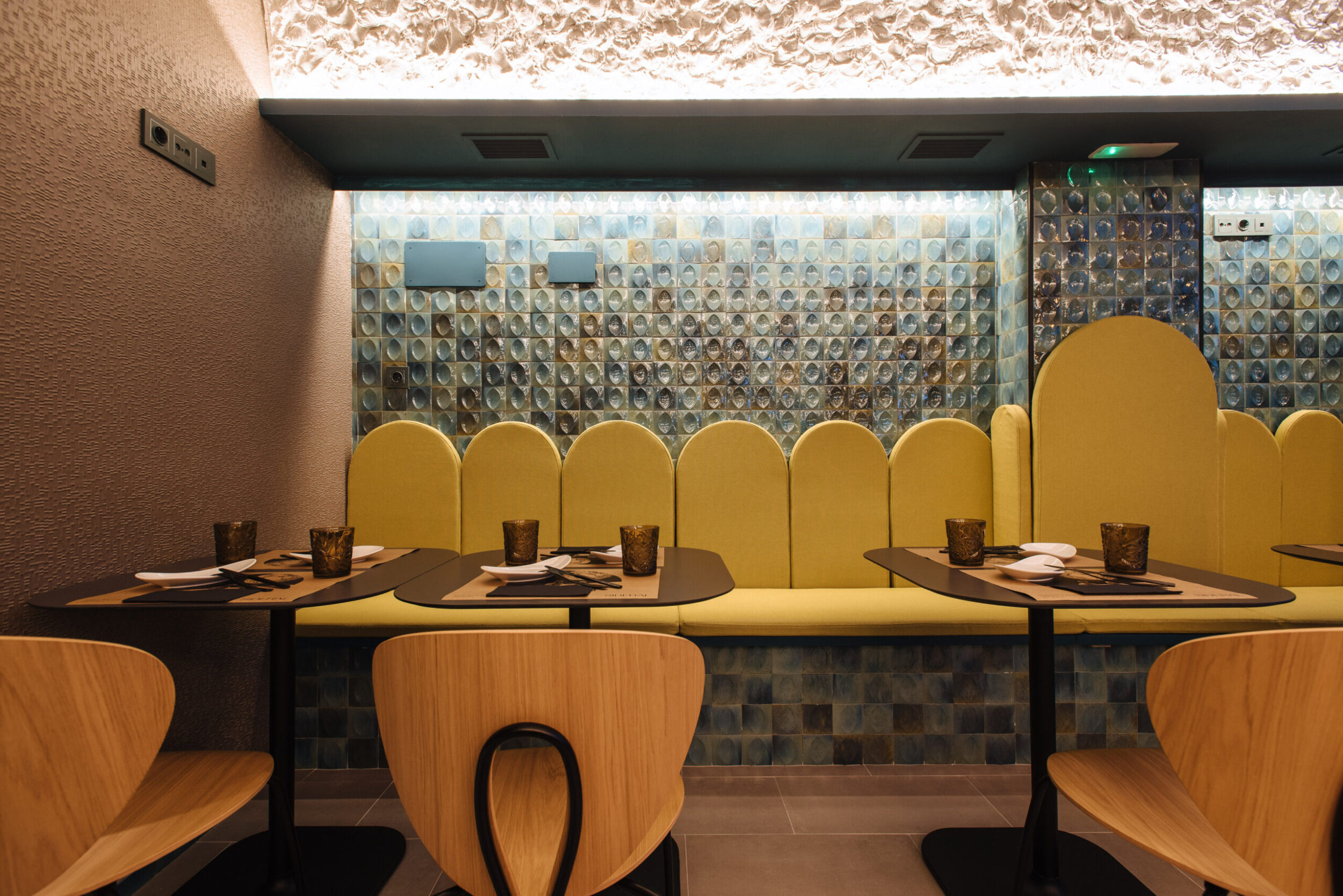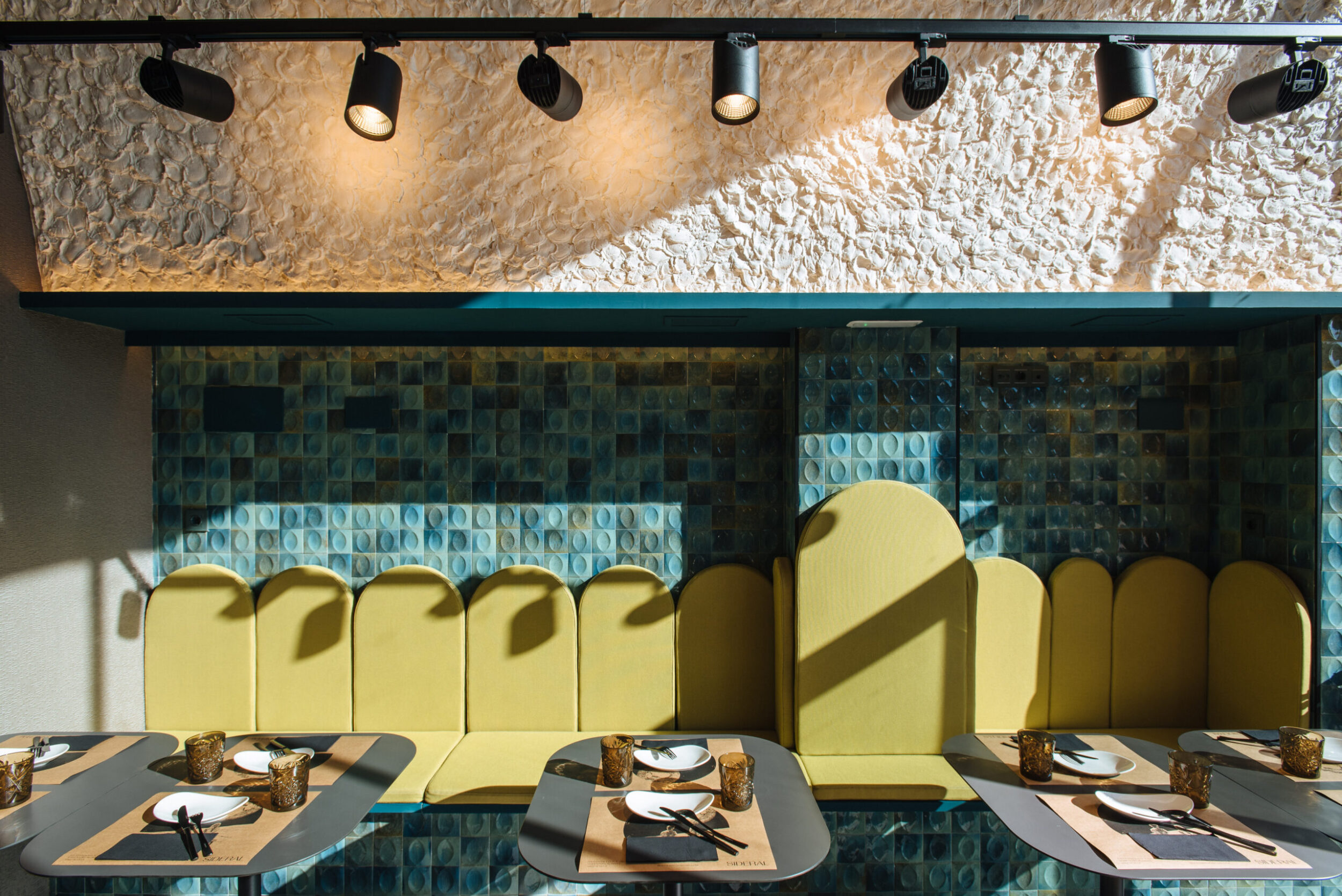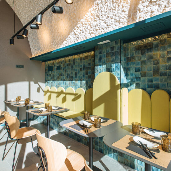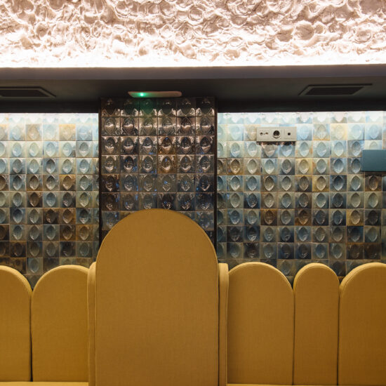 Los proyectistas han elegido Gleeze Turchese con acabado Glossy en la versión de 7×20 cm para los nichos del bar y Gleeze estructura Egg, de color Turchese pero en formato de 10×10 cm, para realzar la superficie de la barra principal y la pared de la zona de mesas. Los reflejos producidos por los azulejos cóncavos y convexos de la versión Egg Glossy en la barra del bar multiplican los juegos de luz y acentúan la textura de las superficies verticales.