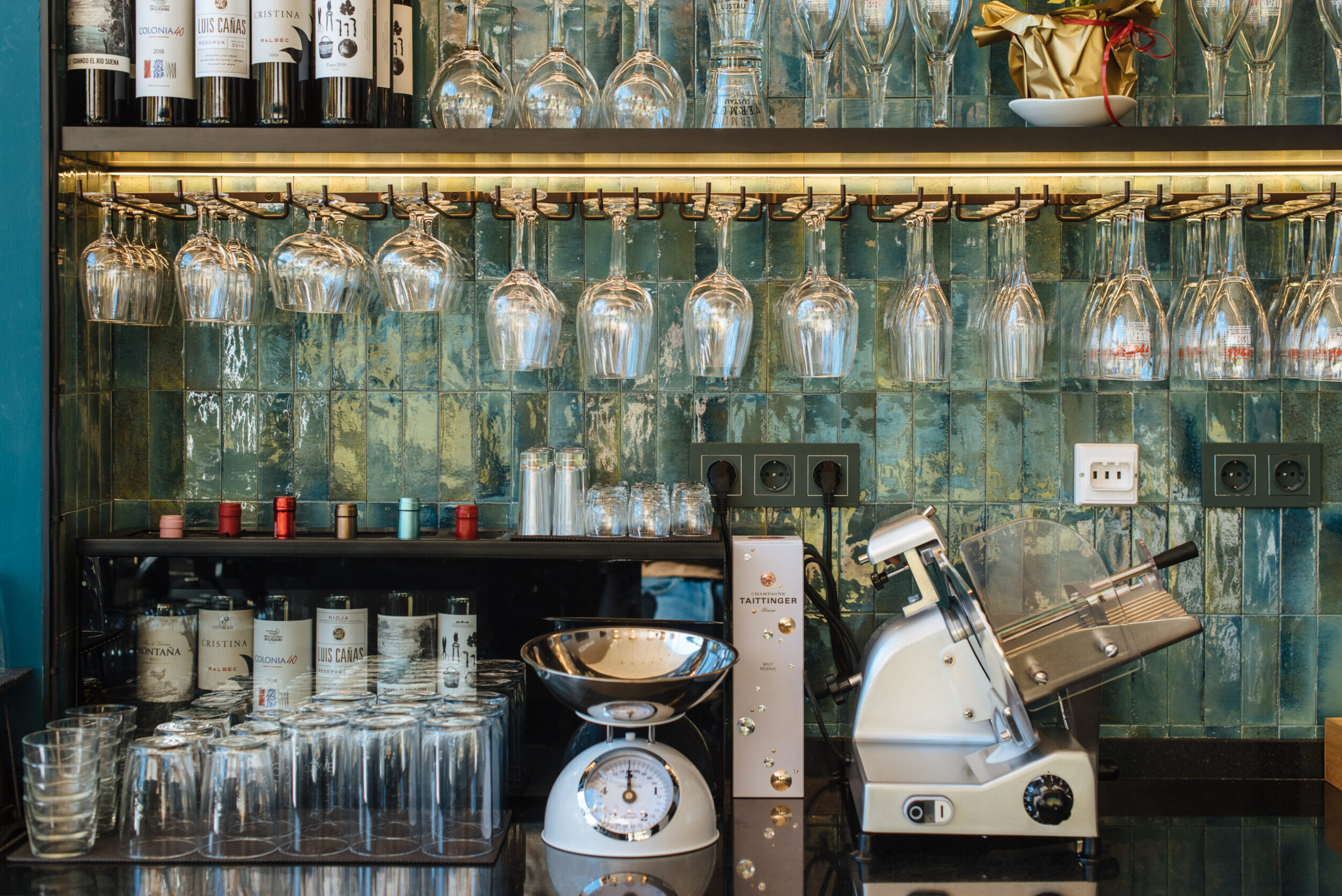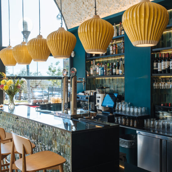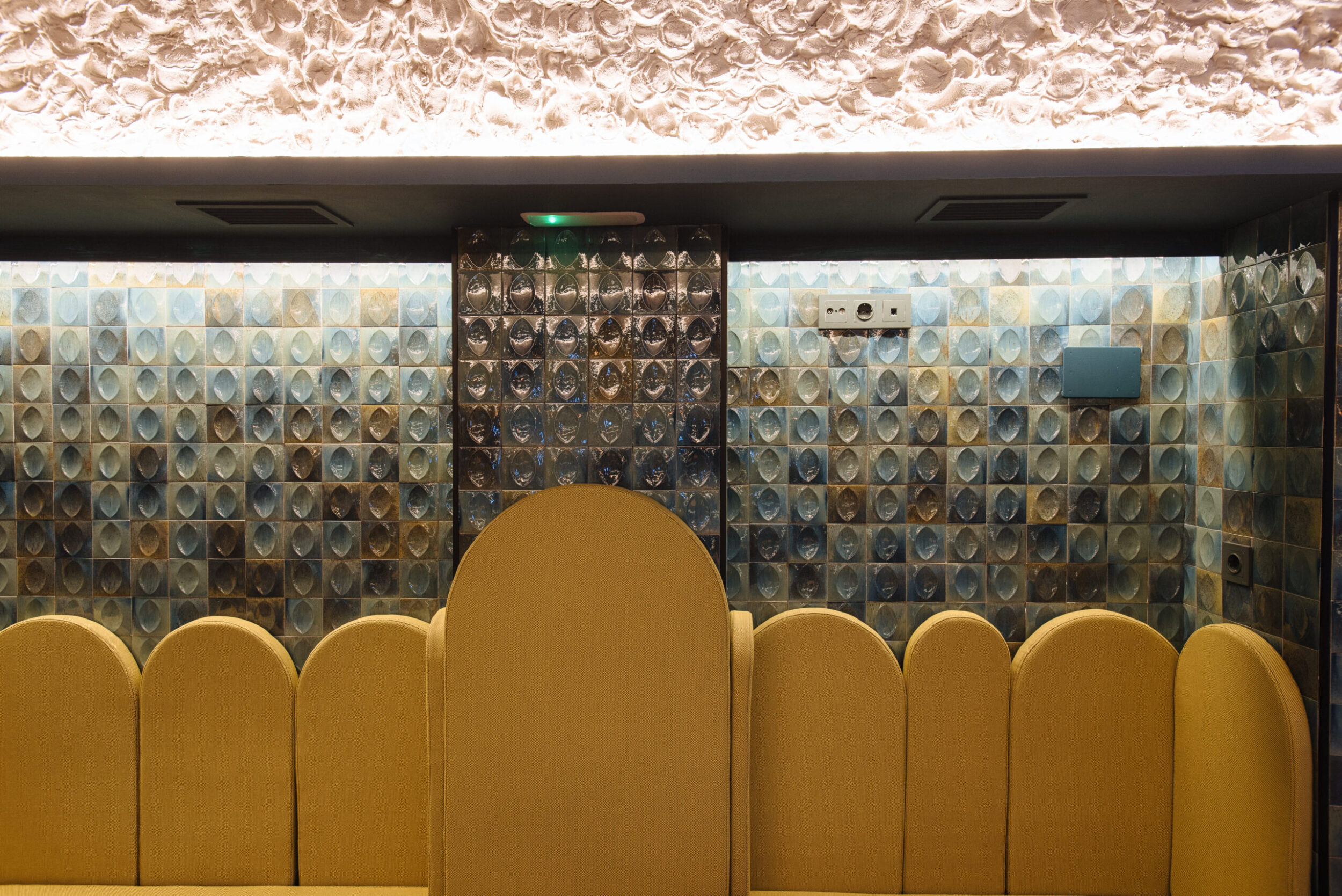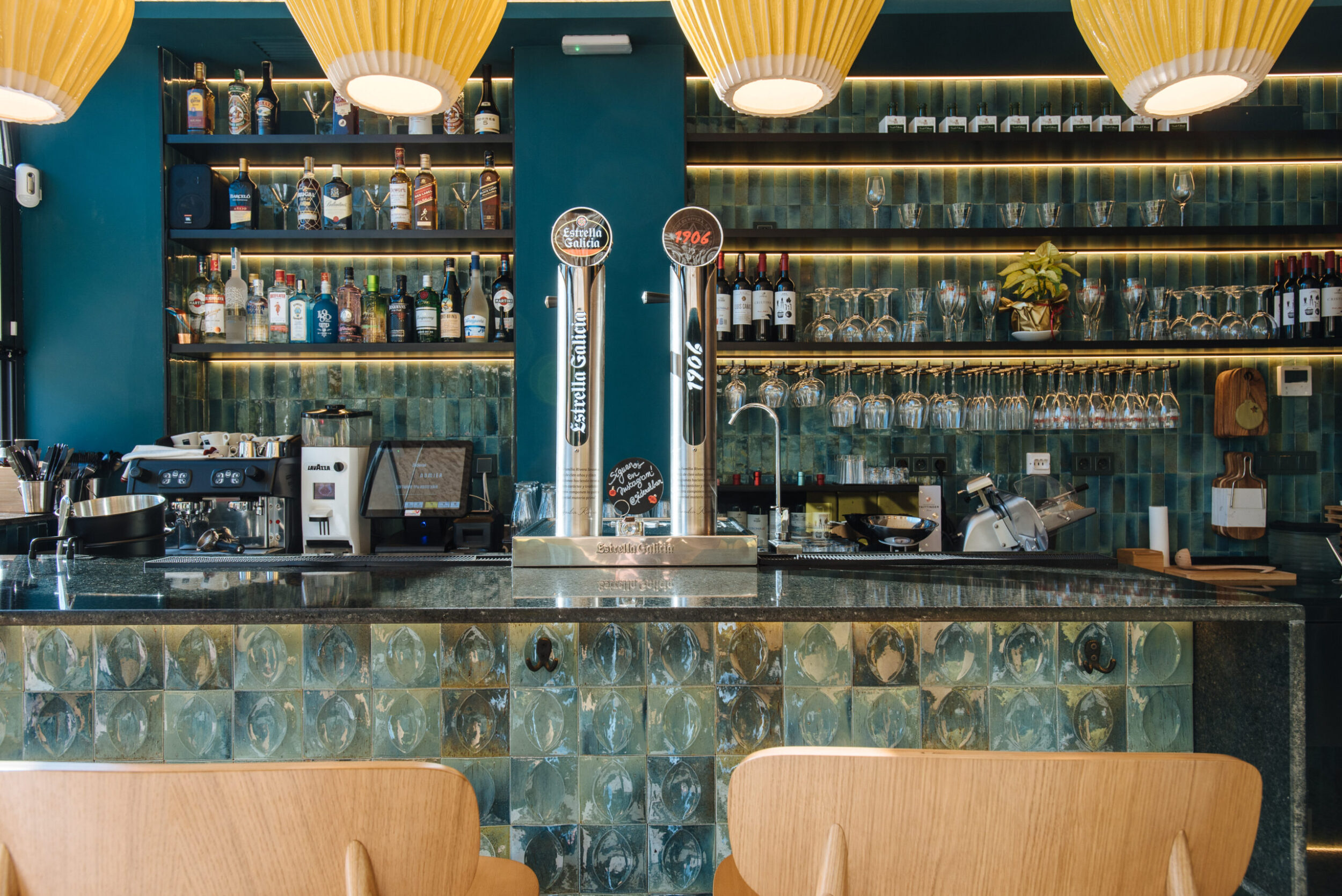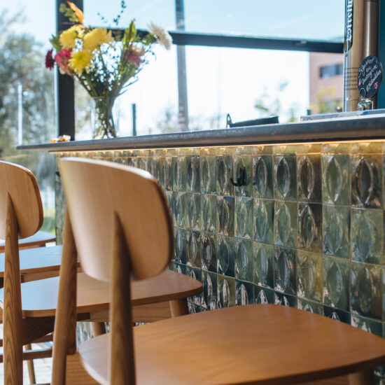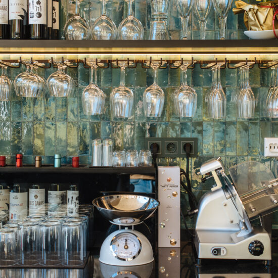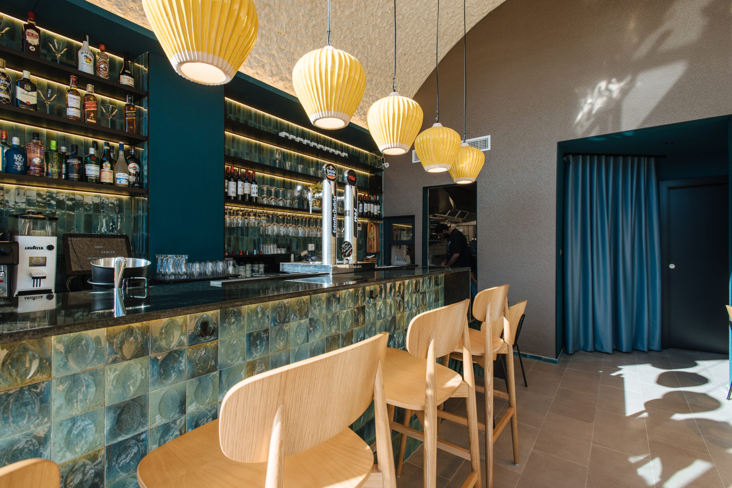 Los proyectistas han elegido Gleeze Turchese con acabado Glossy en la versión de 7×20 cm para los nichos del bar y Gleeze estructura Egg, de color Turchese pero en formato de 10×10 cm, para realzar la superficie de la barra principal y la pared de la zona de mesas. Los reflejos producidos por los azulejos cóncavos y convexos de la versión Egg Glossy en la barra del bar multiplican los juegos de luz y acentúan la textura de las superficies verticales.