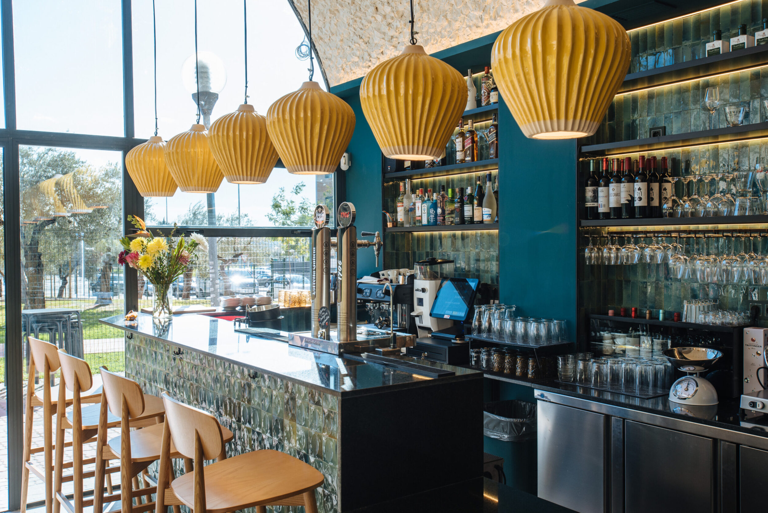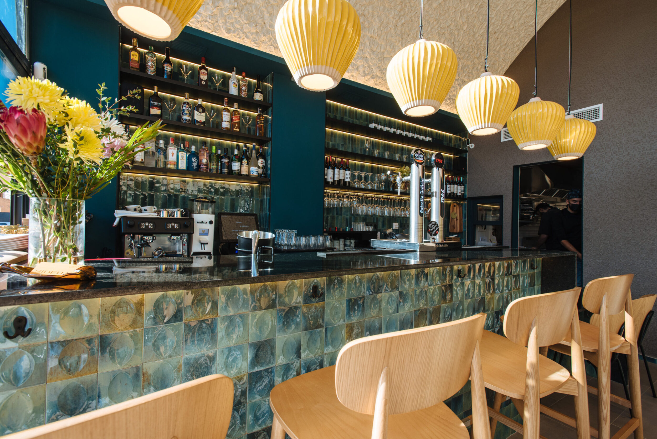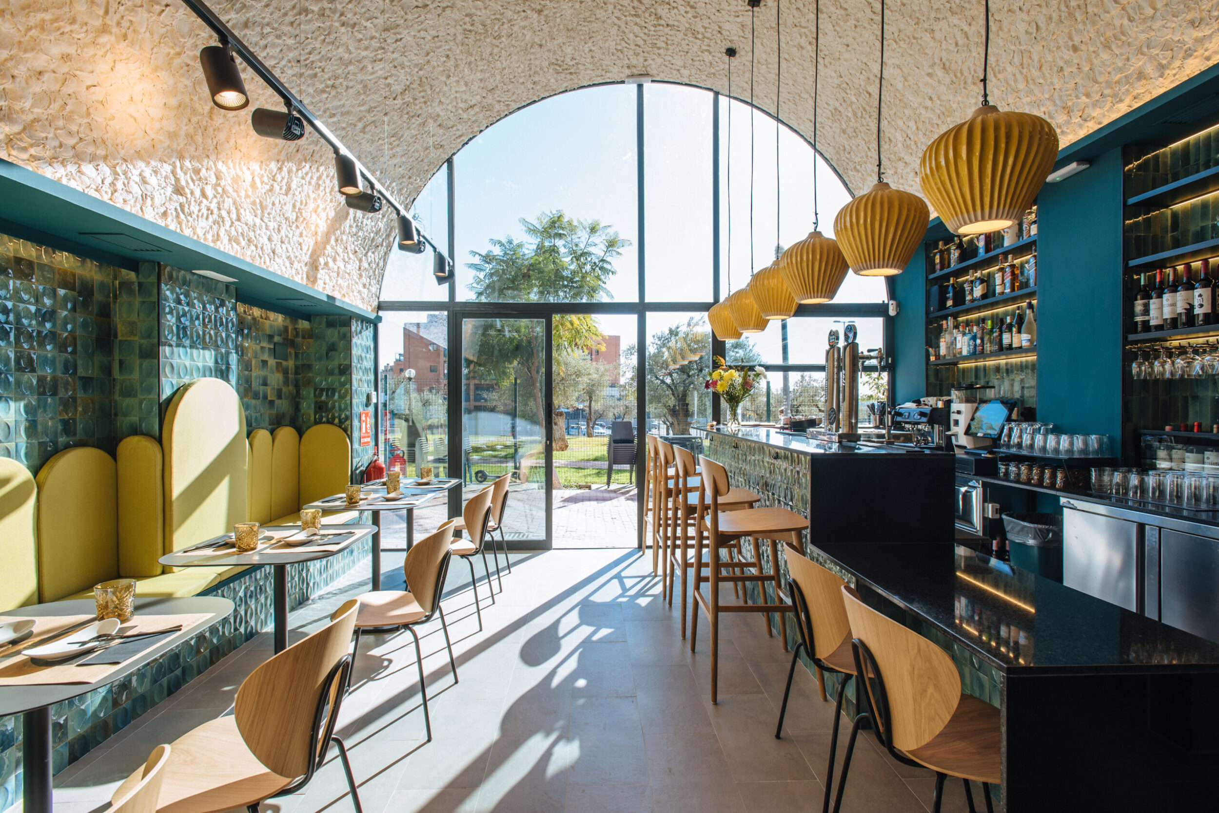 La paleta de colores ofrece un contraste bien equilibrado: el amarillo —opaco como el de la tapicería del respaldo del banco, o brillante como el de las lámparas de cerámica suspendidas—, el marrón-gris tórtola de los azulejos mates del suelo y el turquesa de efecto brillante utilizado en las superficies verticales, valorizado por las fuentes de luz cálida que retroiluminan los muebles fijos.