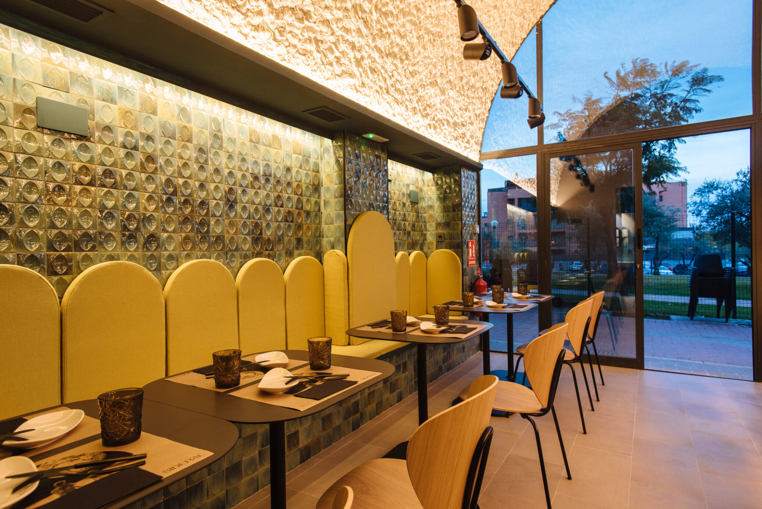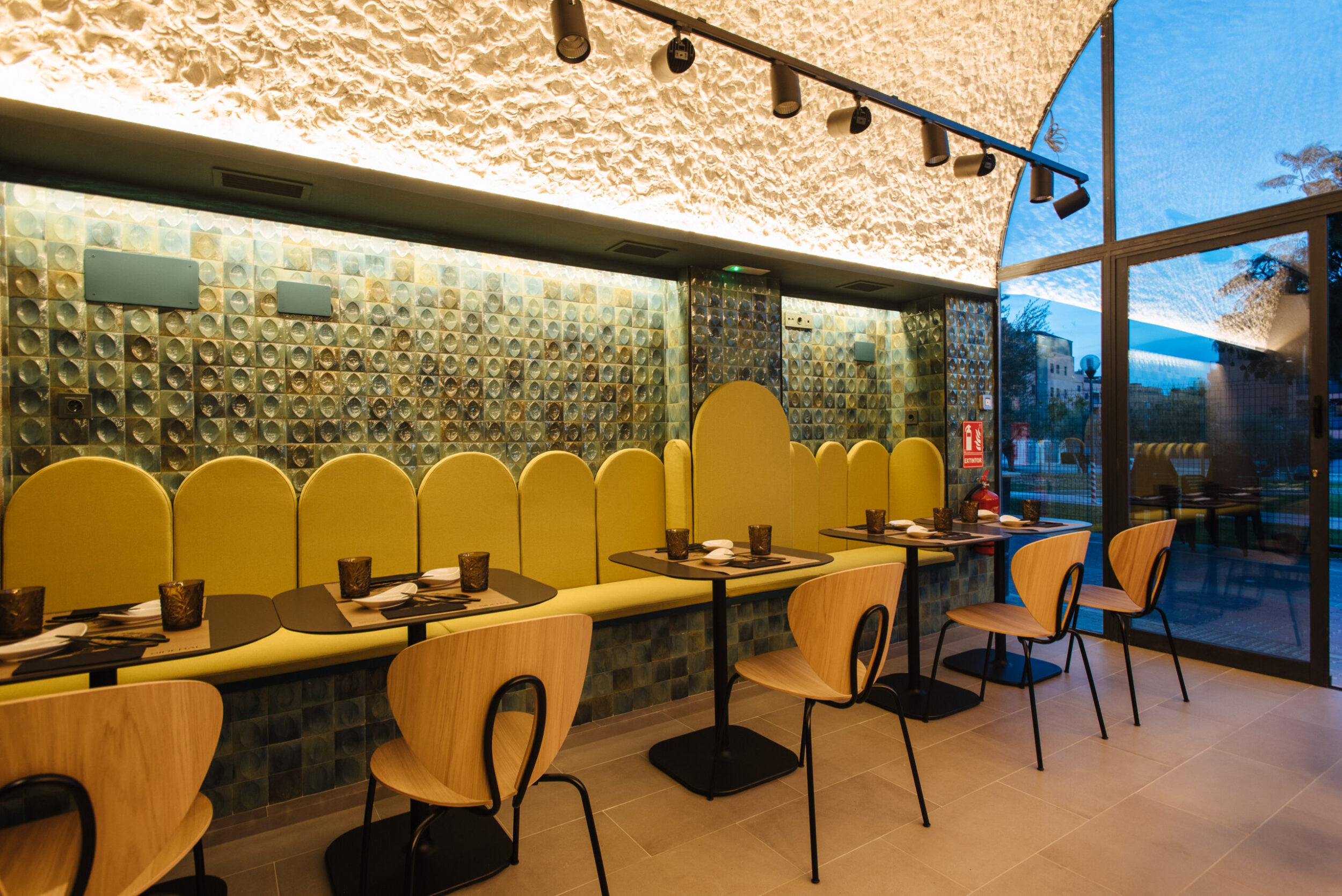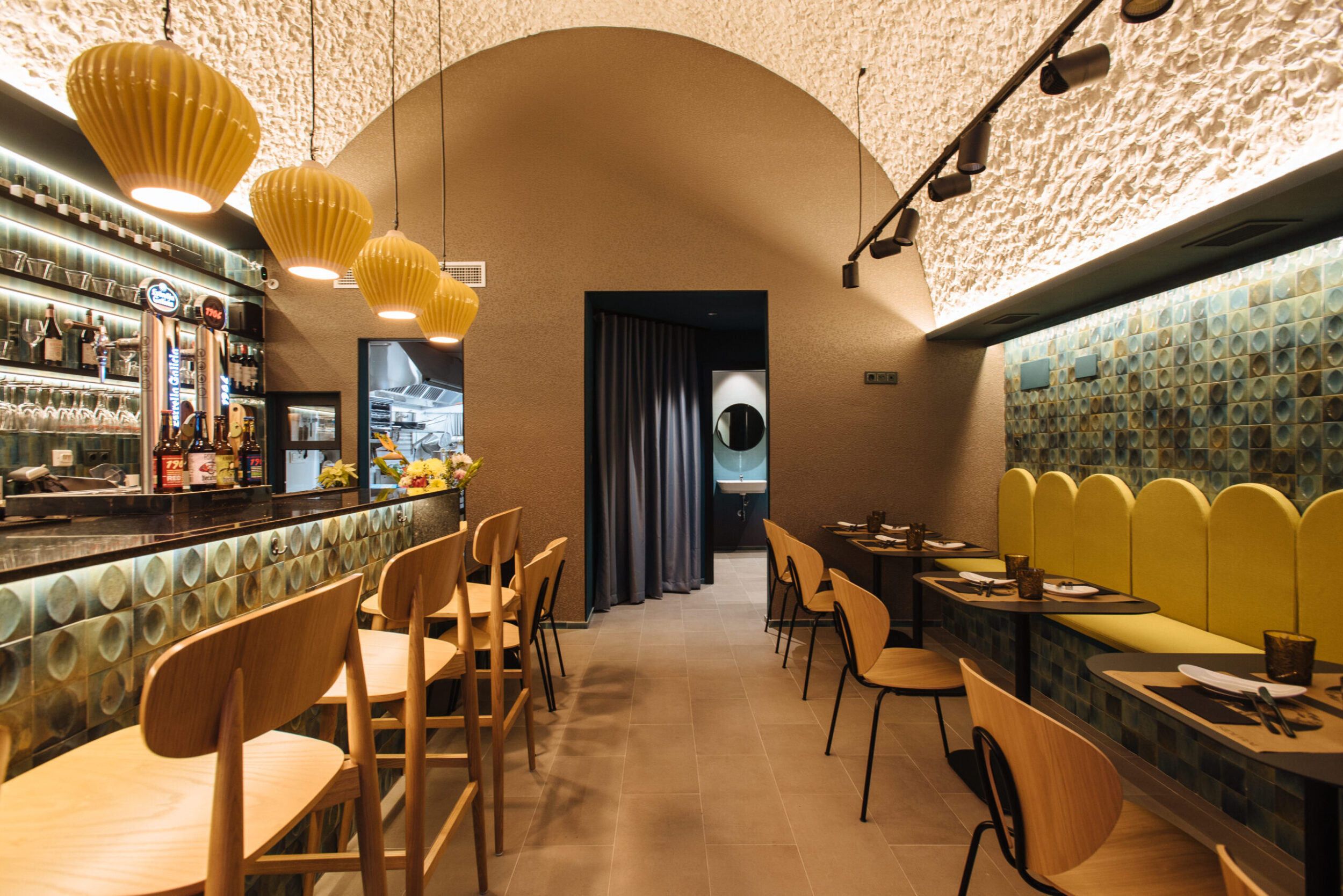 El espacio del restaurante se ha distribuido entre la zona de bar con barra lounge por un lado y, por otro, en la zona de comidas con mesas y un banco continuo para los clientes, muebles y decoraciones de aire retro.