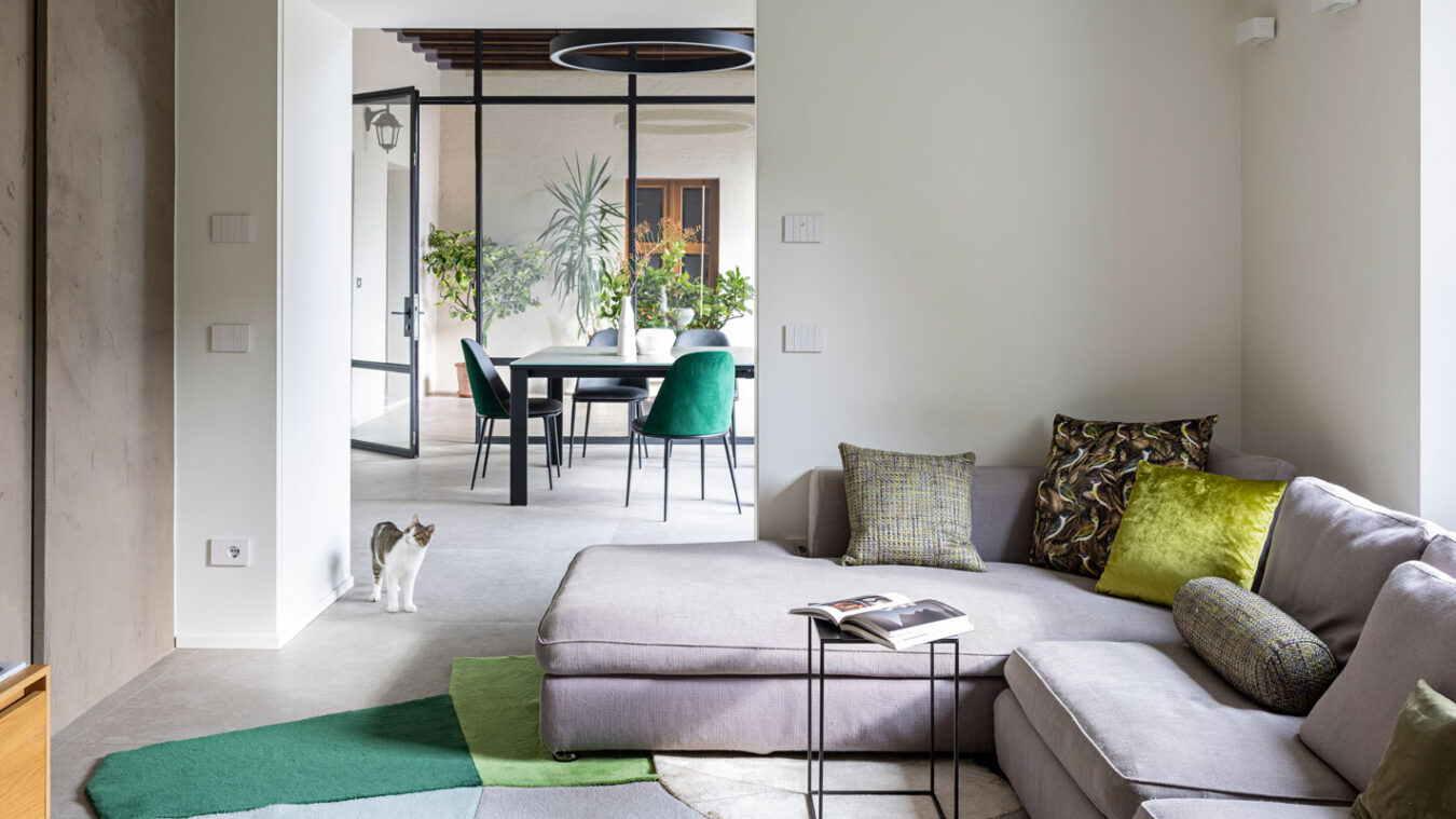 La zona de día de la vivienda se configura como un fascinante triángulo que conecta el área del comedor con la sala de estar y la cocina, donde el denominador común es el pavimento que cubre toda la superficie: Flussocreativo eligió las placas de la colección Realstone_Lunar de Ragno en el acabado Beige, un gres de imitación de la piedra que reinterpreta el grafismo de la roca asfáltica, de color oscuro, con elegantes vetas capaces de crear cohesión entre los ambientes y llevar las texturas irregulares de la naturaleza al interior del hogar.