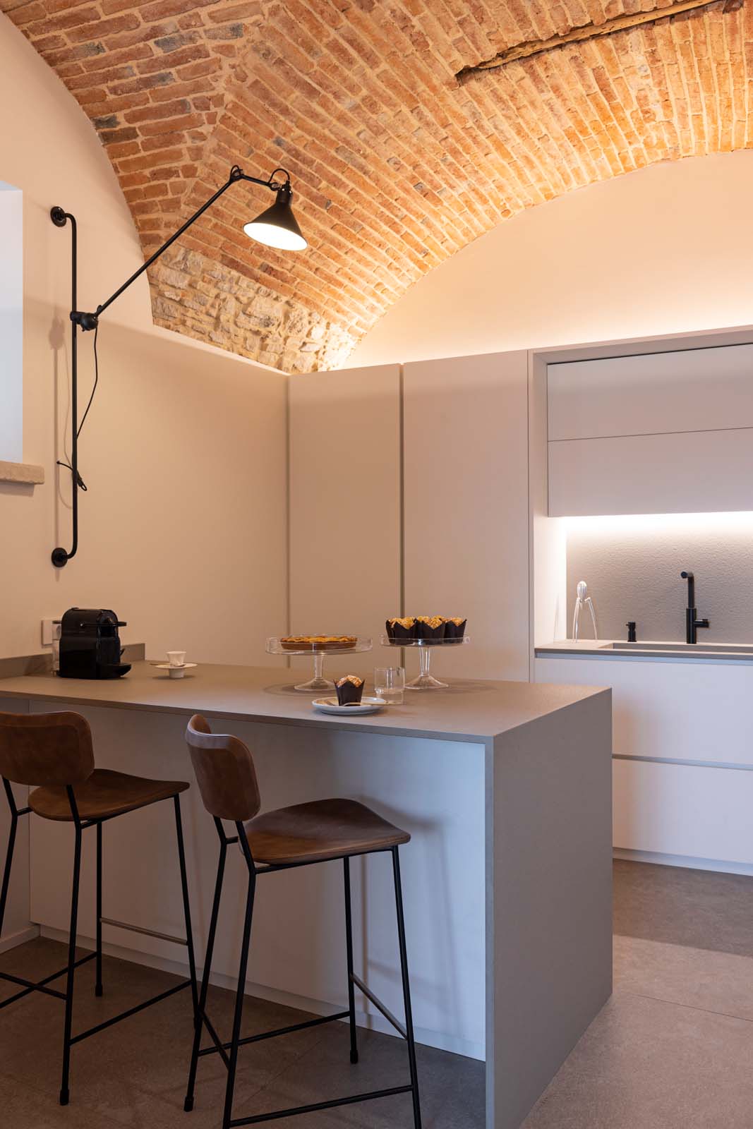 Gracias al formato grande de las placas de 120 x 120 cm los tres ambientes de la zona de día se ven aún más amplios y límpidamente espaciosos, poniendo de relieve las características más encantadoras de la morada, como las sugestivas bóvedas de ladrillos antiguos de la cocina o el paisaje circunstante que “entra en casa” gracias a los enormes ventanales del comedor.