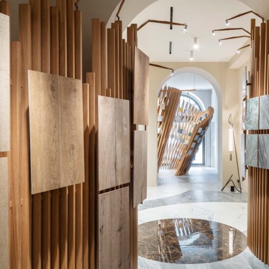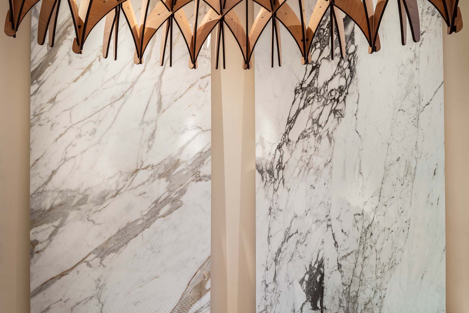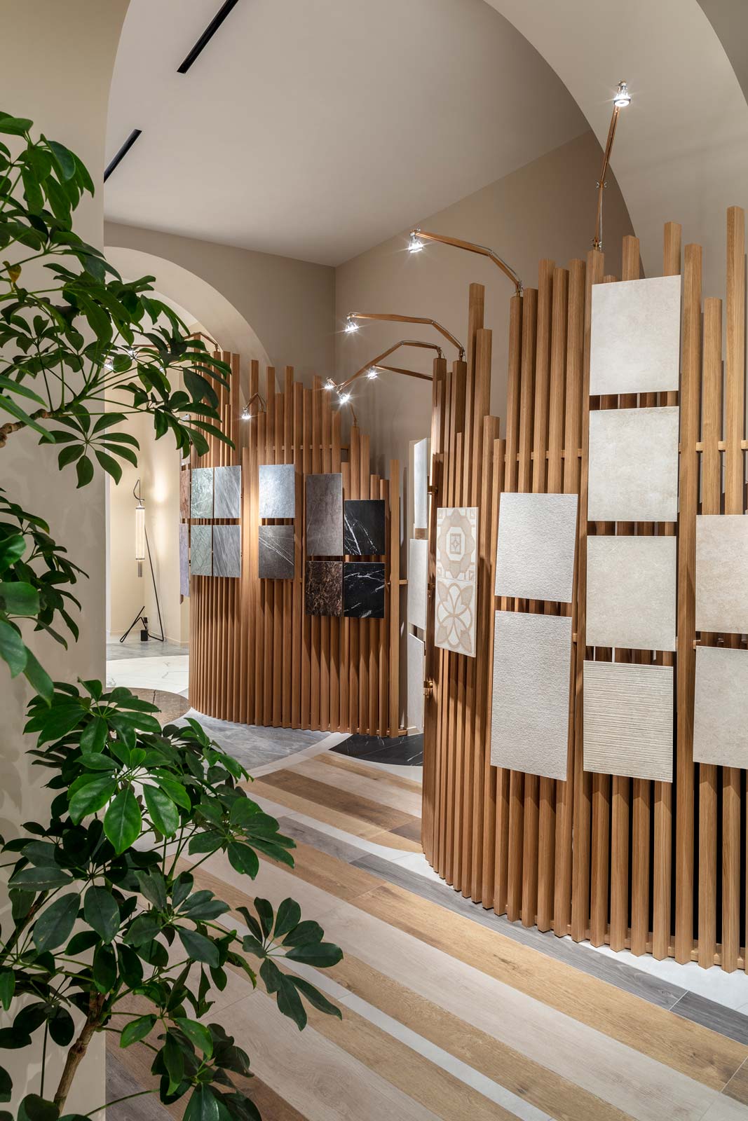 Una sugestión que acoge al visitante ya desde la entrada a la sala de exposición, a partir de los escaparates, donde las grandes placas de gres de grosor reducido de la colección Incanto se hallan en armonioso equilibrio con las pequeñas cerámicas superbrillantes e hiperdecoradas de Storie, con un sistema de tirantes que evoca, una vez más, las formas geométricas de la tela de araña.