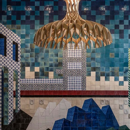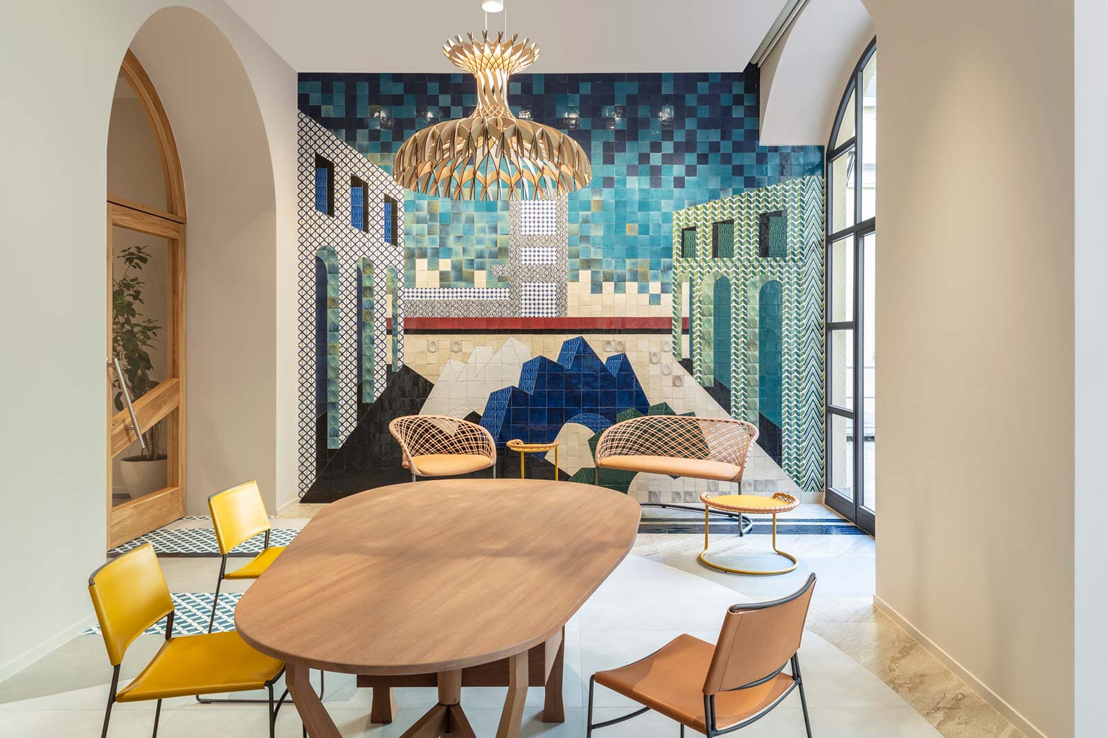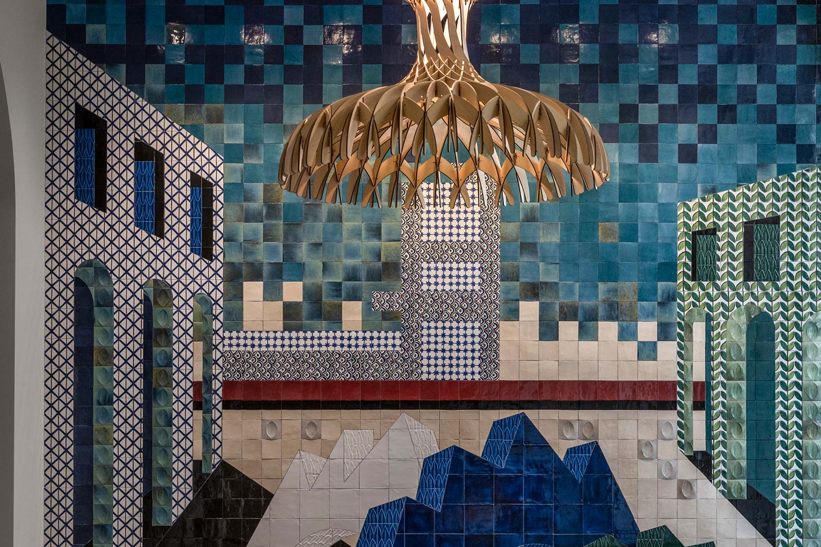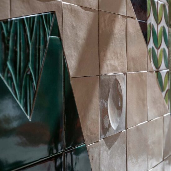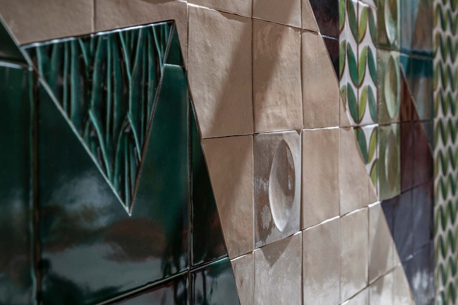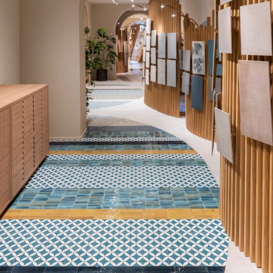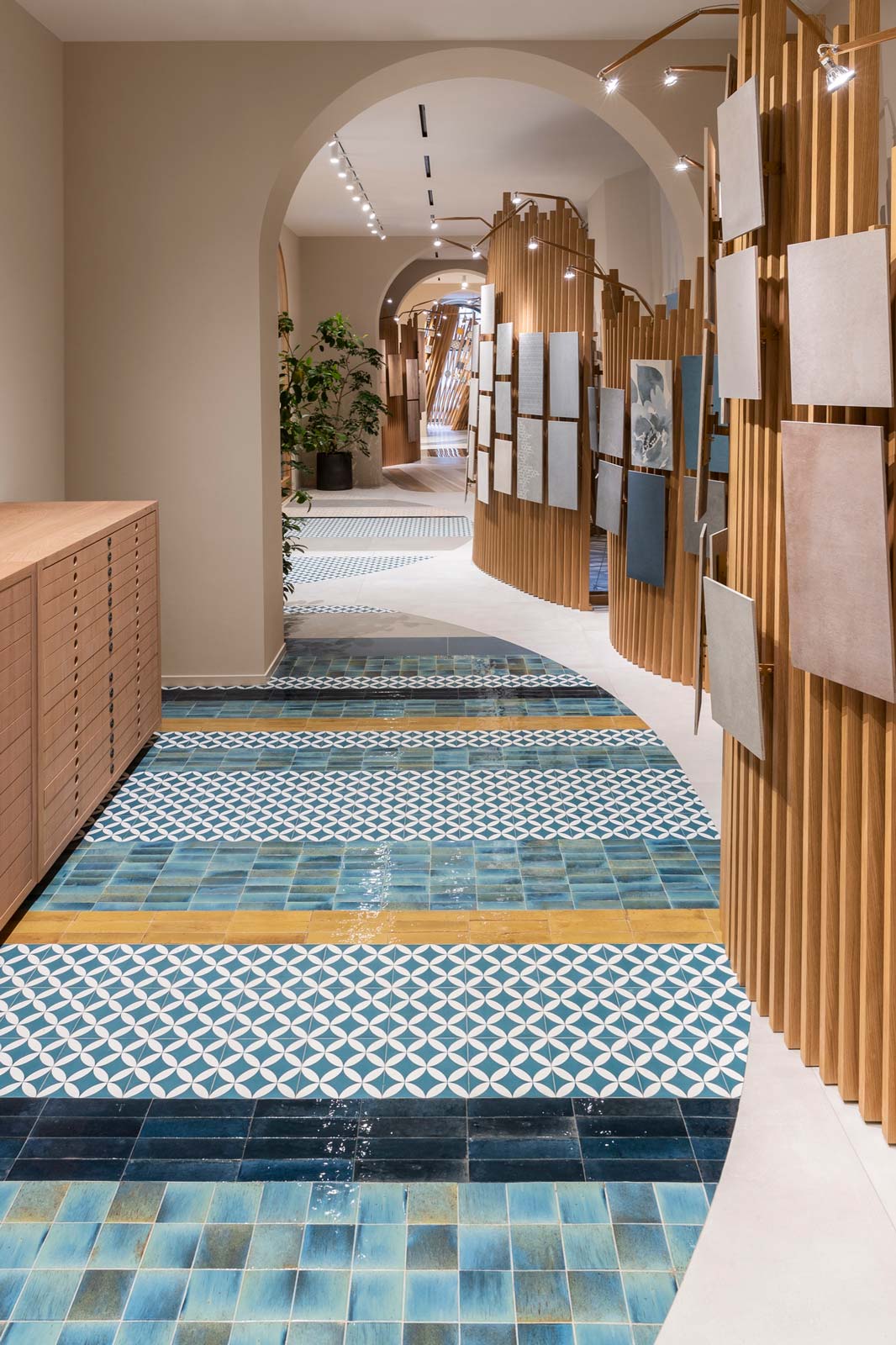 La sala de exposición, proyecto de Benedetta Tagliabue – EMBT, ha sido reinterpretada como un caleidoscopio de colores, texturas y dibujos que narran de manera sorprendente la historia y las capacidades técnicas y artesanales de la marca, así como todo el potencial expresivo de la cerámica.