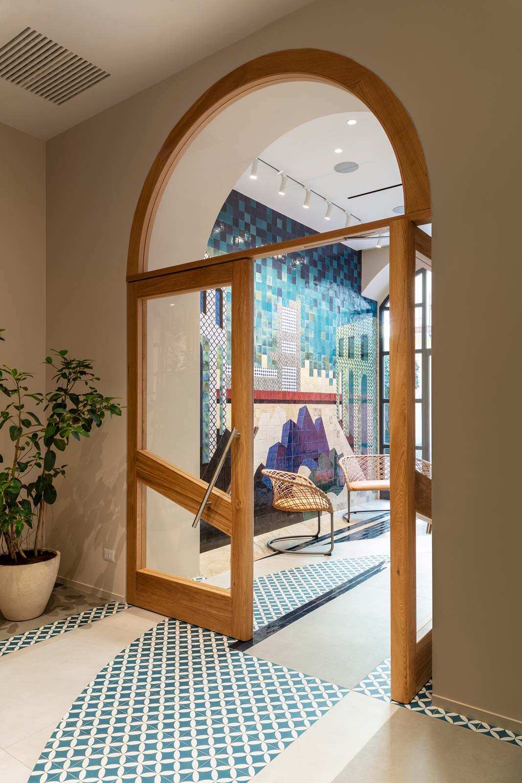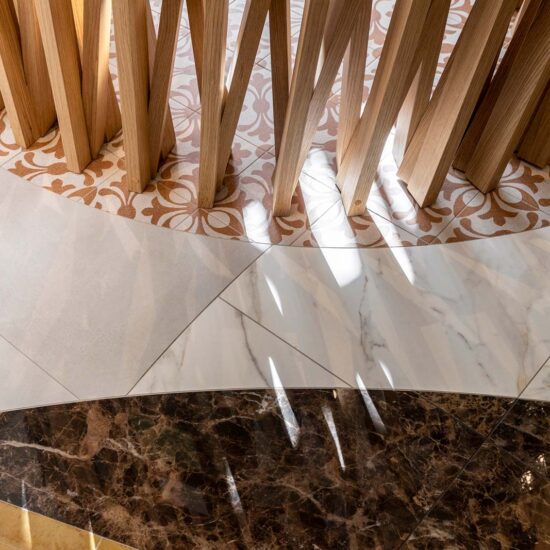 “El pavimento es el otro aspecto decididamente interesante de este proyecto", prosigue Tagliabue. "Un único gran mosaico, una auténtica obra de arte polícroma que muestra el superpoder del gres para suscitar el diálogo entre colecciones brillantes y mates de inspiraciones matéricas distintas, de la madera al mármol, del cemento a la piedra, de modo absolutamente armonioso y natural.”