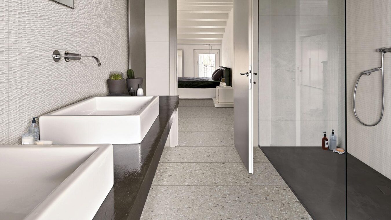 Los materiales para el revestimiento de las paredes y del suelo, como por ejemplo el gres porcelánico, se pueden disponer de acuerdo con un moodboard inspirador, del que servirse para decidir qué colores y texturas asignar a cada superficie, en su totalidad o en cada una de sus partes.