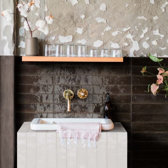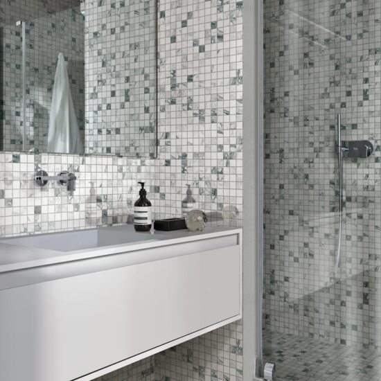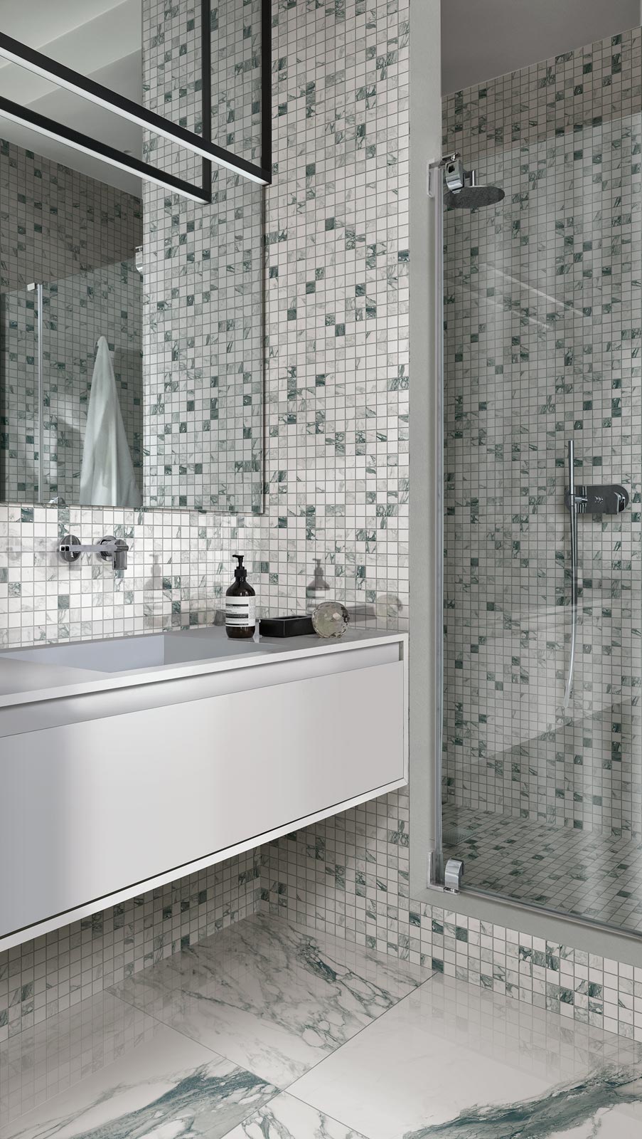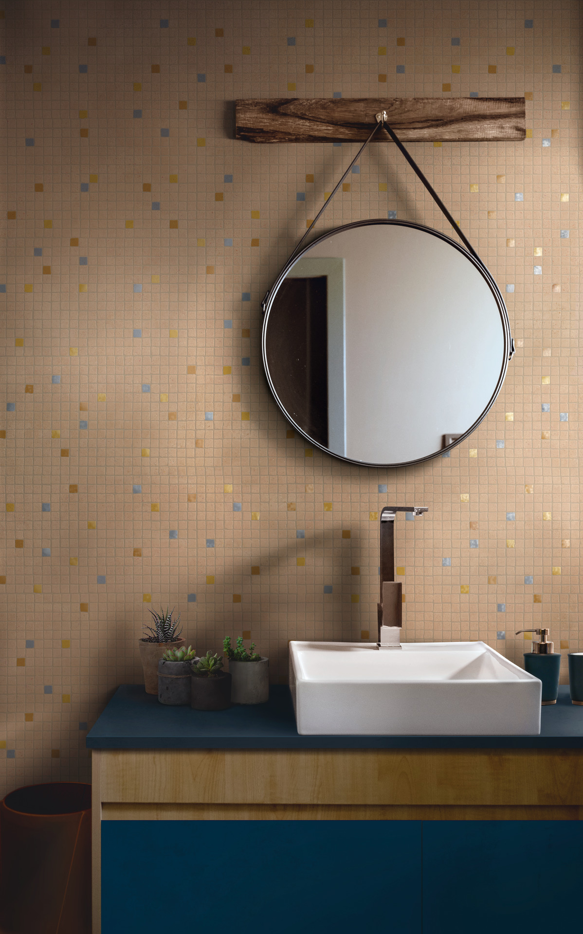 Ragno, para favorecer esta intención valorizadora, propone un sinfín de posibilidades compositivas que desarrollar combinando elementos de gres porcelánico o de cerámica de inspiración diversa: las baldosas hidráulicas de la colección Contrasti, los formatos pequeños imperfectamente perfectos y los colores plenos y actuales de Look y Mélange, los mosaicos y decoraciones tridimensionales en gres efecto mármol Bistrot y gres efecto piedra Realstone Navigli y el carácter ligeramente nostálgico, con ricos tonos pastel, de las colecciones de revestimientos cerámicos Cocciopesto y Resina.
