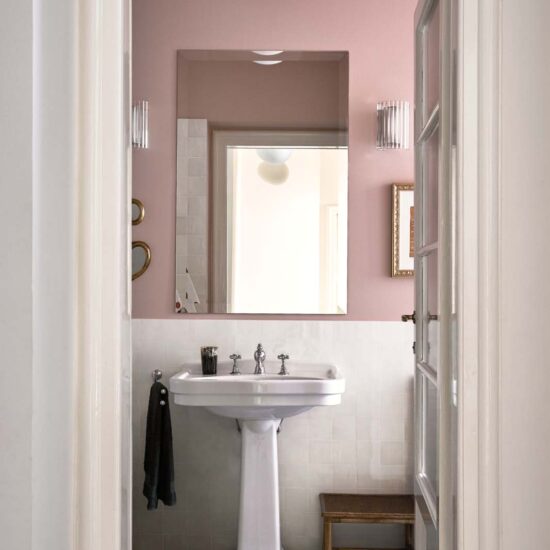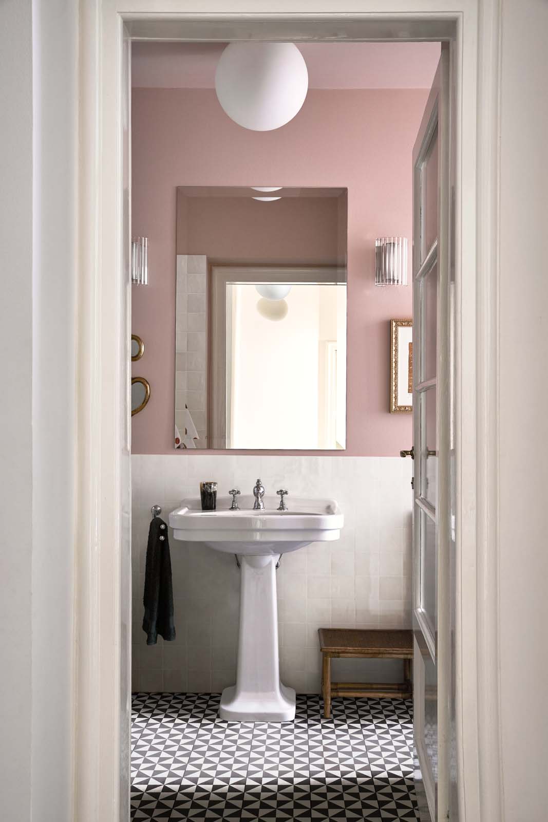 Cuando el espacio es muy limitado lo mejor es determinar un punto focal en el que concentrar un color acentuado o un elemento decorativo distintivo. Esto nos permitirá lograr un resultado importante: encauzar precisamente hacia ese punto la mirada de quien entra en el baño, “distrayéndolo” de sus pequeñas dimensiones. El truco funciona todavía más si las superficies no comprendidas en el encuadre que hayamos priorizado son tratadas con colores y materiales de carácter cromático o matérico más bien neutro, e incluso si se eligen dando continuidad a otros espacios de la casa.