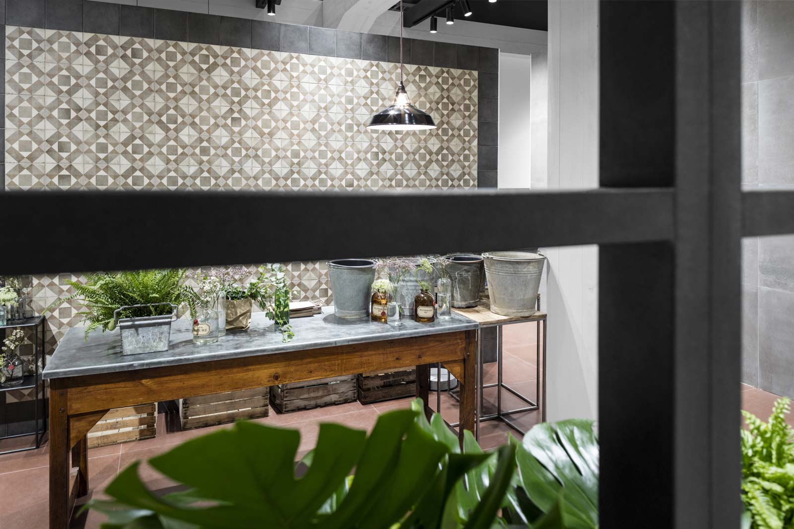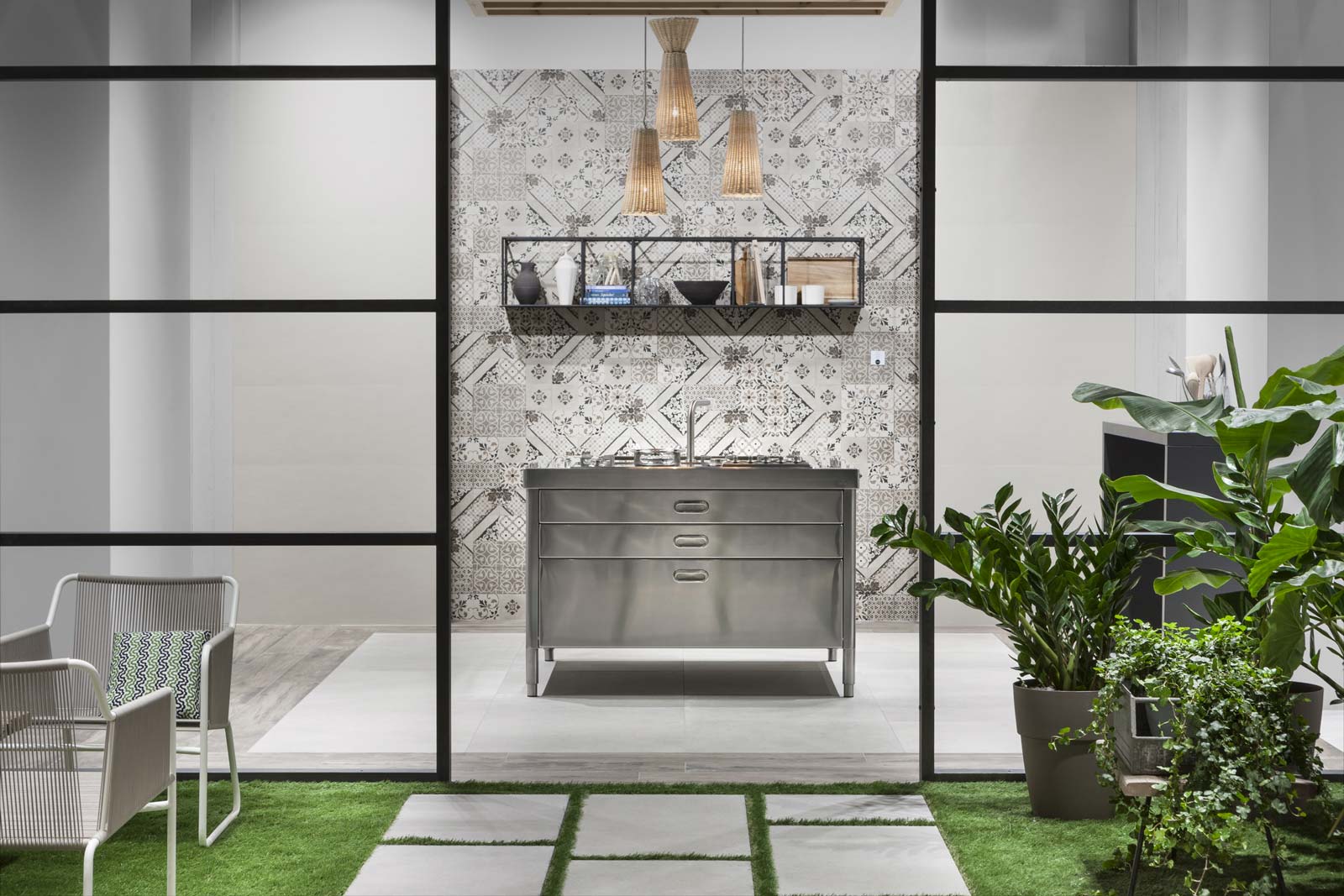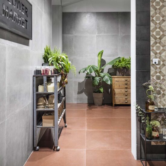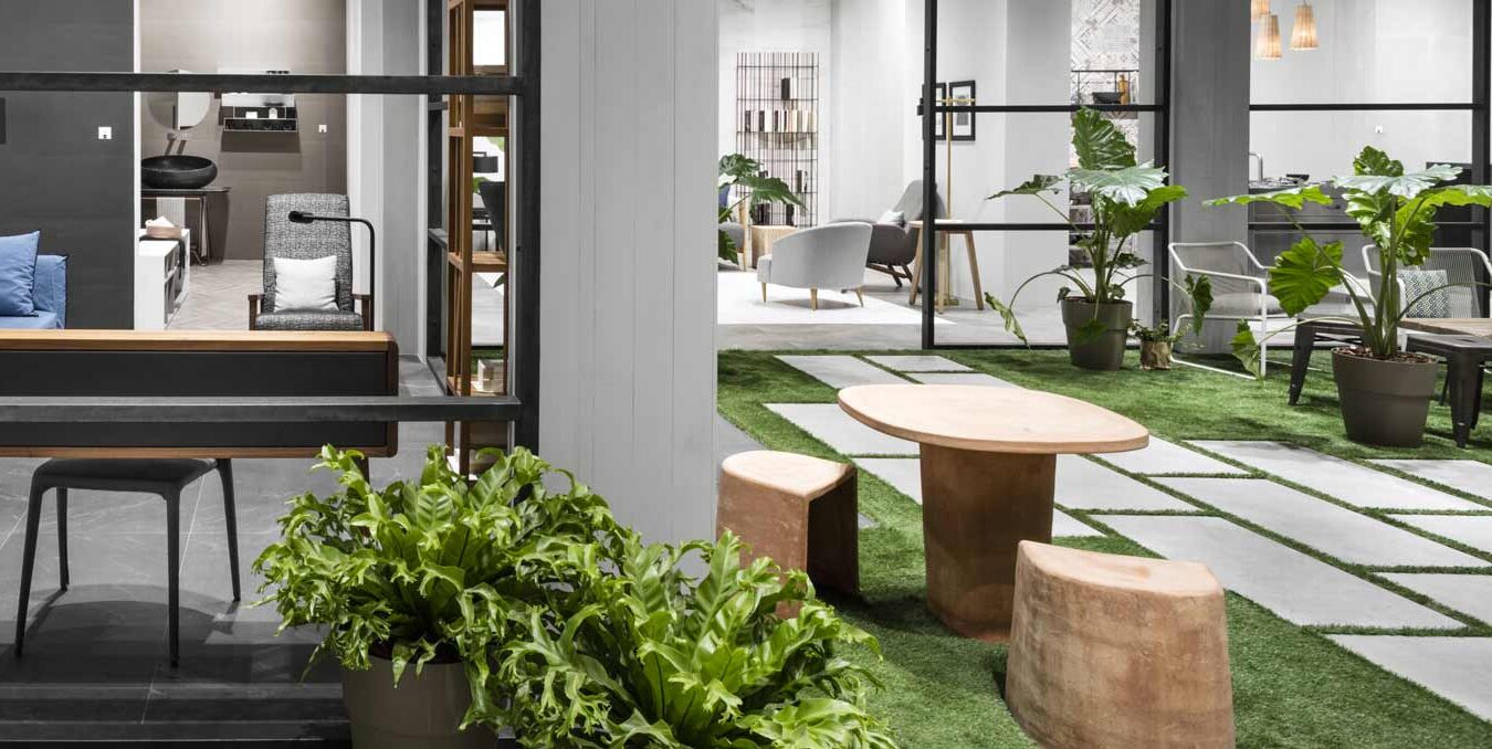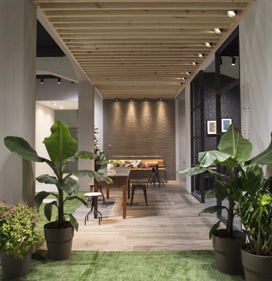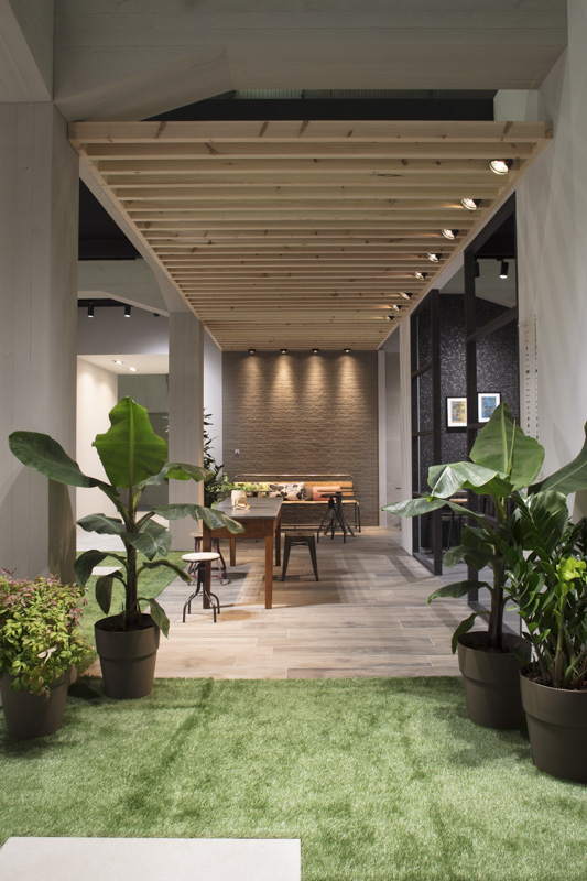Un ambiente distendido e informal, el propuesto por el stand de Ragno en Cersaie 2017. La ambientación, enriquecida y revalorizada por el estilismo de Marta Meda, recreó un patio interior con espacios verdes y pequeñas actividades comerciales (entre ellas una verdadera floristería y un coqueto café), desde el que se abre la vista hacia interiores domésticos sofisticados revestidos con las novedades de la firma Ragno.