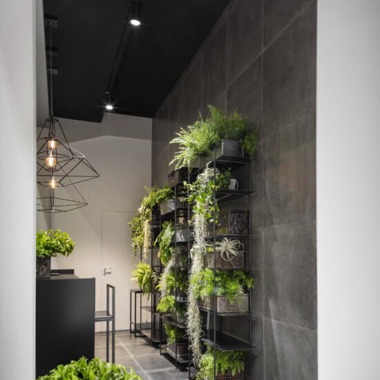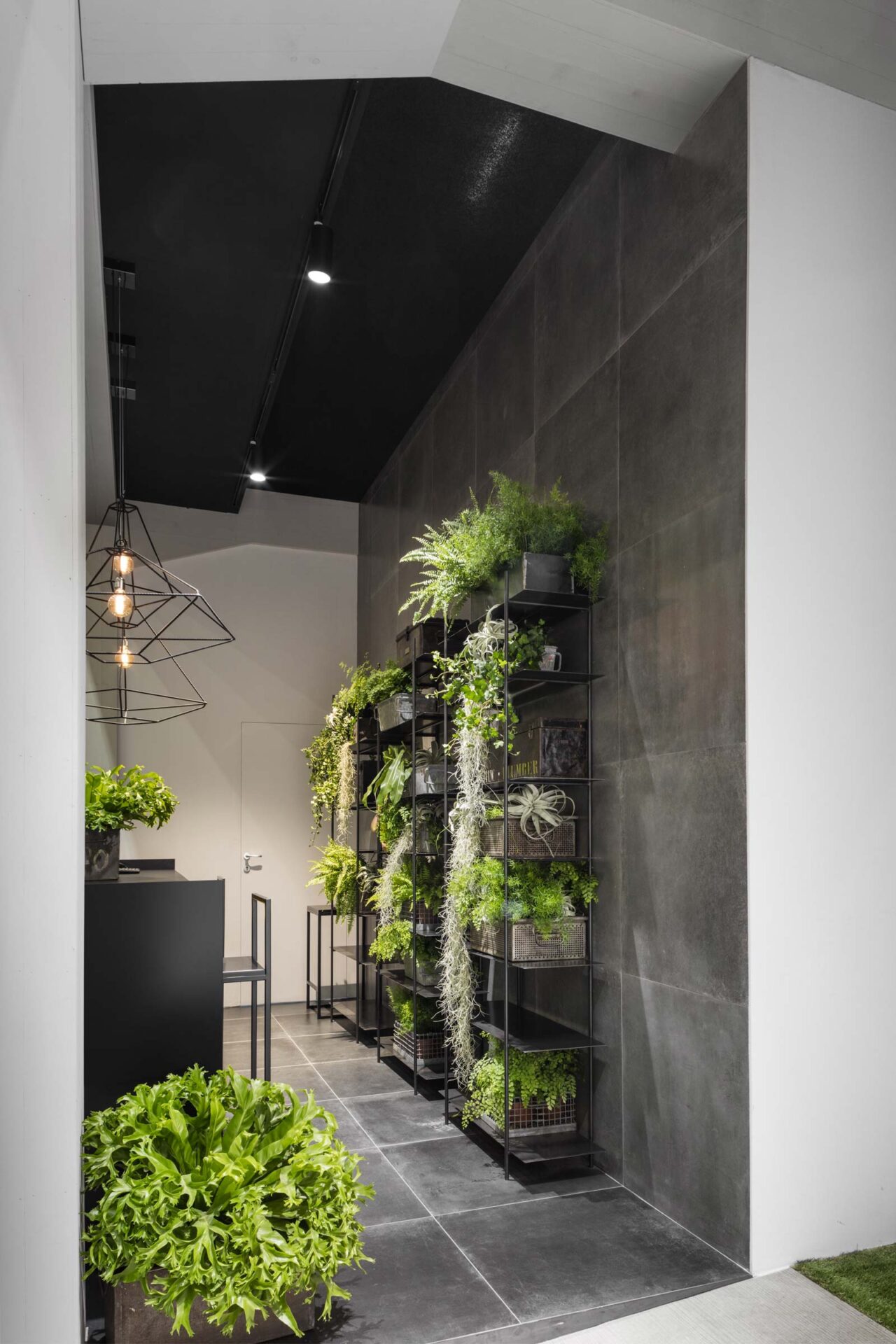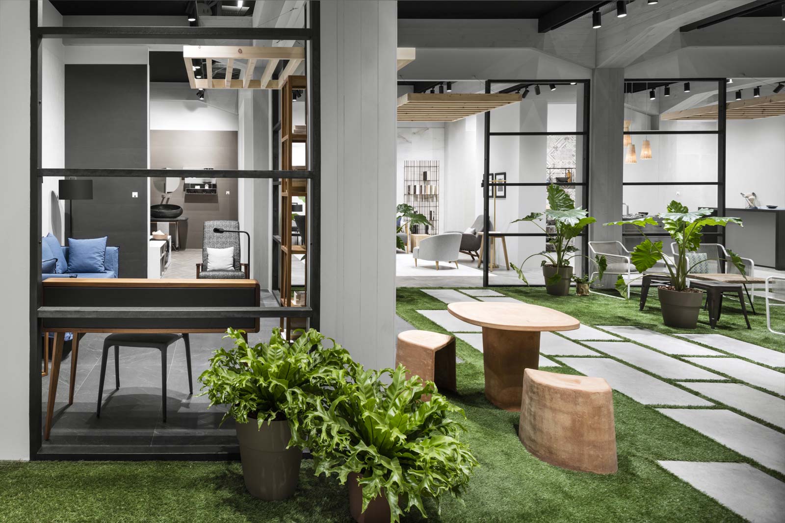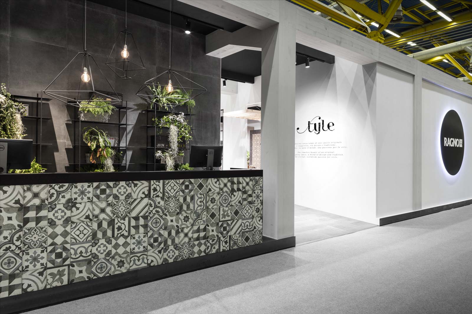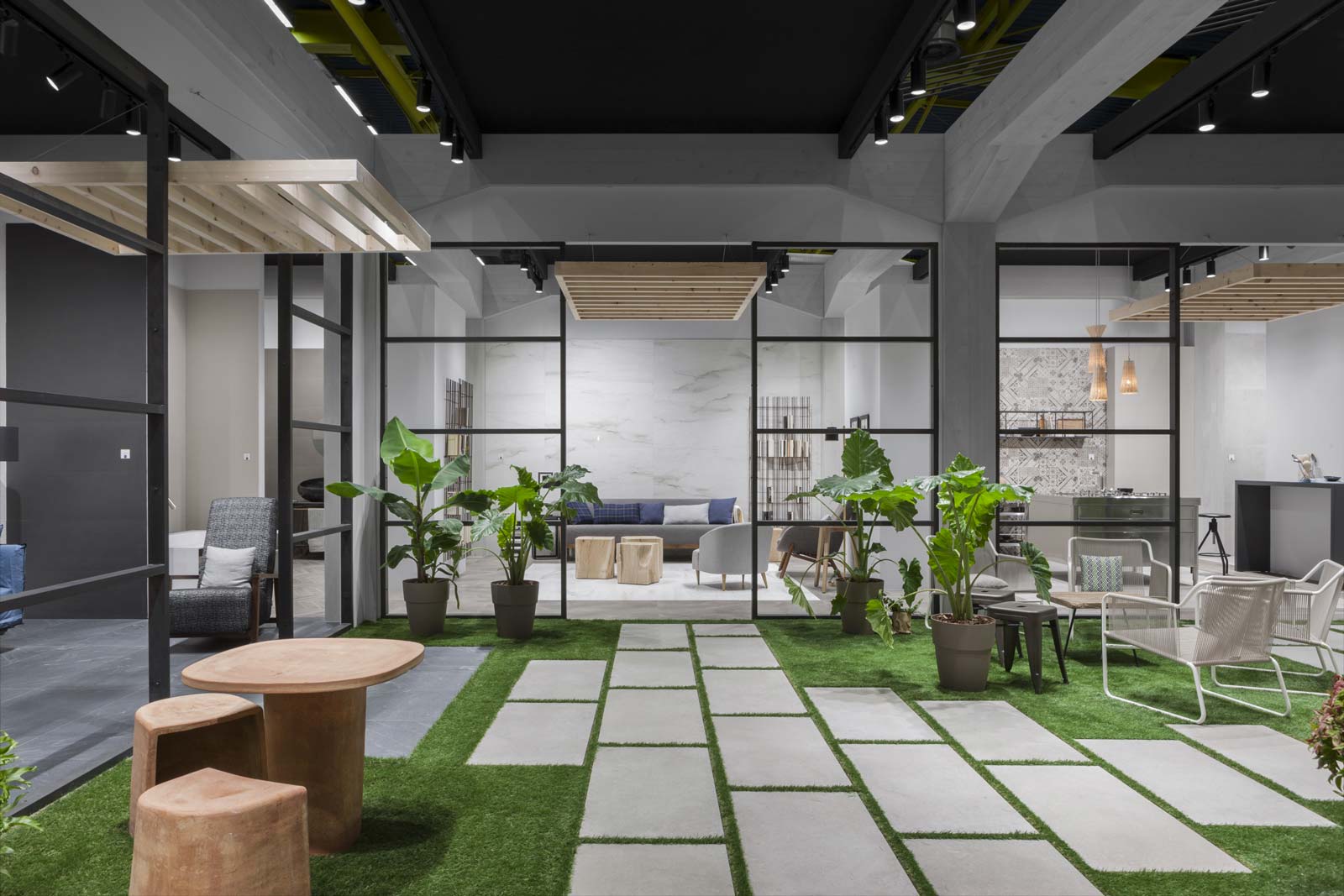 Un ambiente distendido e informal, el propuesto por el stand de Ragno en Cersaie 2017. La ambientación, enriquecida y revalorizada por el estilismo de Marta Meda, recreó un patio interior con espacios verdes y pequeñas actividades comerciales (entre ellas una verdadera floristería y un coqueto café), desde el que se abre la vista hacia interiores domésticos sofisticados revestidos con las novedades de la firma Ragno.