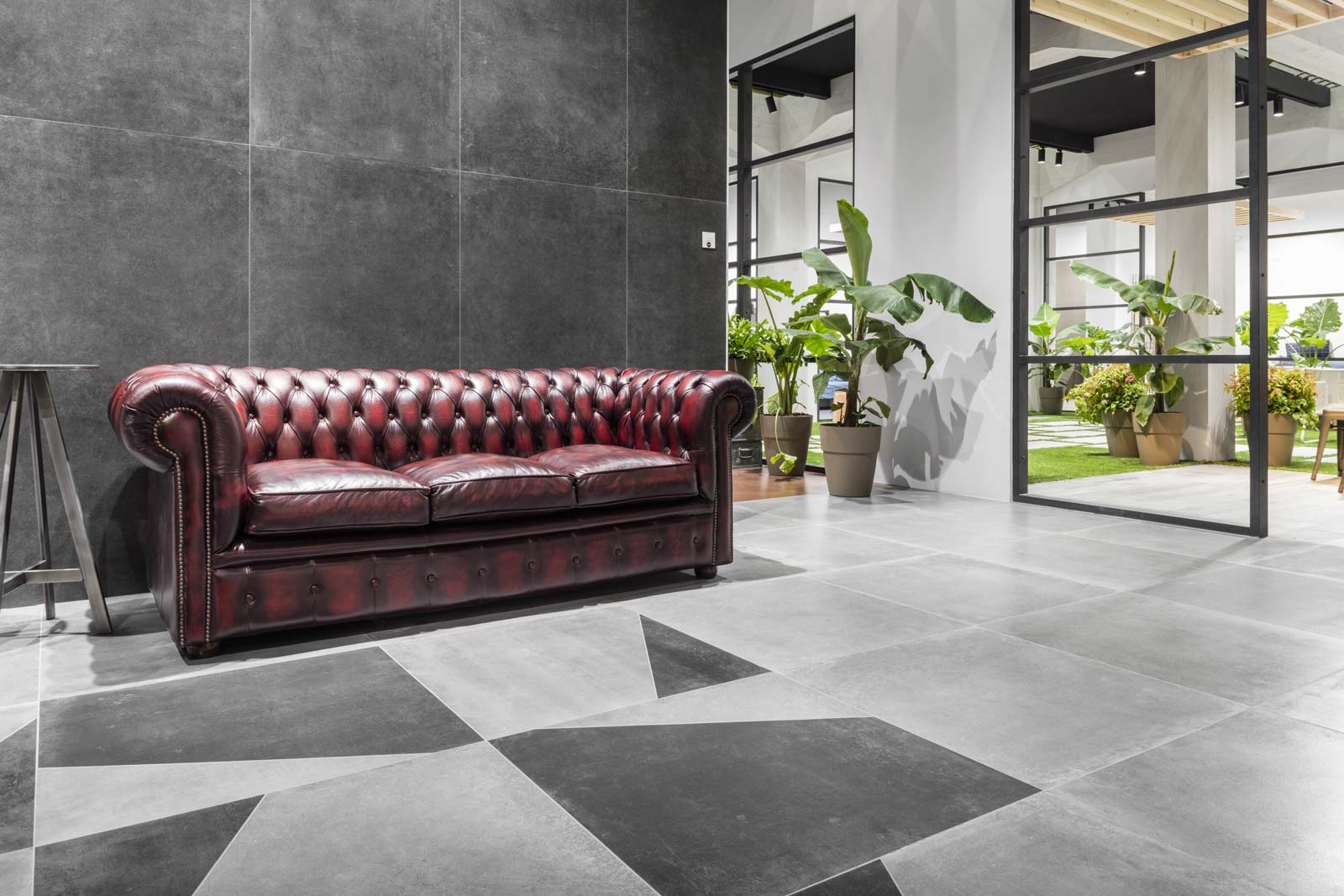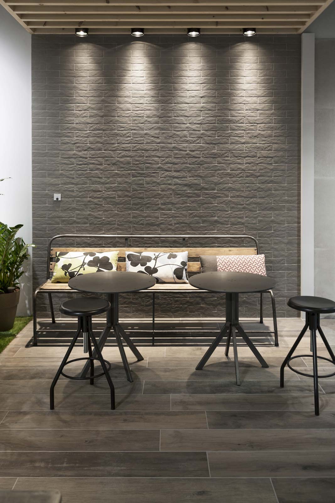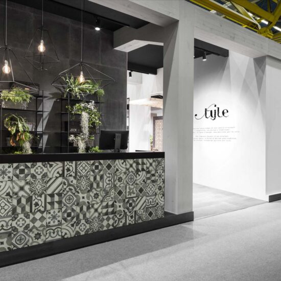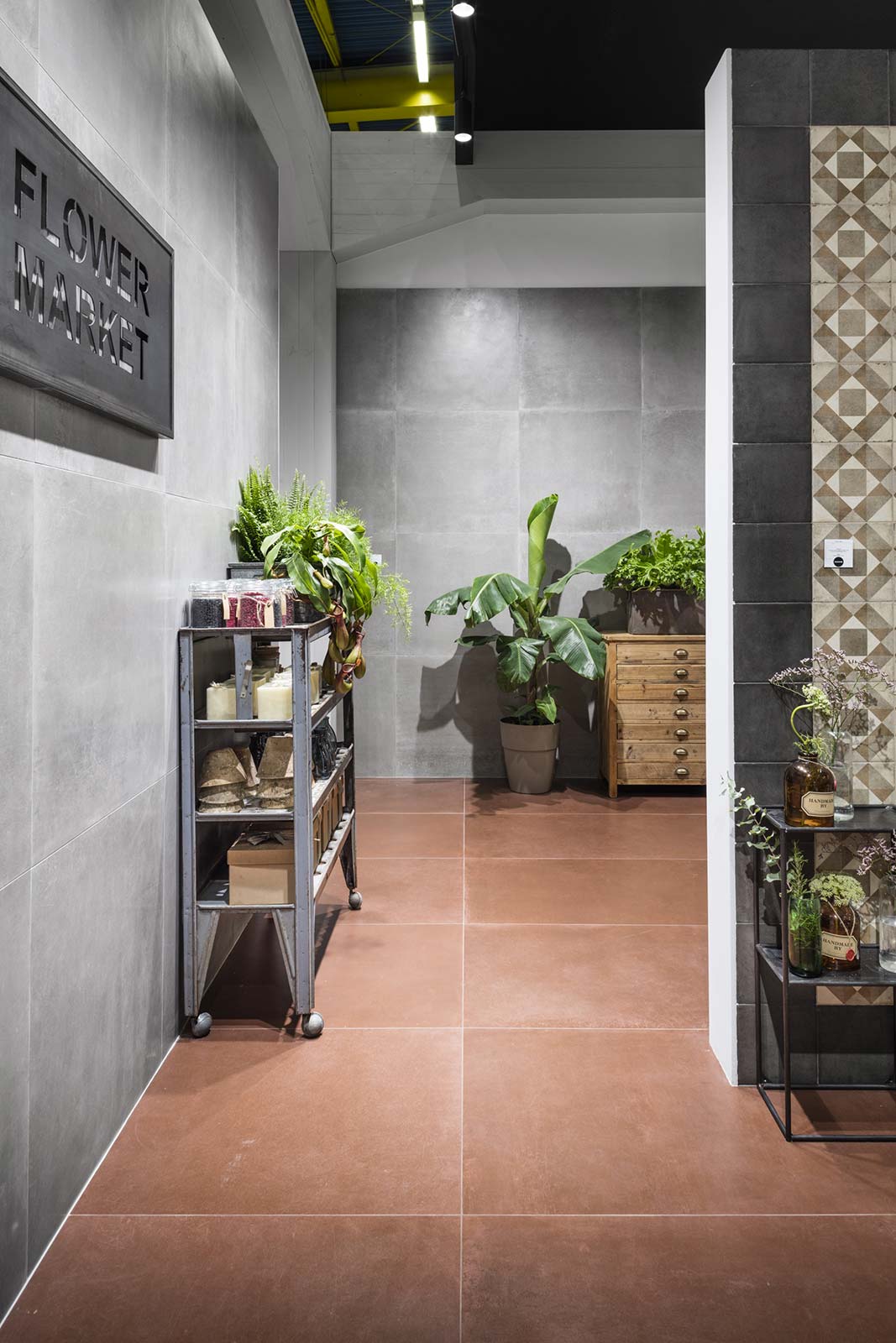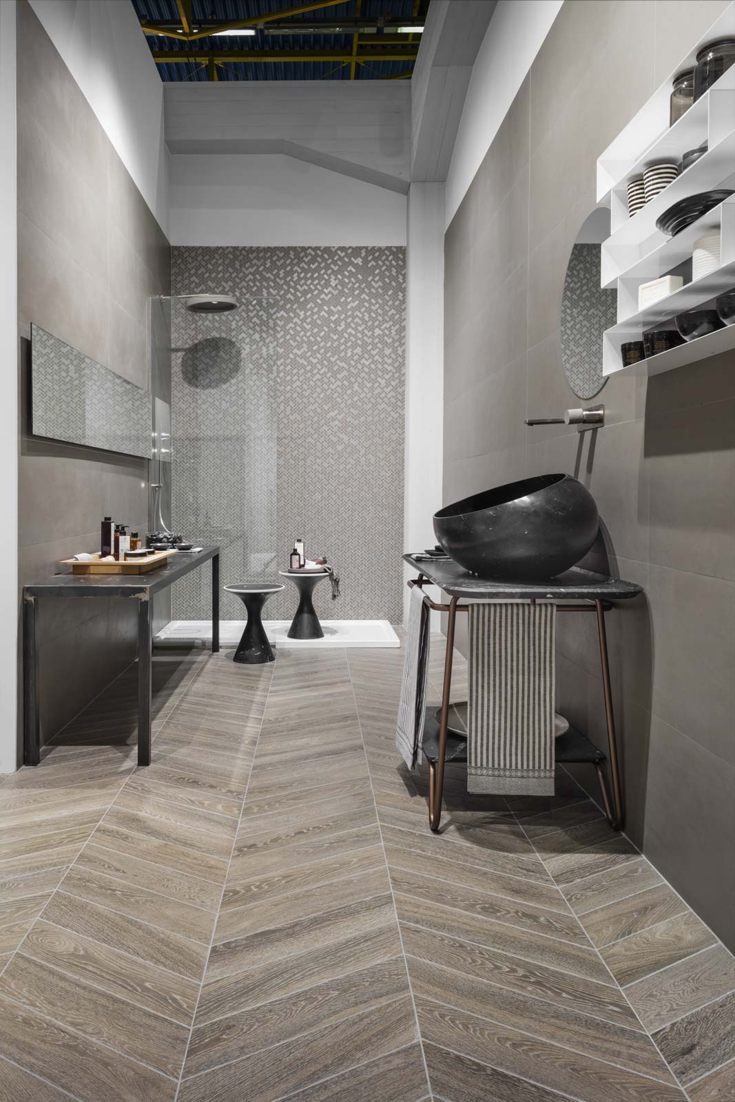 Patina: un revestimiento de gres de efecto encerado para paredes y pavimentos cuyo aspecto no encuentra términos de parangón en materias existentes. Su acabado recuerda en unas partes el cotto desgastado por el tiempo y en otras una superficie metálica. Tornasolado y cálido al mismo tiempo, se halla disponible en distintos formatos (todos ellos de grandes dimensiones) y se ha utilizado en una amplia área de los pavimentos del stand, en varios colores resueltos, remarcando su carácter acogedor y distendido.