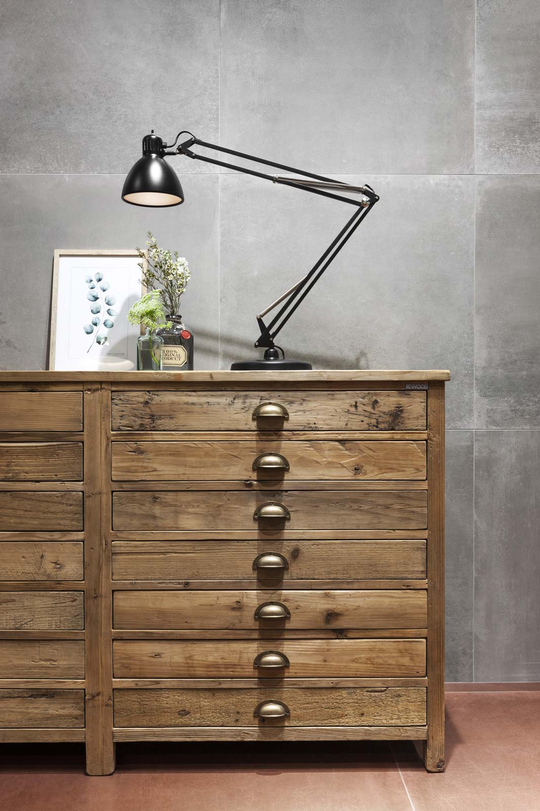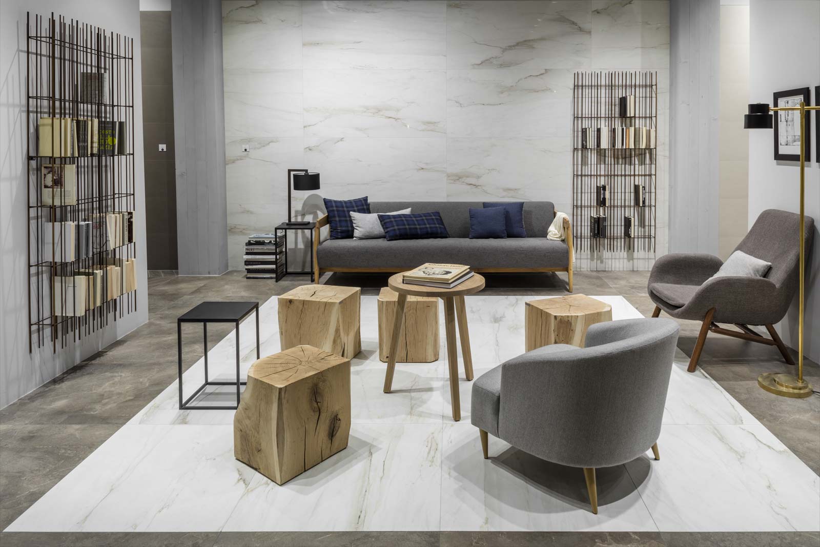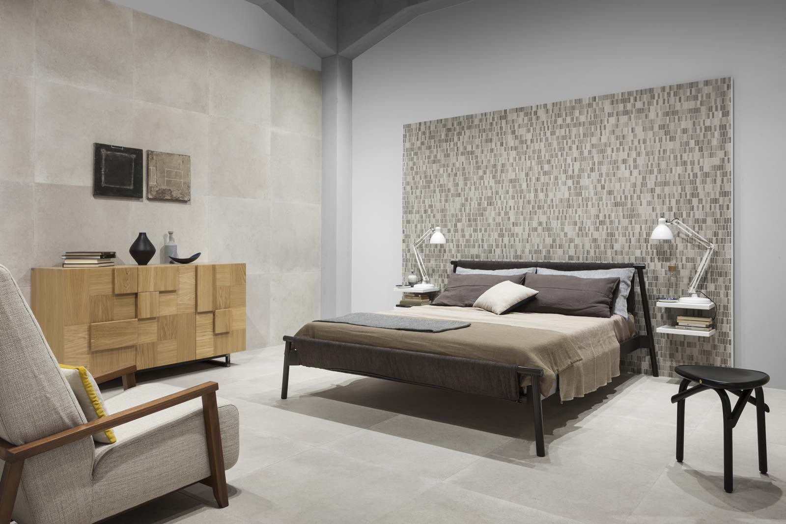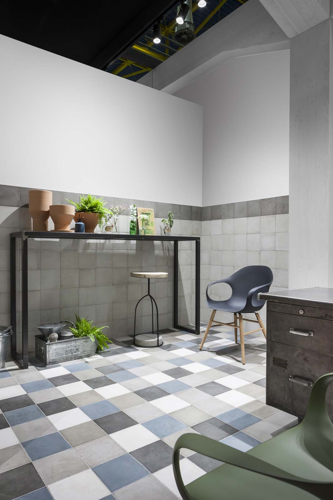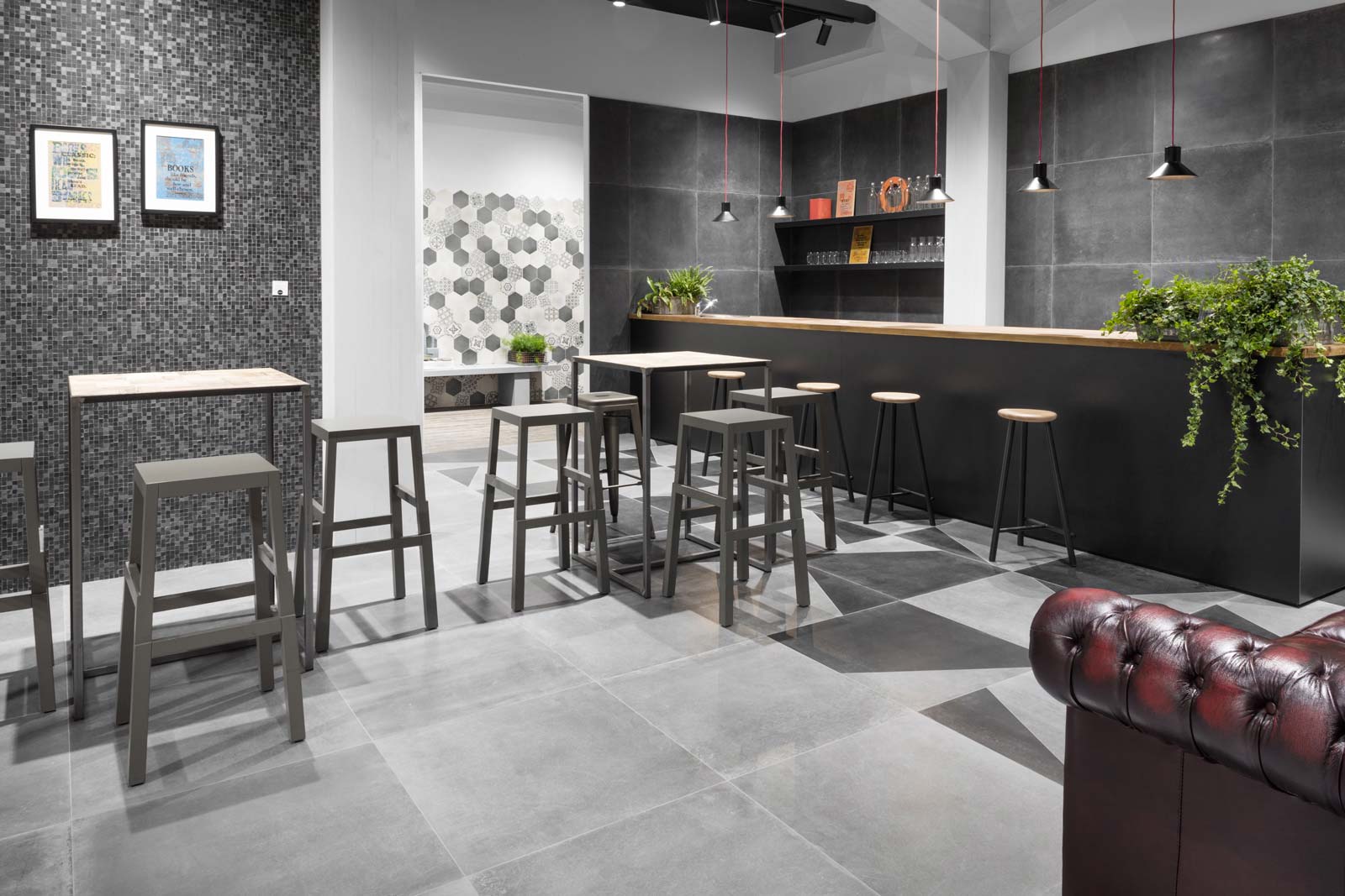 Patina: un revestimiento de gres de efecto encerado para paredes y pavimentos cuyo aspecto no encuentra términos de parangón en materias existentes. Su acabado recuerda en unas partes el cotto desgastado por el tiempo y en otras una superficie metálica. Tornasolado y cálido al mismo tiempo, se halla disponible en distintos formatos (todos ellos de grandes dimensiones) y se ha utilizado en una amplia área de los pavimentos del stand, en varios colores resueltos, remarcando su carácter acogedor y distendido.