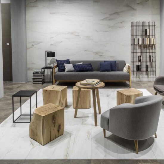 Ritual: es una piedra reinterpretada en cerámica y presentada en tonalidades claras y relajantes, surcada por decoraciones que recuerdan los efectos de la elaboración manual mediante cincel; el único formato grande disponible (de 32,5 x 97,7 cm) pone de relieve de modo espléndido el carácter matérico de la colección.
