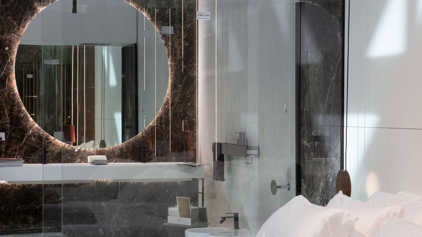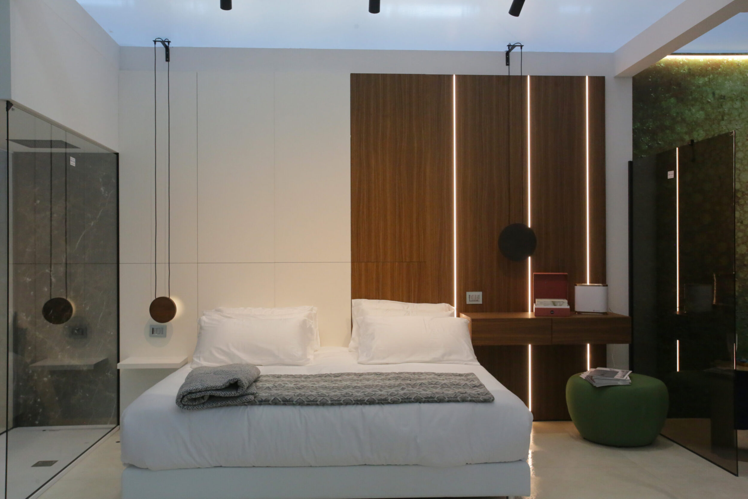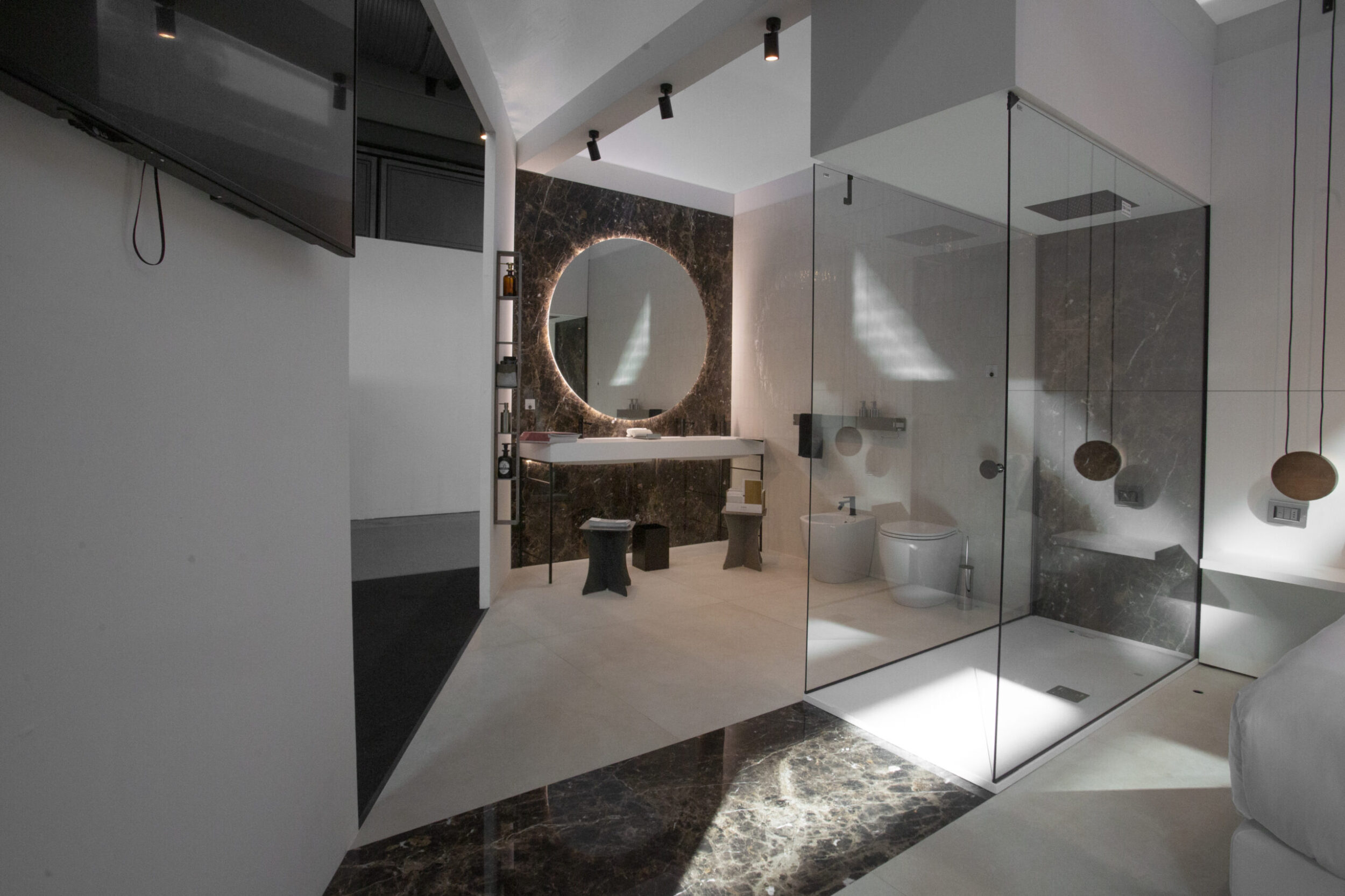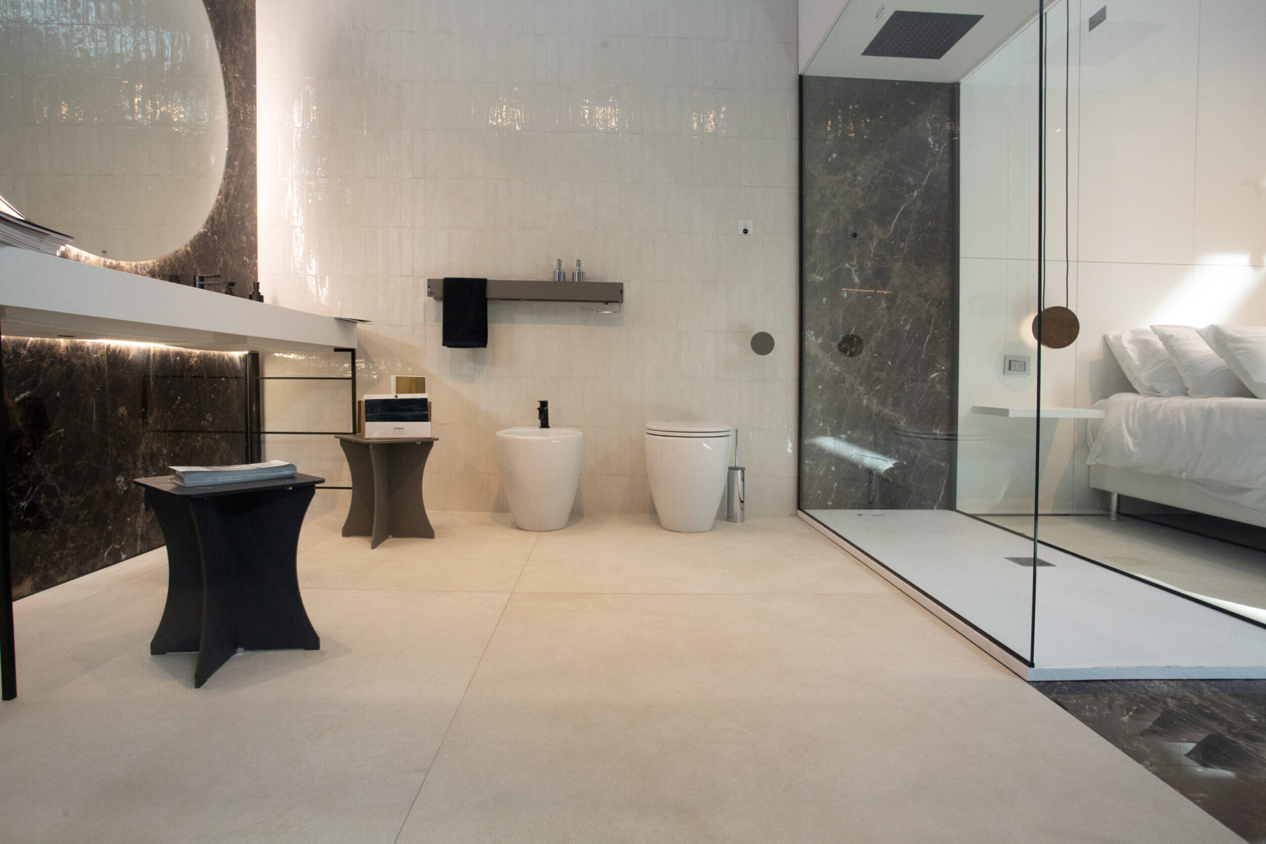 “Hotel in motion” es el espacio expositivo versátil dedicado al mundo de las estructuras de alojamiento en el que las colecciones de cerámica y gres de Ragno han sido seleccionadas por Wellness 7.0, una red de profesionales y asesores especializados en el sector de los hoteles, el fitness y el bienestar, para revestir la welness suite de un hotel.