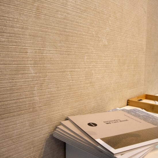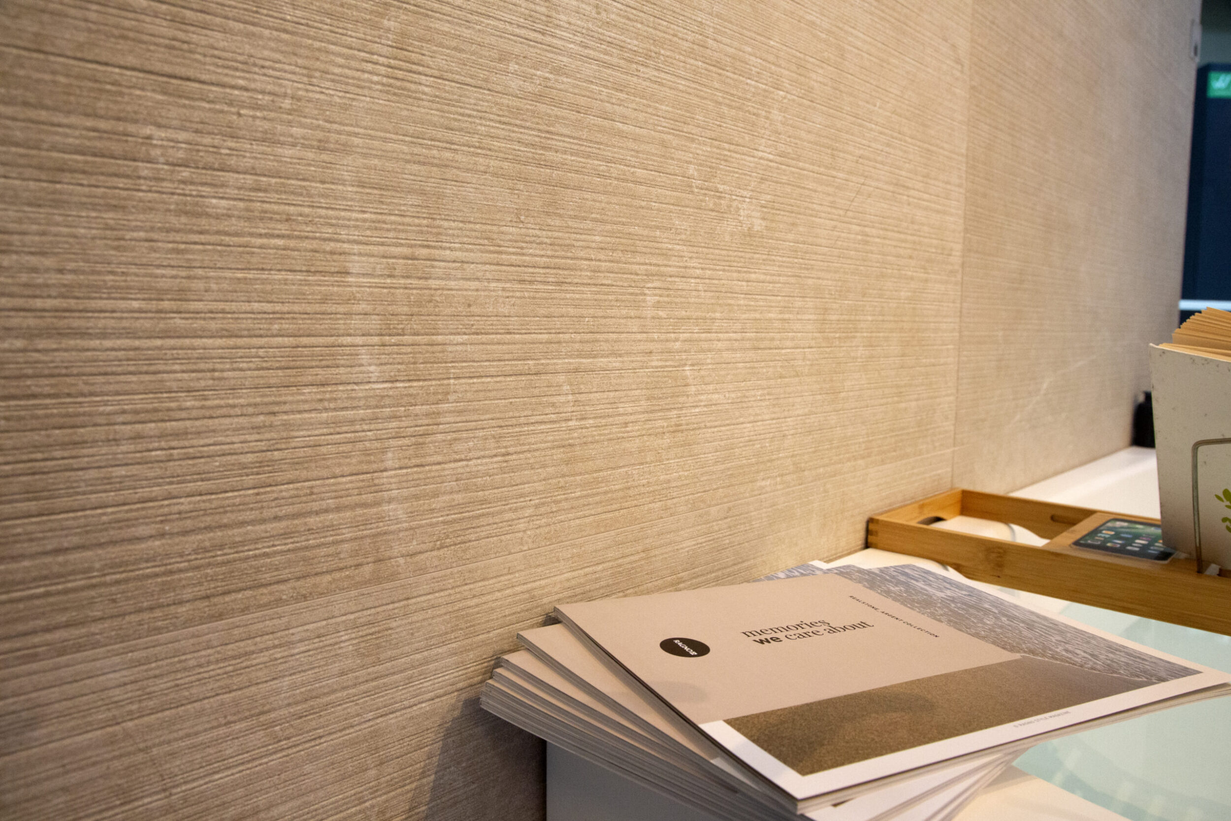 Las colecciones Richmond Silver estructura Temple 3D para pared, Richmond Silver 100 x 100 cm y Realstone_Argent Miele estructura Linee 3D revisten otras áreas de relax.