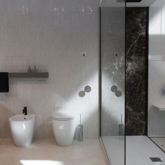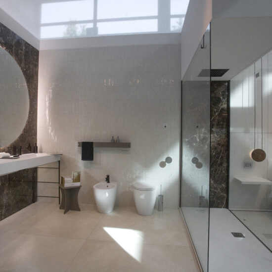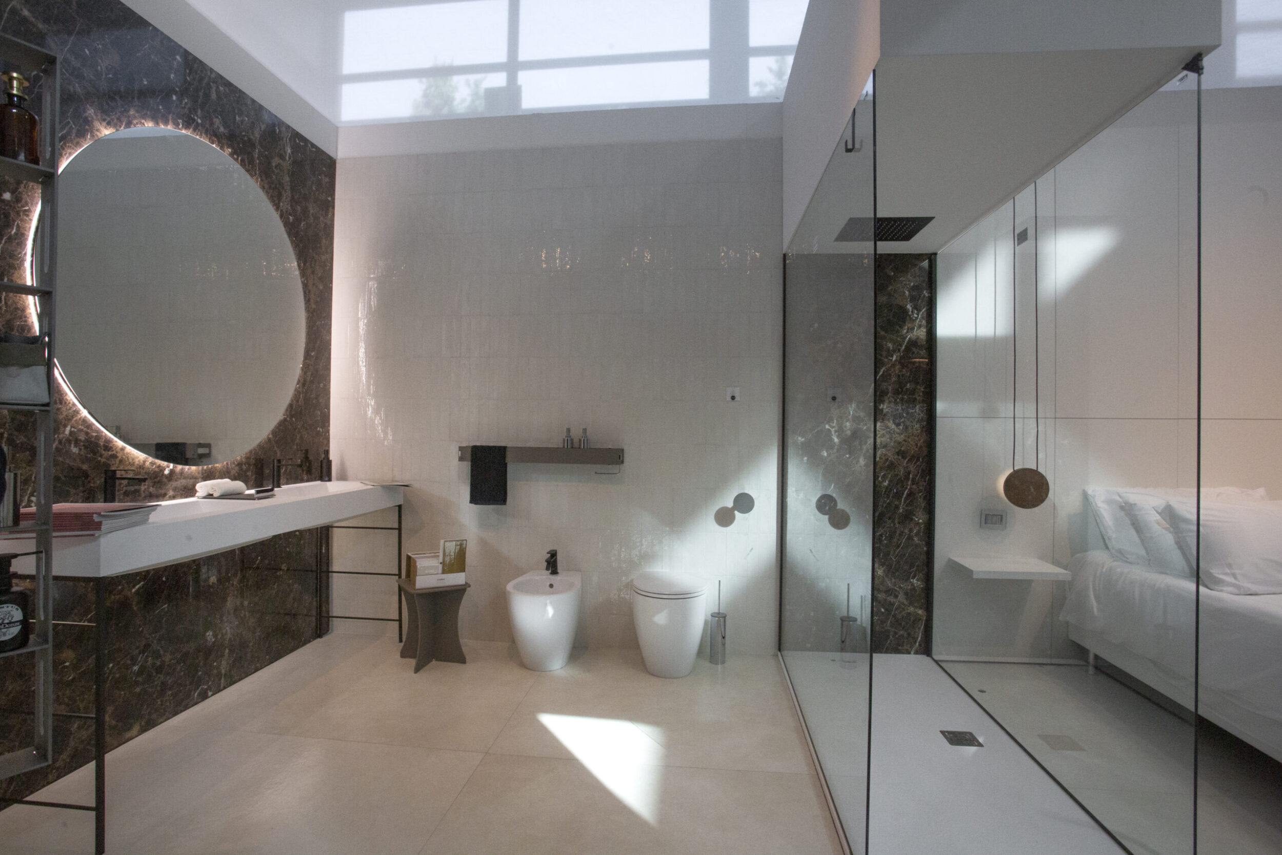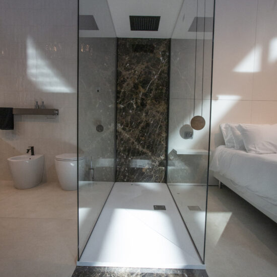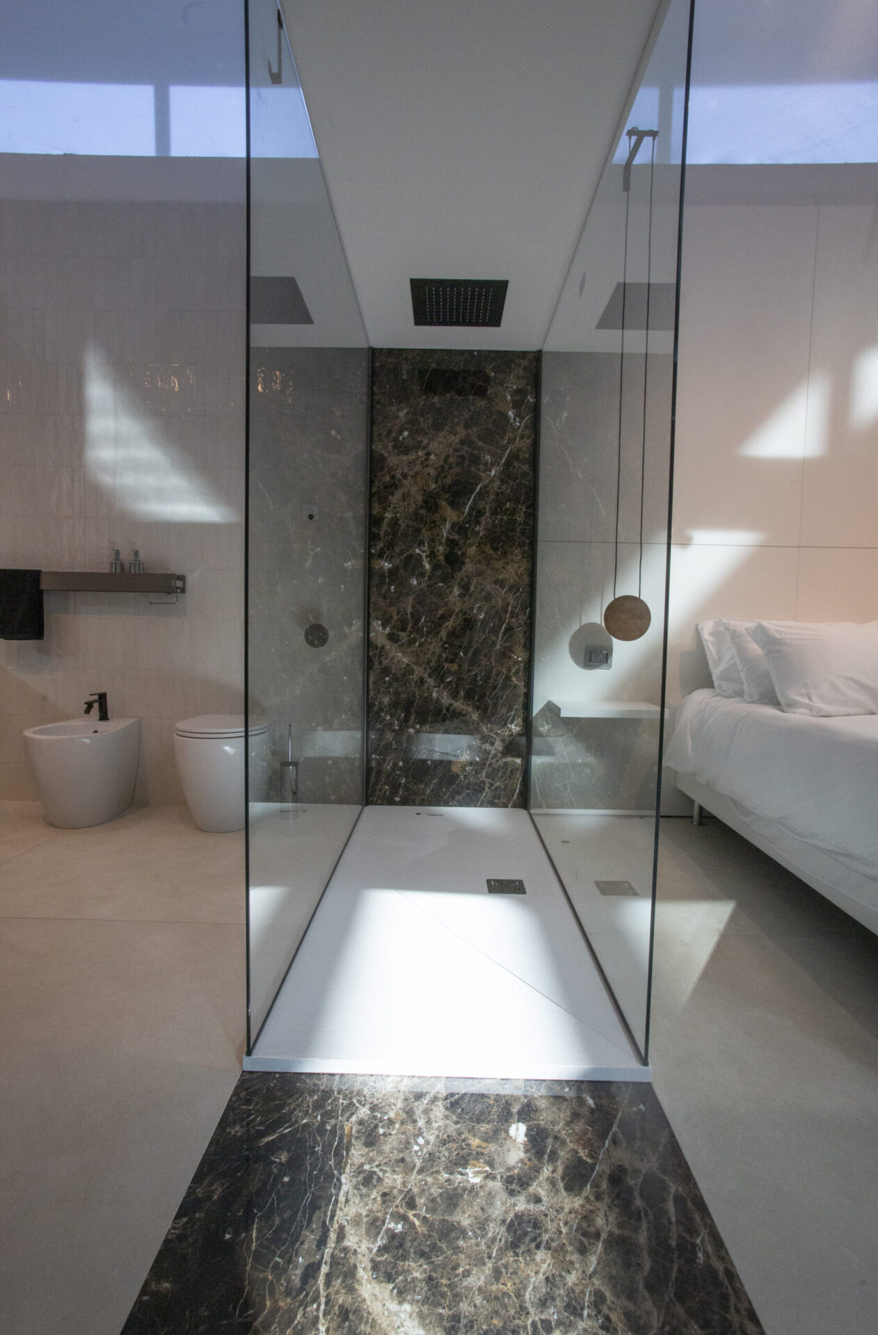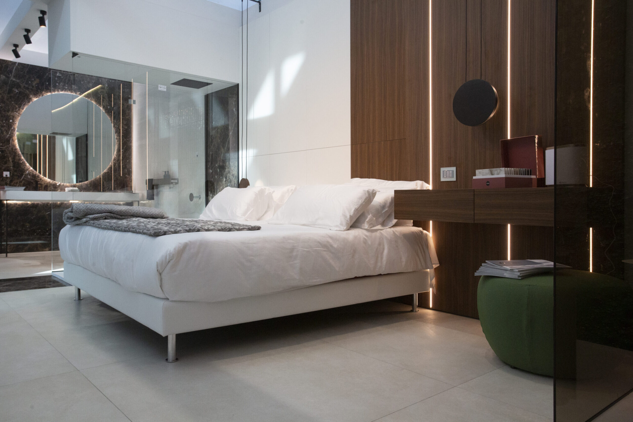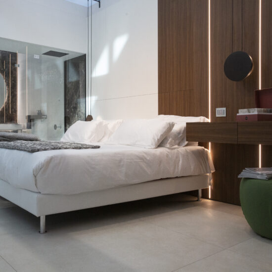 Para el pavimento del dormitorio de la wellness suite la arquitecta Palucci ha elegido el gres porcelánico de imitación del cemento Stratford White, en el formato de 120 x 120 cm, mientras que para revestir las paredes del baño hallamos un mix & match entre el formato pequeño de la colección Look Bianco en el formato de 6 x 24 cm y las placas grandes de gres porcelánico de imitación del mármol de la colección Incanto, en la variante Emperador Glossy de 120 x 278 cm.