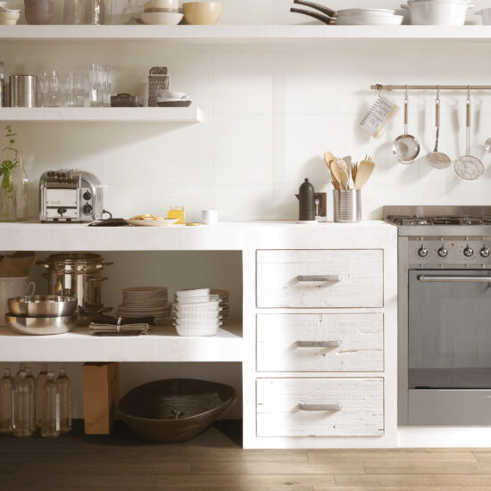 Así, el blanco de Ragno se articula en distintas propuestas de gres porcelánico y de cerámica, cada una de ellas reconocible por unas características de tamaño y de textura determinadas. La primera opción para los amantes del estilo minimalista está constituida por la colección Off, presentada en la versión de blanco total y en el formato de 30 x 90 cm rectificado.