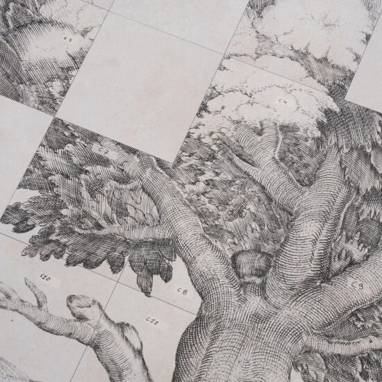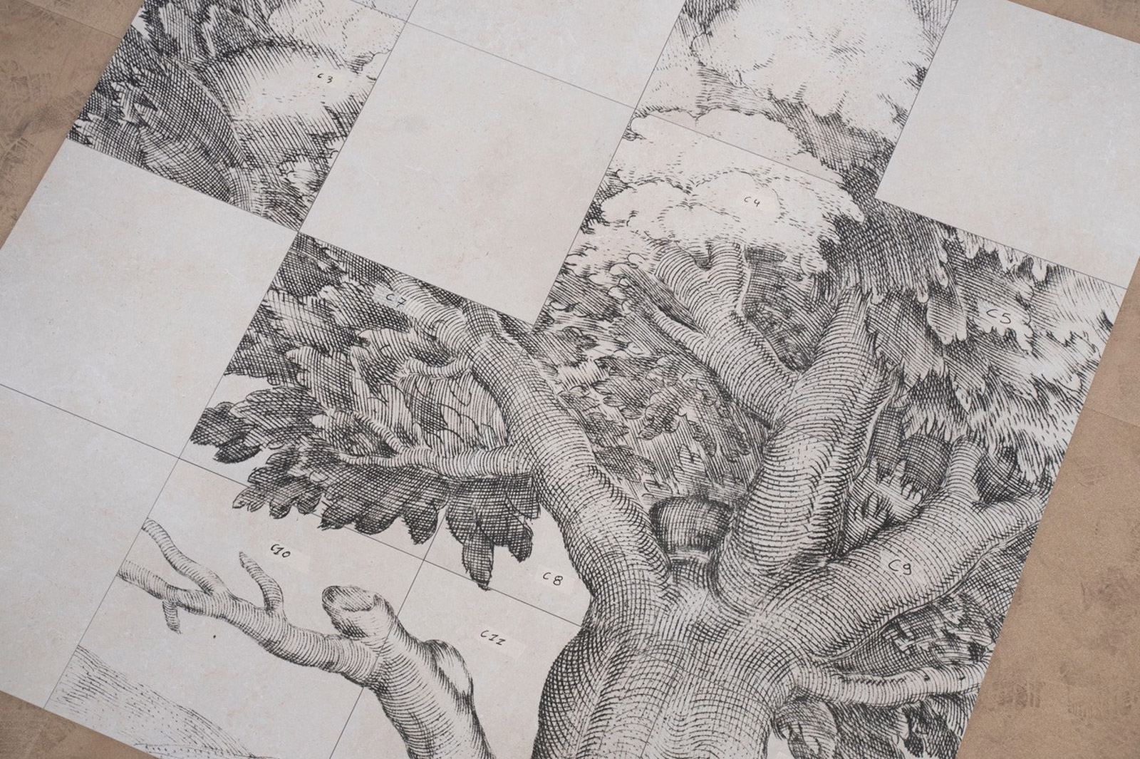 El artista ha utilizado la cerámica come un lienzo blanco sobre el que ha dibujado elementos naturales que dialogan con las figuras de la obra de Tintoretto. Unas 60 decoraciones sobre azulejos de formato cuadrado, todas distintas, conforman un hermoso mosaico artístico. El resultado es un espacio circular pensado por Starling para sumergir al visitante en un ambiente por recorrer y en el que admirar la obra maestra de Tintoretto suspendida en el techo.